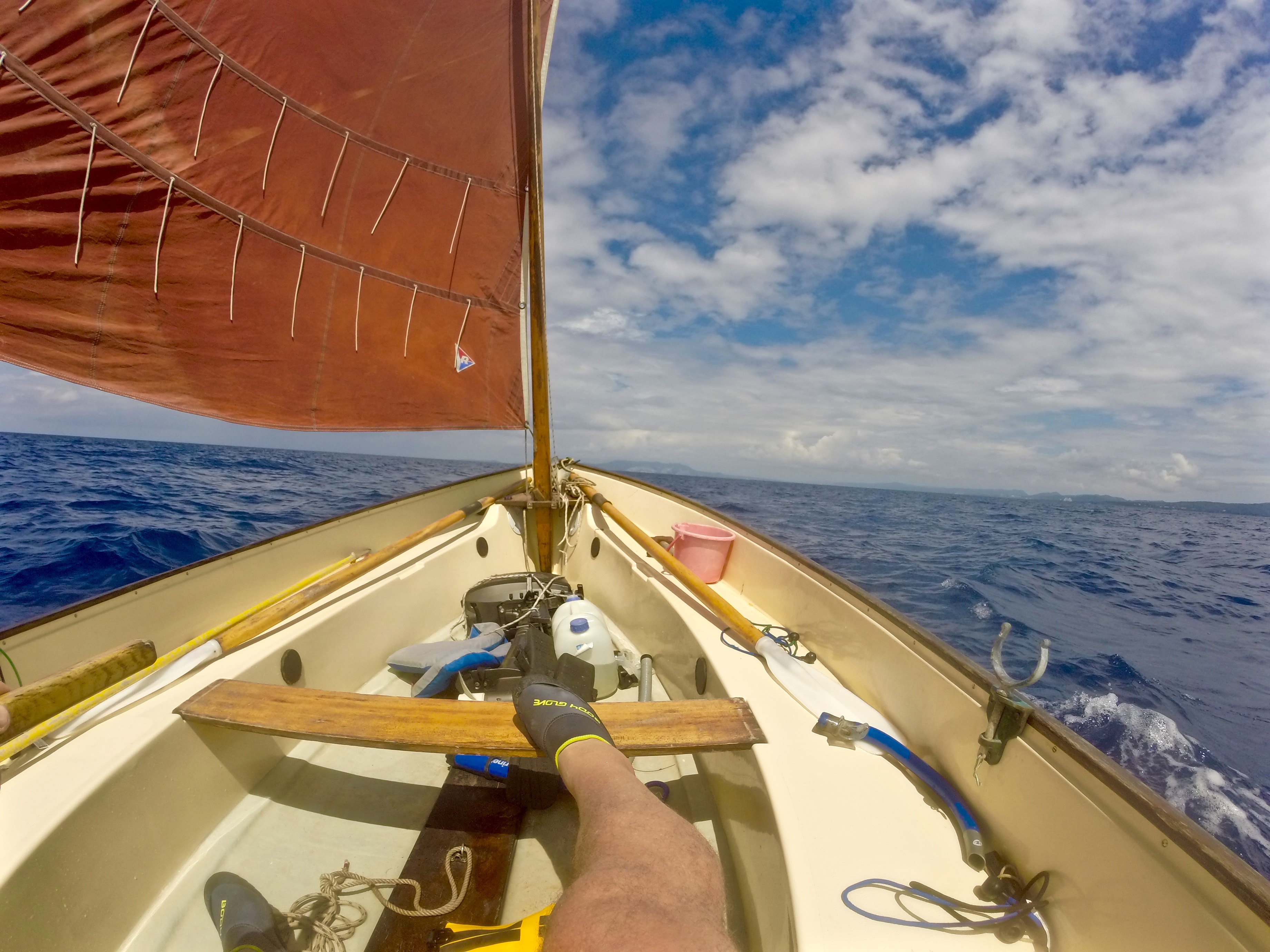 I sail the mighty Scaffie up the coast. As usual, this starts as a little excursion to potter around the lagoon some and then come home. However, happiness in high concentration breaks through and I keep going. I race past Cape Maeda and set off for Motobu. The wind is fresh, which the Scaffie likes. She is a strong person and is at her best when there is a little bit of a challenge.