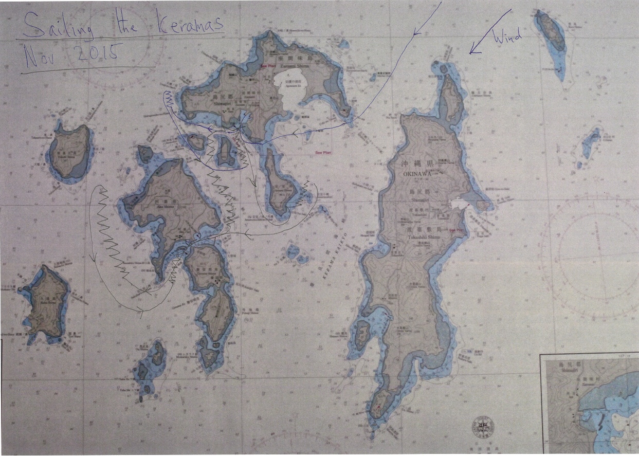We try to beat up the sound between our island and Tokashiki but get bored with all the bashing against pretty determined waves coming in the other direction.