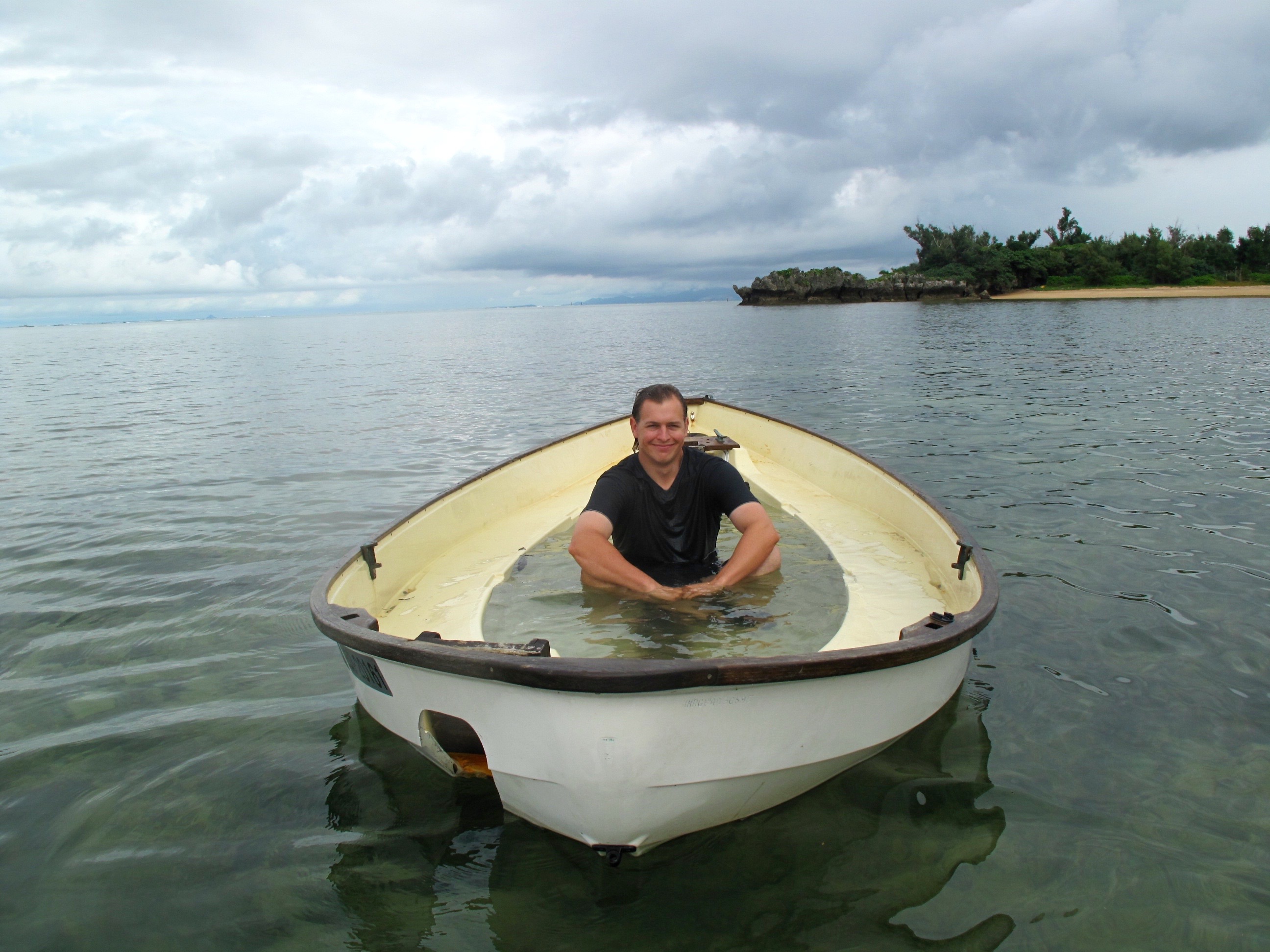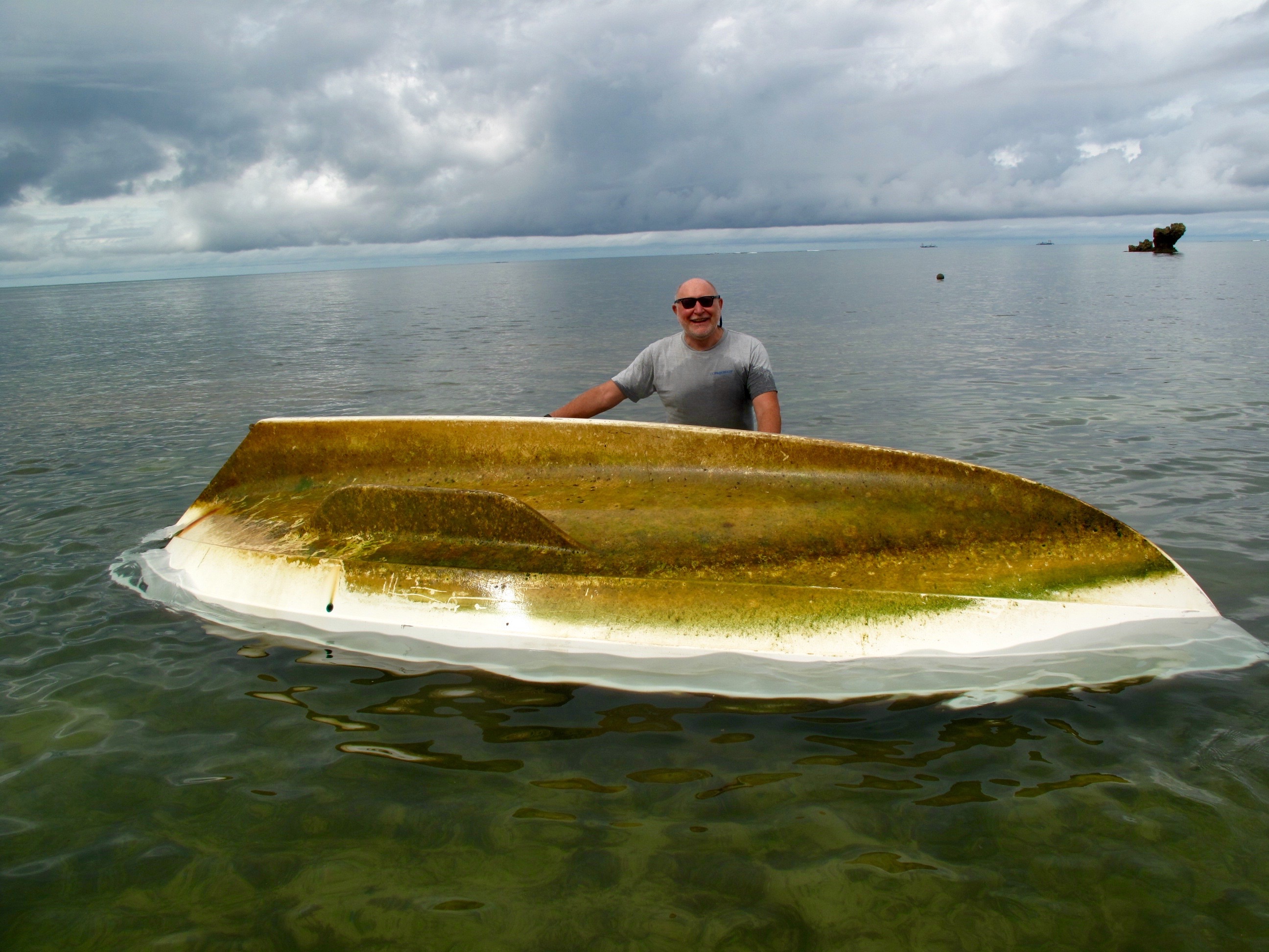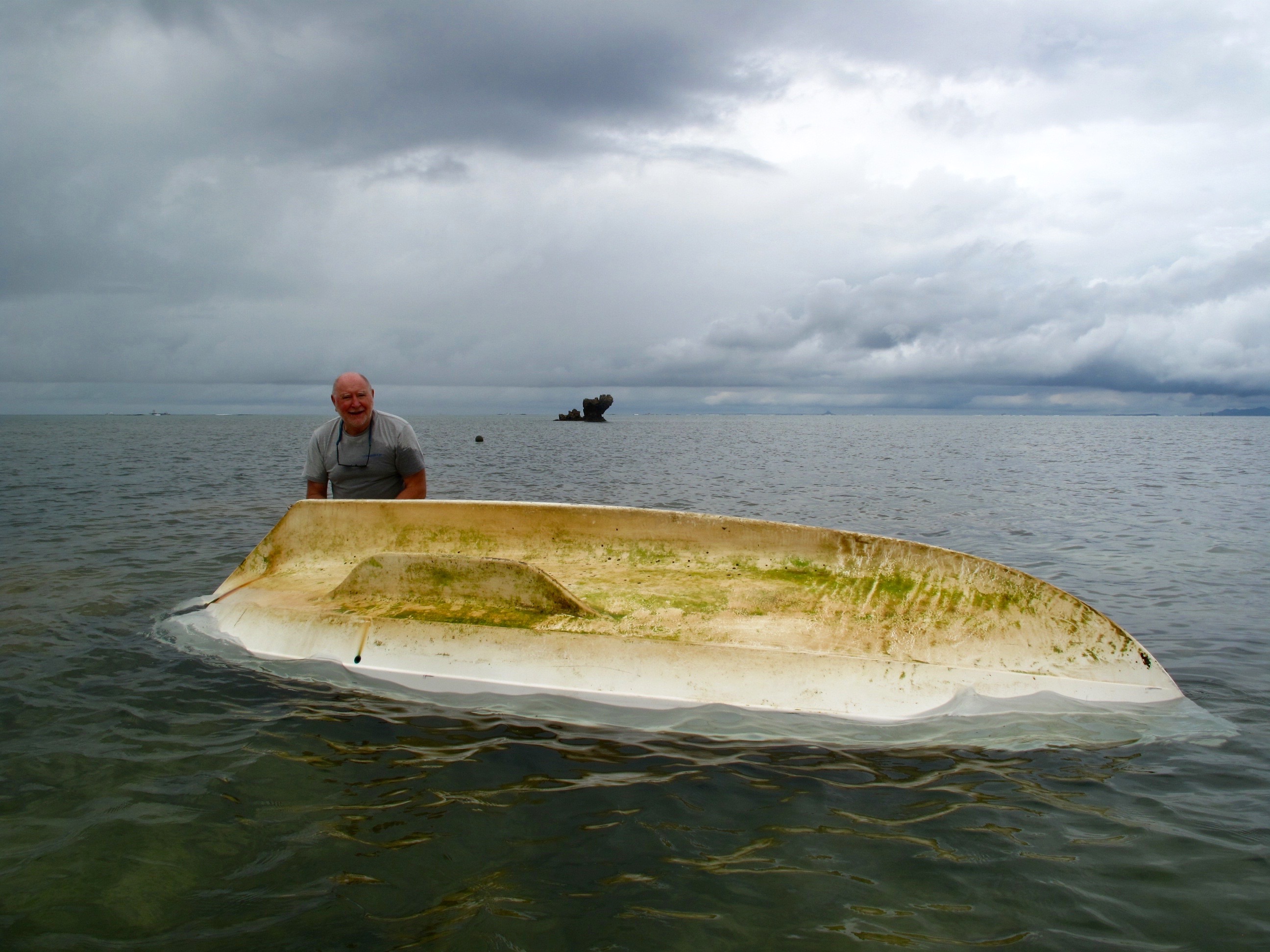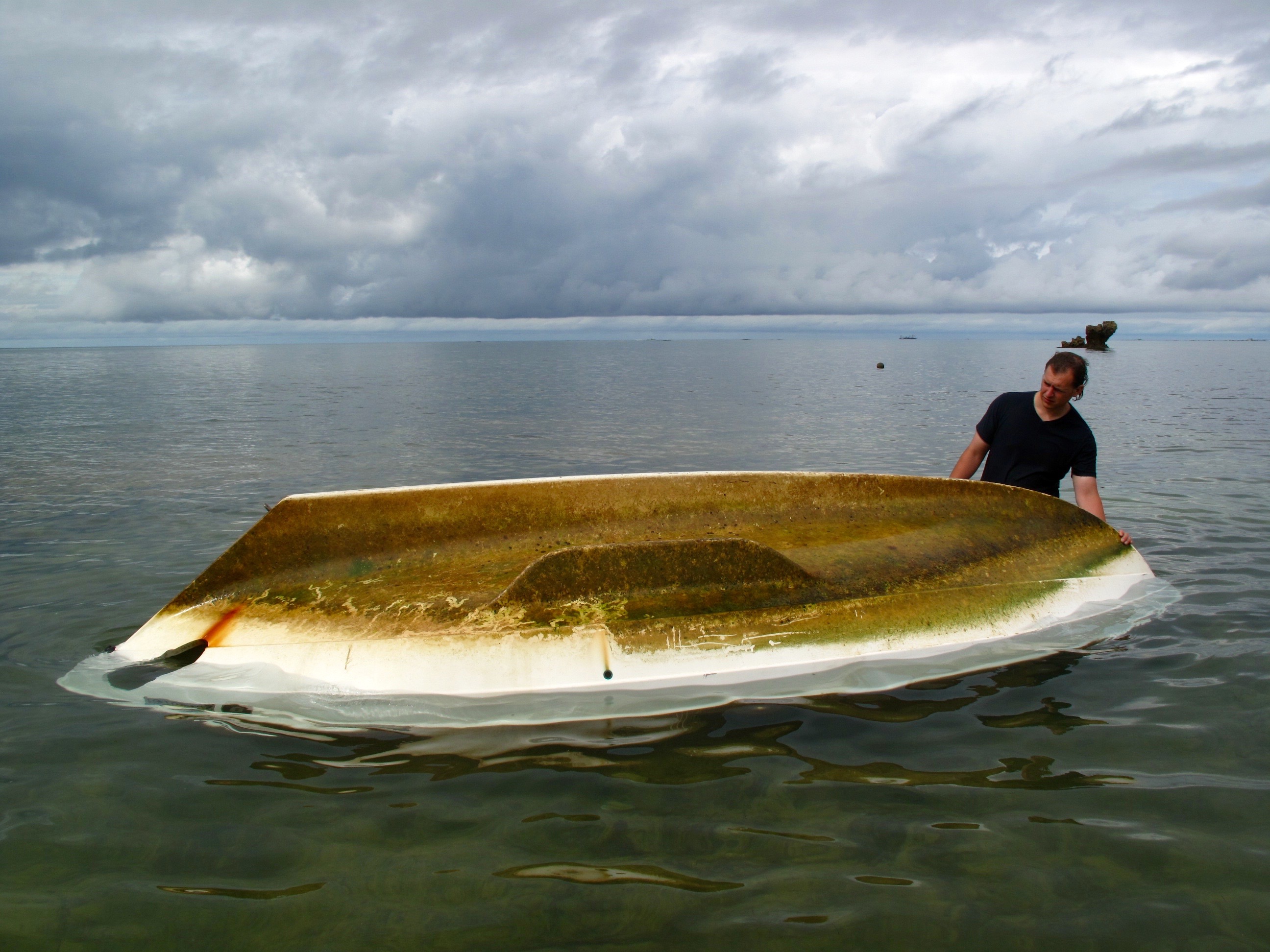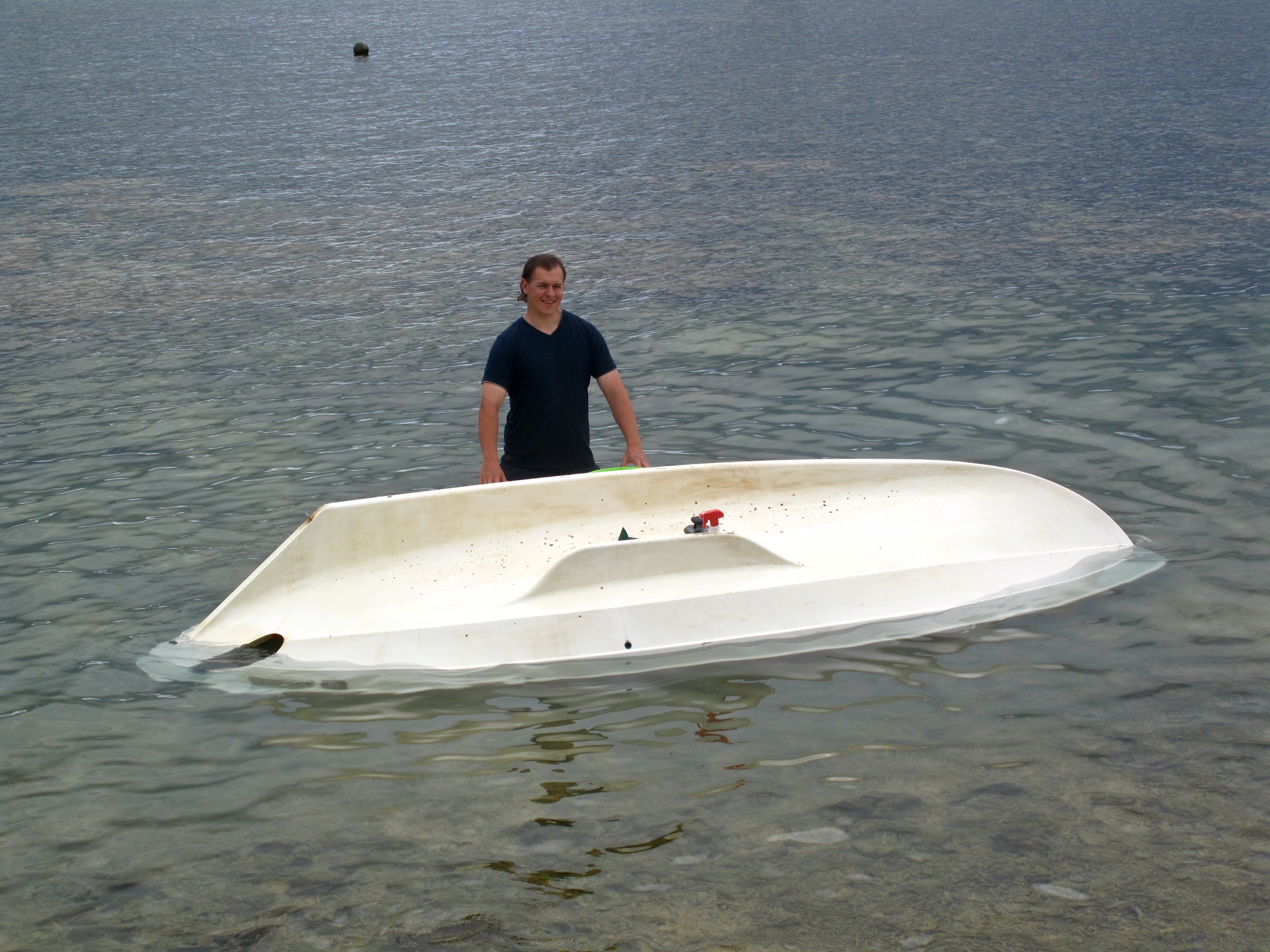 Ben and I try to capsize her to get at her bottom. This is reassuringly difficult to do. We manage to fill her with water and Ben sits in her but she will not sink. Yay Scaffie!