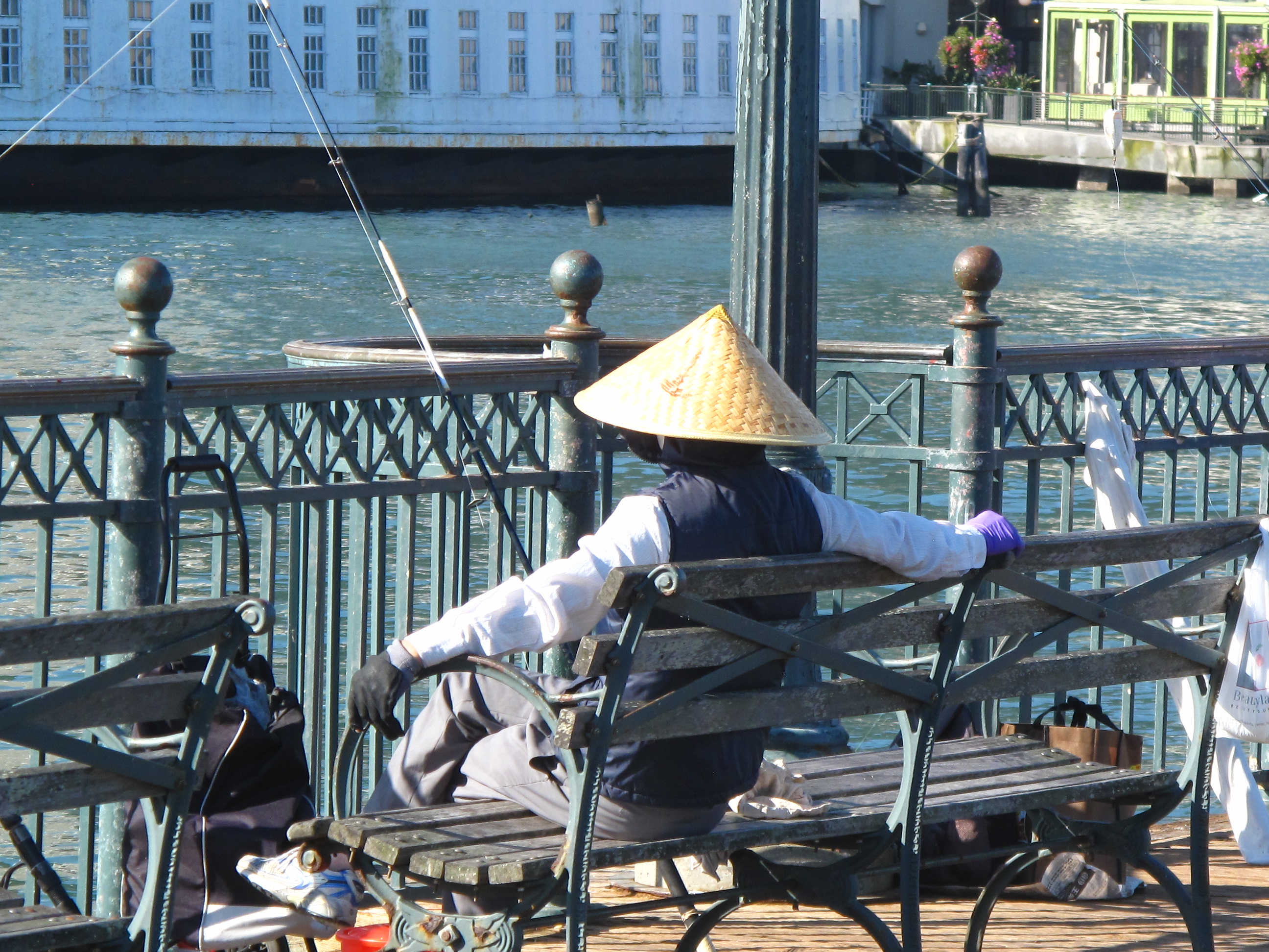Whistling through the streets of San Francisco on Ben’s bike early in the morning is truly envigorating. It is a very beautiful morning and of course it is the 20th of April – 4/20. 420 is hippy code for weed as that is the time they got out of school to start an afternoon of doobies. Today thus is international pot day. However that is not why I am back in SF. I have to have my biometrics done to get a document that officially allows me to be out of the U.S. for a 2 year period and yet retain my Green Card. The office for this kind of thing is on Broadway down close to the Bayshore. So, down the Panhandle, down Oak, take a left onto Page. Then downhill all the way to Market. It is super exhilarating. On Market, I join a pack of hard core bikers and we swoop and dodge our way down to the Embarcadero. Now I cruise past the Ferry Building, the Exploratorium, as the sea gets bluer and the sky follows suit. I am early so I spend some time watching old Chinese guys catching Mackerel off the pier at the end of Broadway.