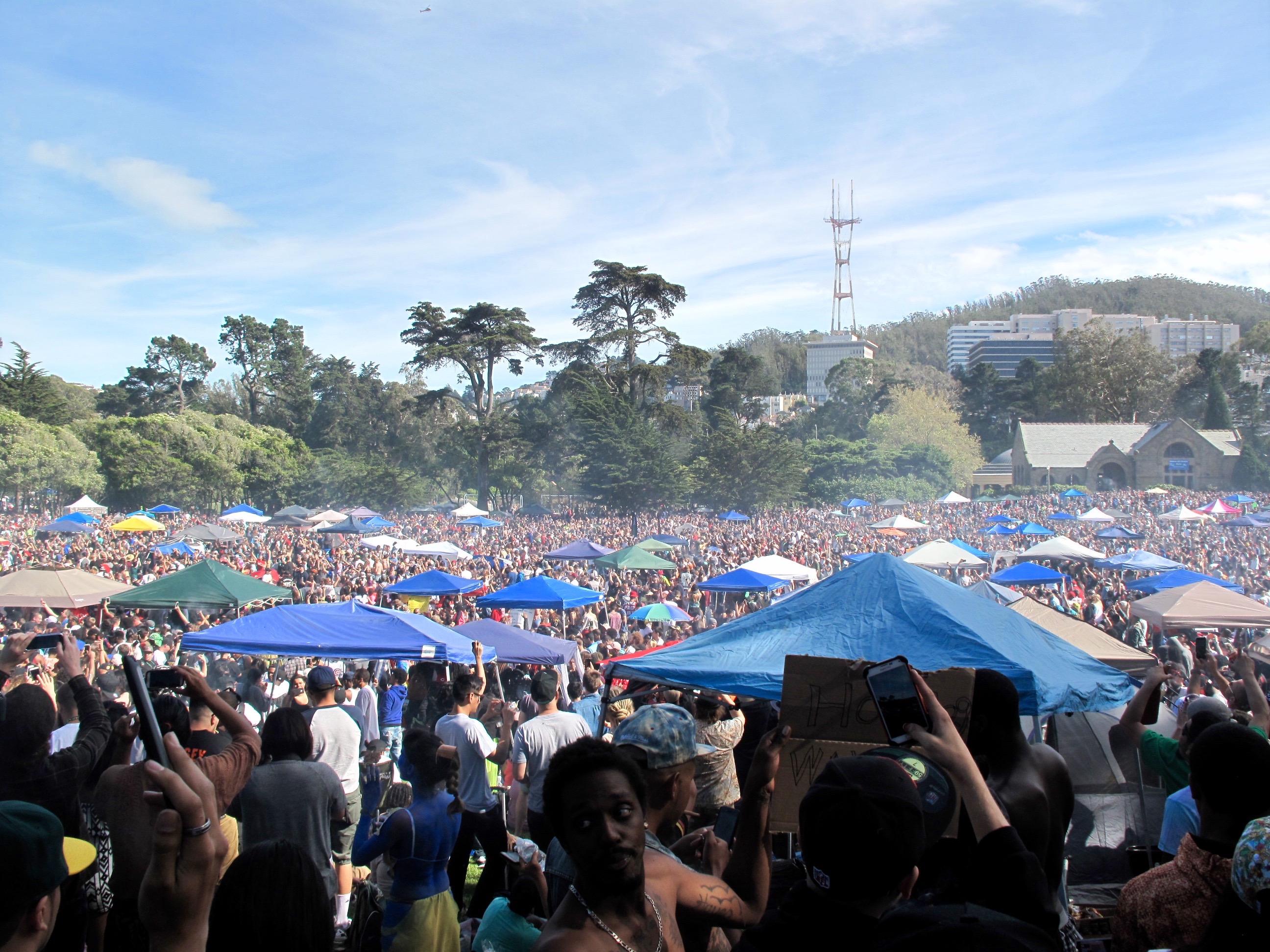 Anyway by the time I get home the streets are thronged with people going to the Golden Gate Park to celebrate 4/20. I make my way to Hippy Hill the epicentre of global dope culture. Come here any time and there are dipsy hippies dancing to the inconsistent rythms of stoners bashing on tablas. It is cute. Today is not like that.