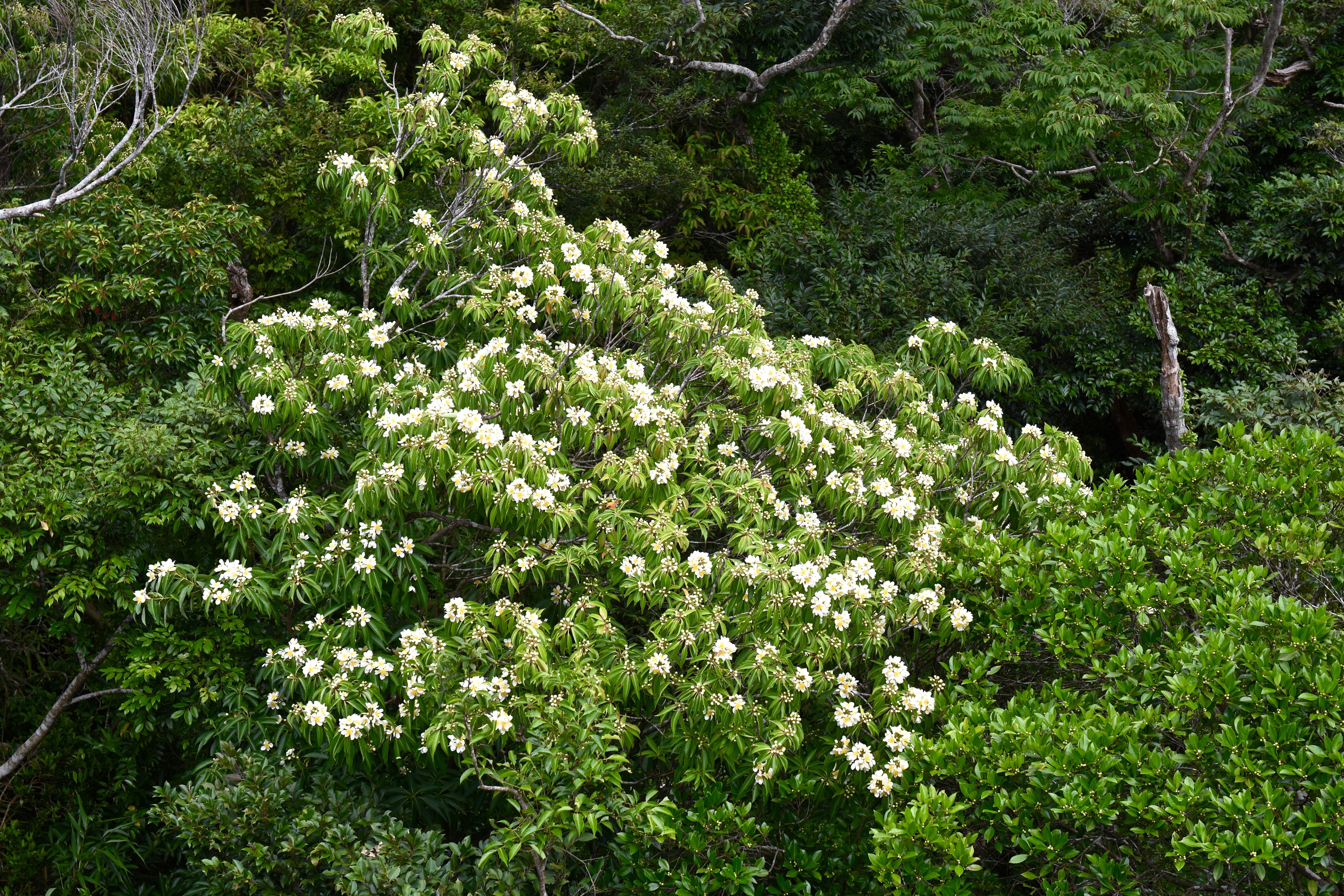 So, at this time of year the forest of Okinawa erupts. Trees that had previously generally blended into the Jurassic Park vegetation that surrounds the university are sudden covered in beautiful creamy-white blossom. Blossom? Not sure that this is this best word, as for me, blossom frets and struts its life out over a short time. Iju flowers? hang in for weeks. Anyway I love it and now pant in expectation each year. The flowers herald in the rainy season and then the Summer.