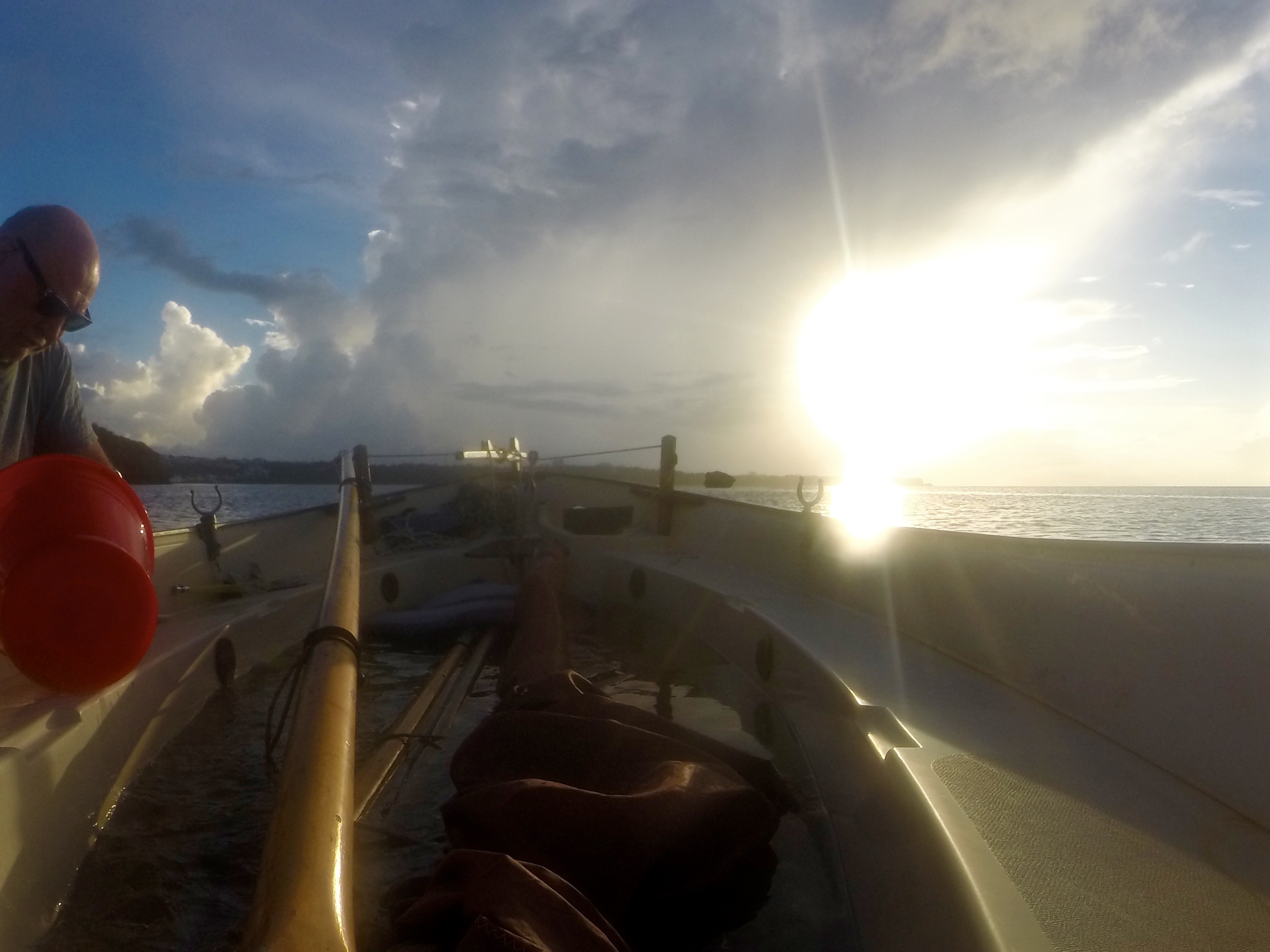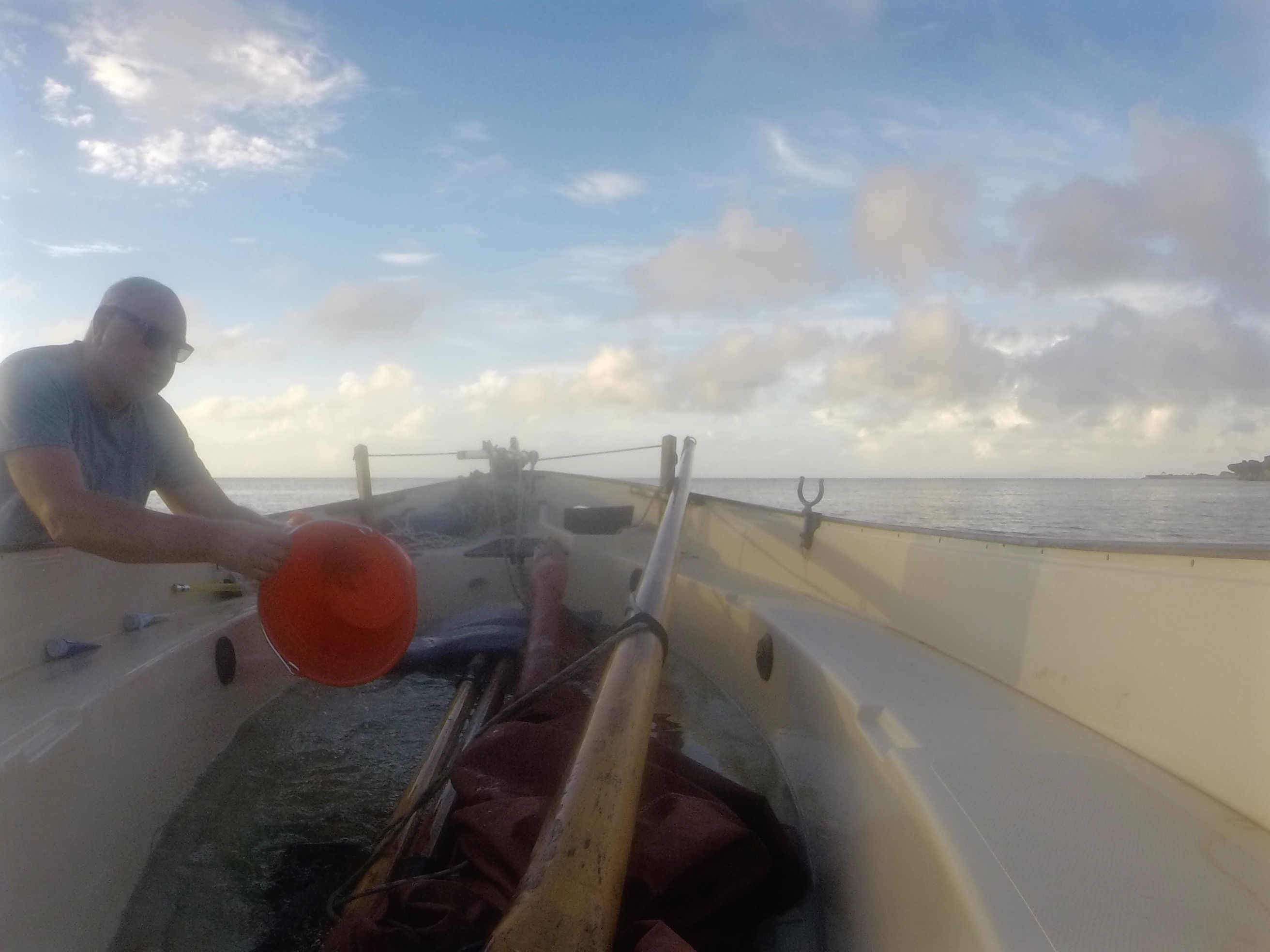 The rain fills the Scaffie with water. She becomes very heavy and I fear that she will drag her anchor or maybe rip the anchor cleat out of the thwart, if you see what I mean. I rush home from work to bail. This could mean: jump from aeroplane, leave a party in San Francisco or empty a boat of water. You decide.