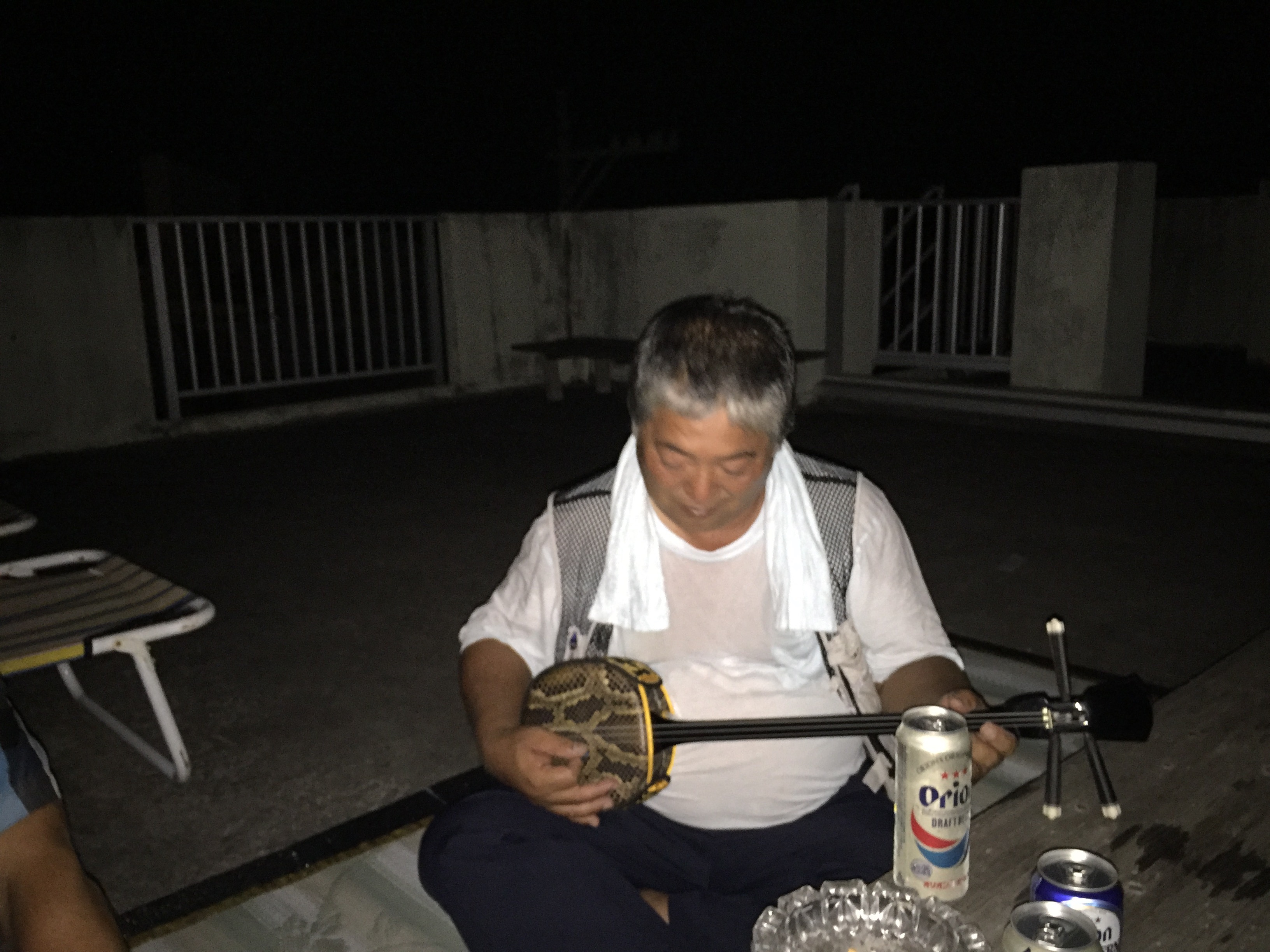 We drink awamori and Orion beer. Soon Momo san and Mami san show up with a sanshin.