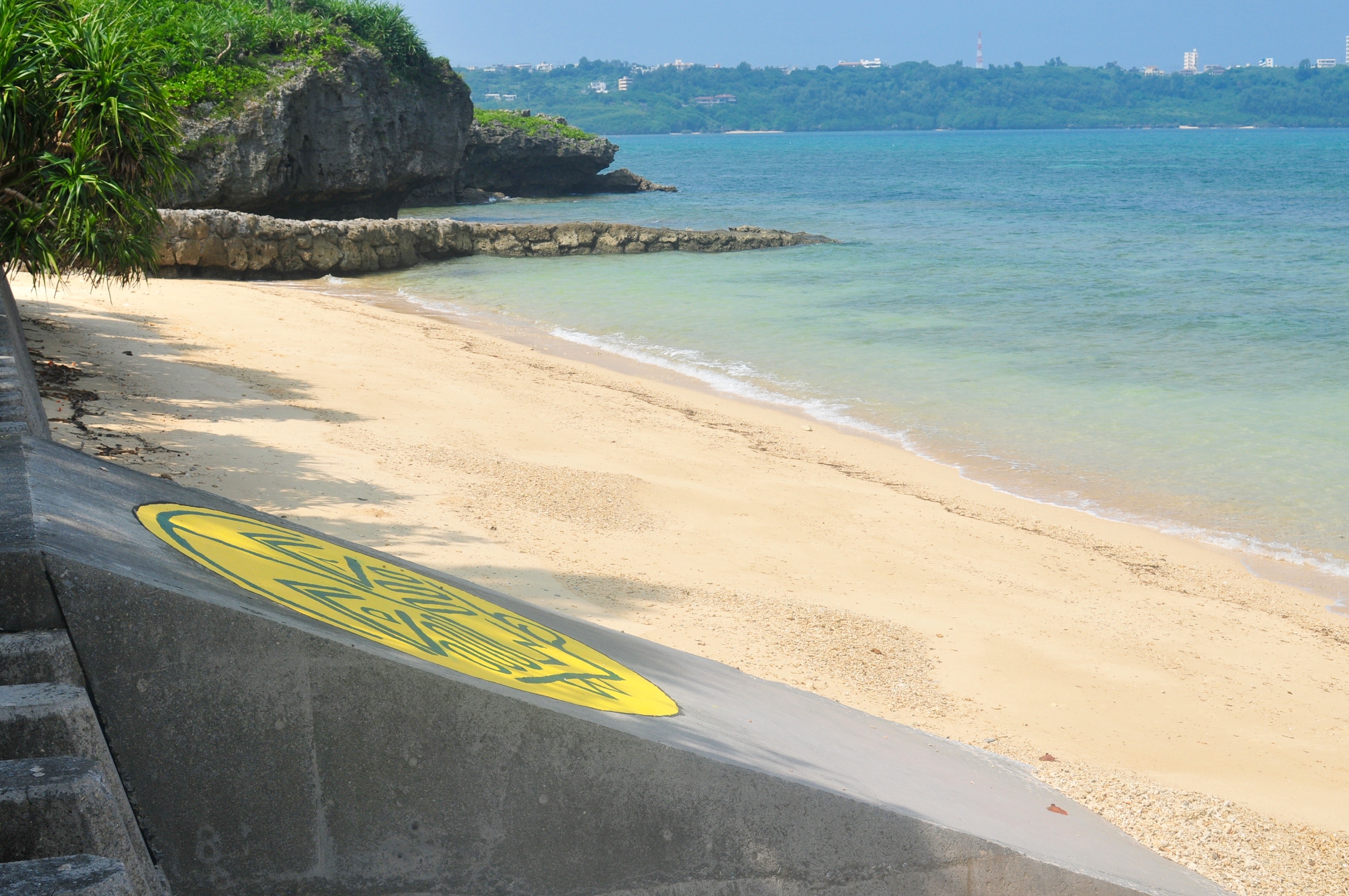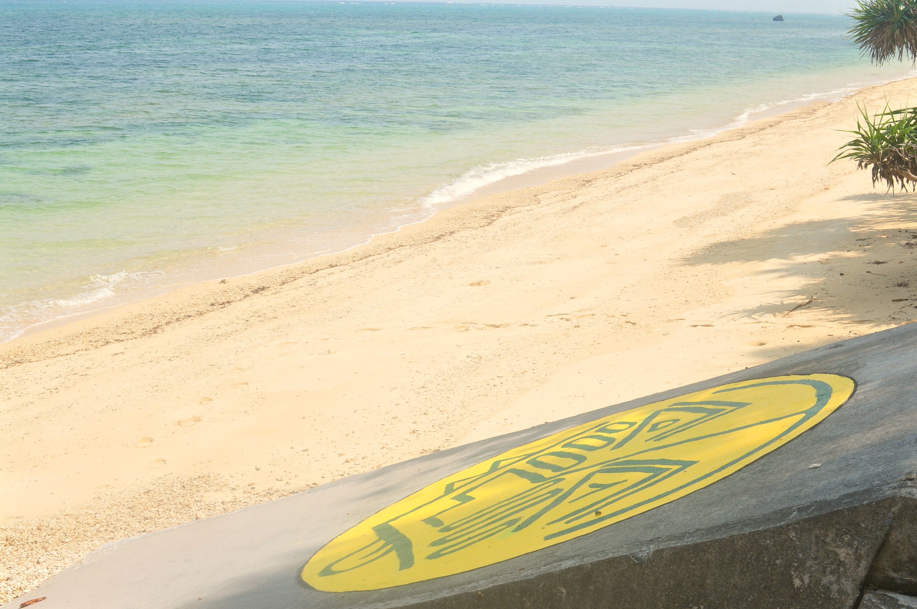 The art fits perfectly on the beach. The beach is a kilometer of white sand and sparkling blue sea. There is not a soul on it.