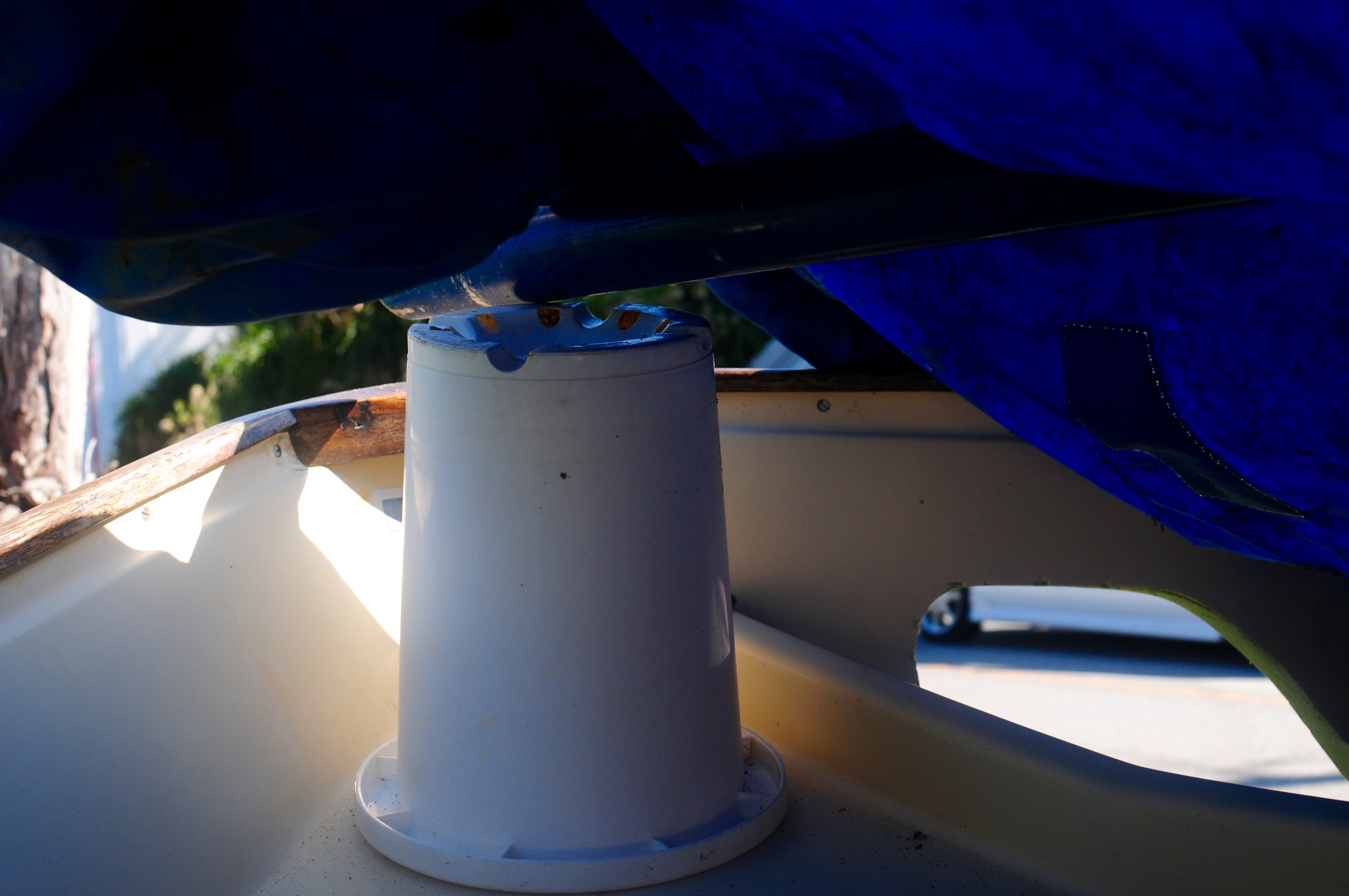 I rig a long pole supported by plant pots judicially placed inside the Scaffie. This creates a tent effect, hopefully forcing rainwater to run off rather than pooling depressingly in the the concave cover.