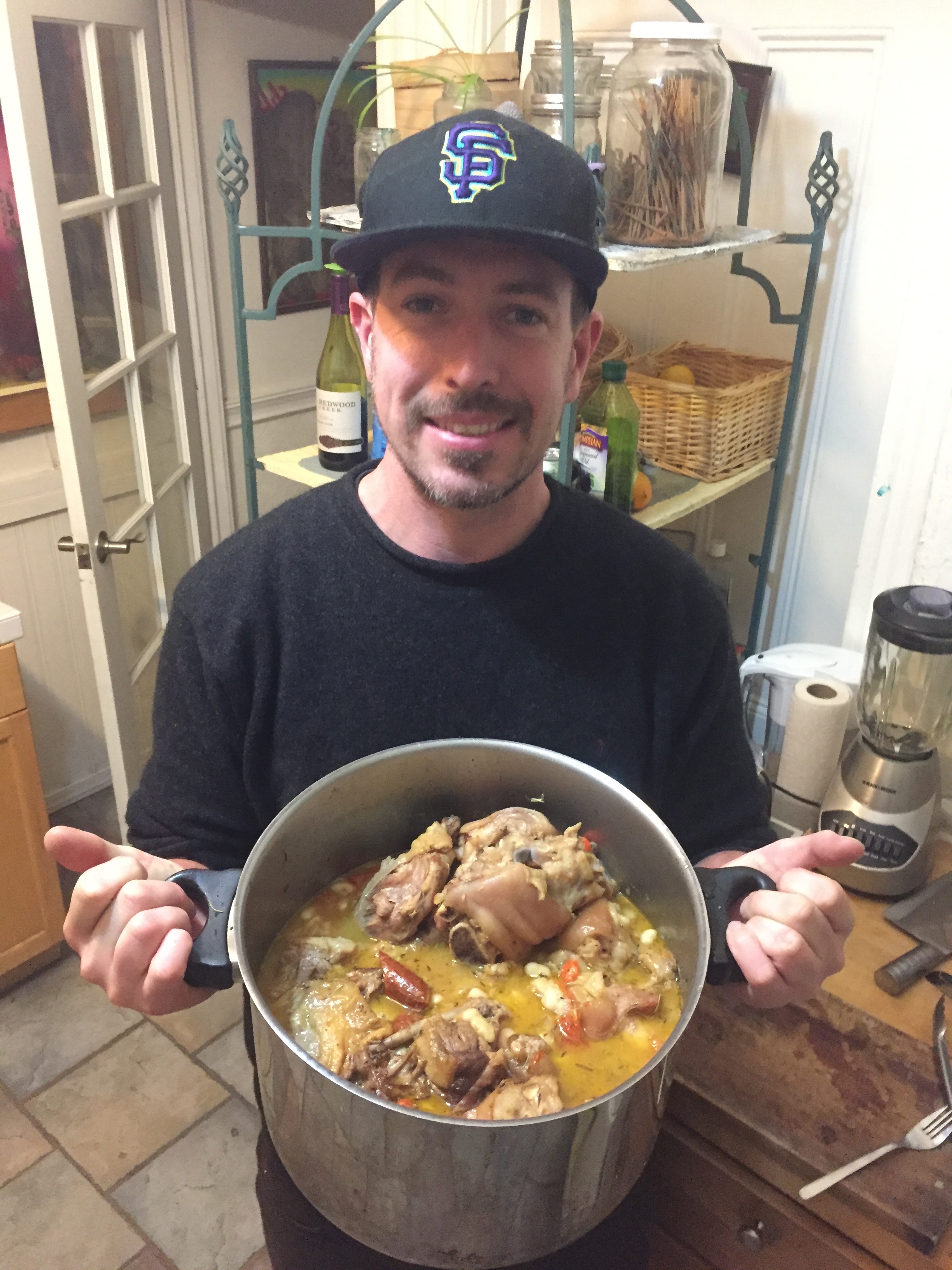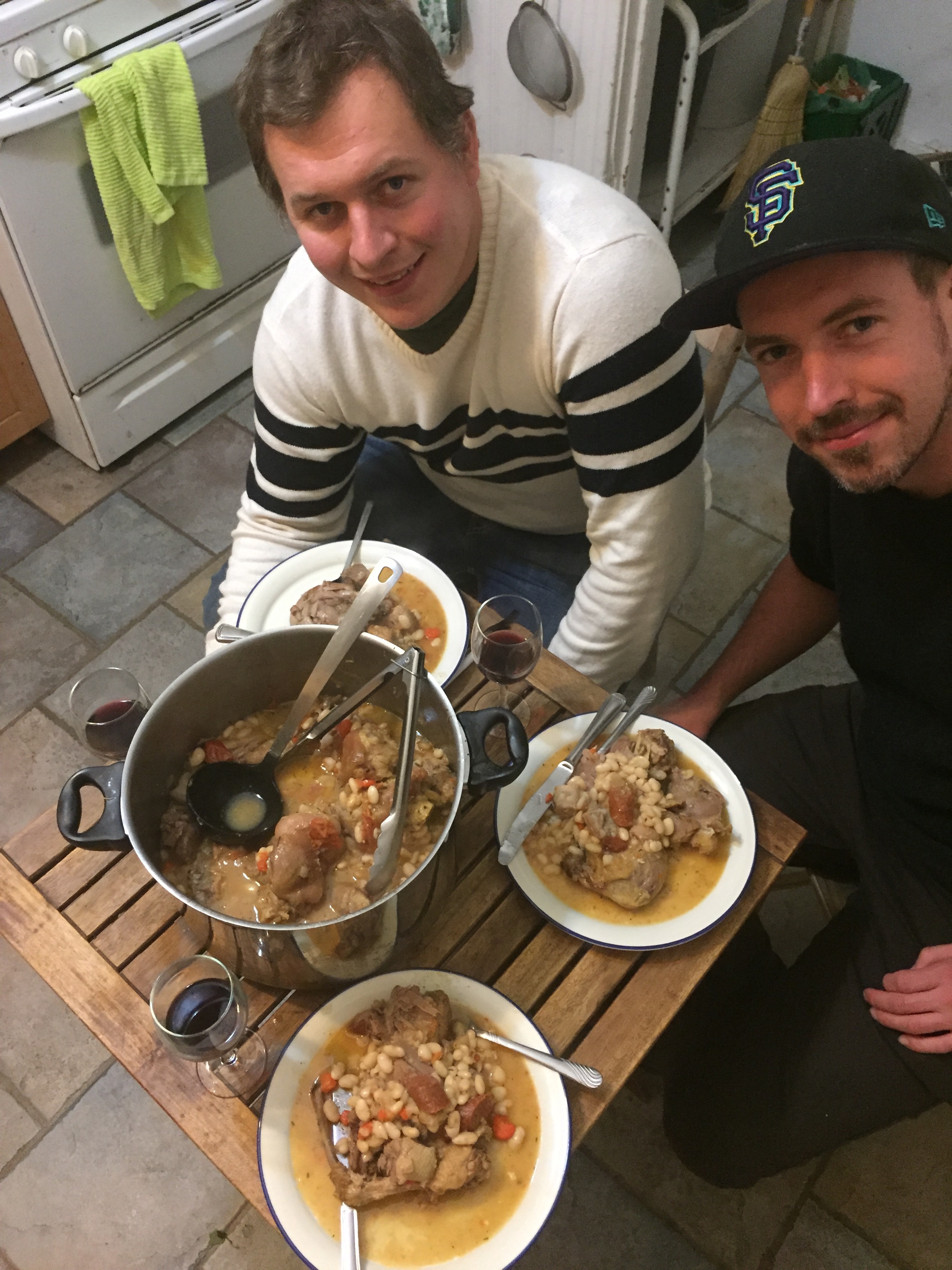 Yay, James cooks an amazing cassoulet for Christmas dinner. It contains, pigs feet, a whole duck, chorizo, belly pork and the usual beans and stuff. It is a cold, brisk San Francisco night but we are snug in the Fell St house.