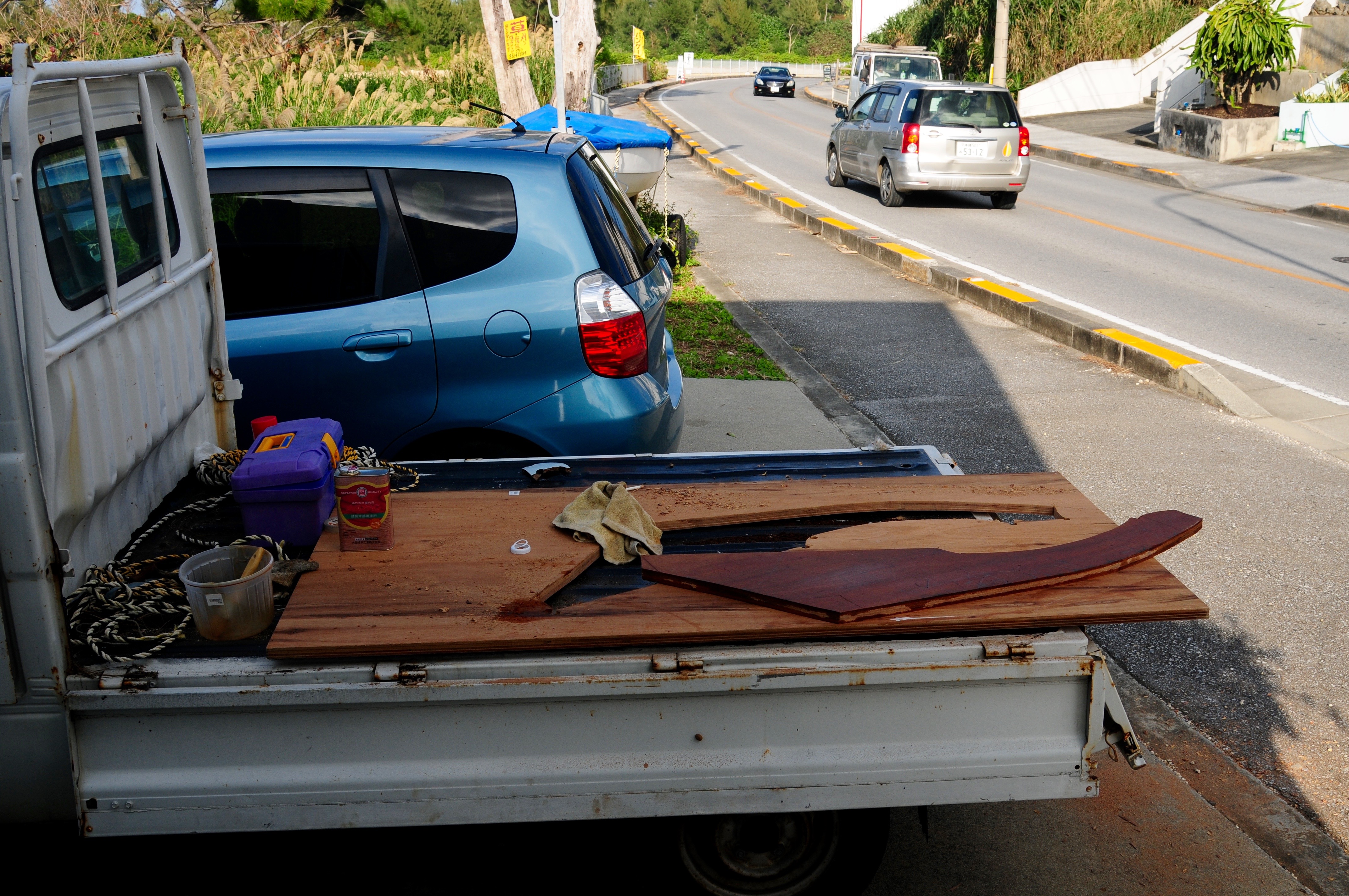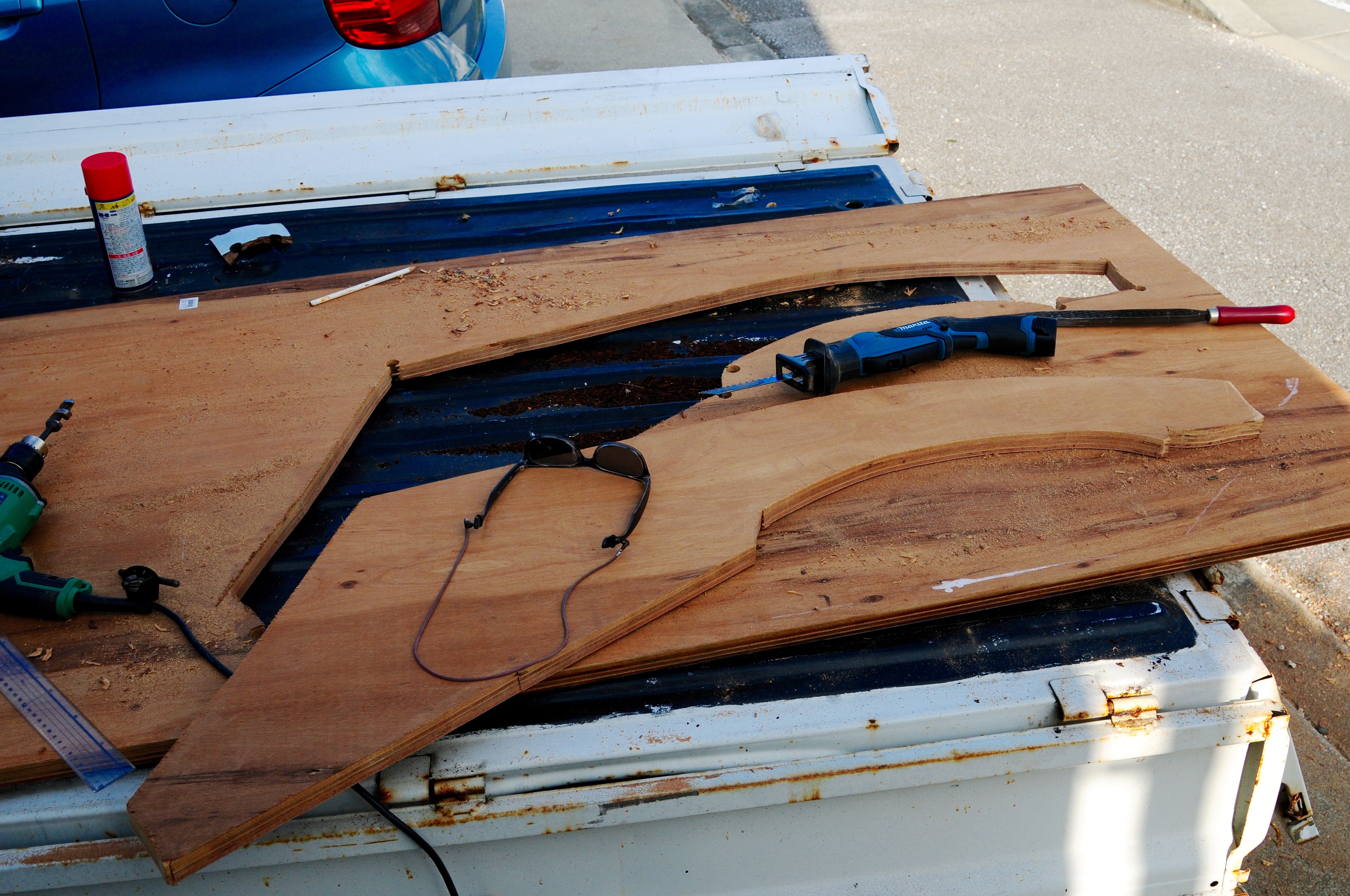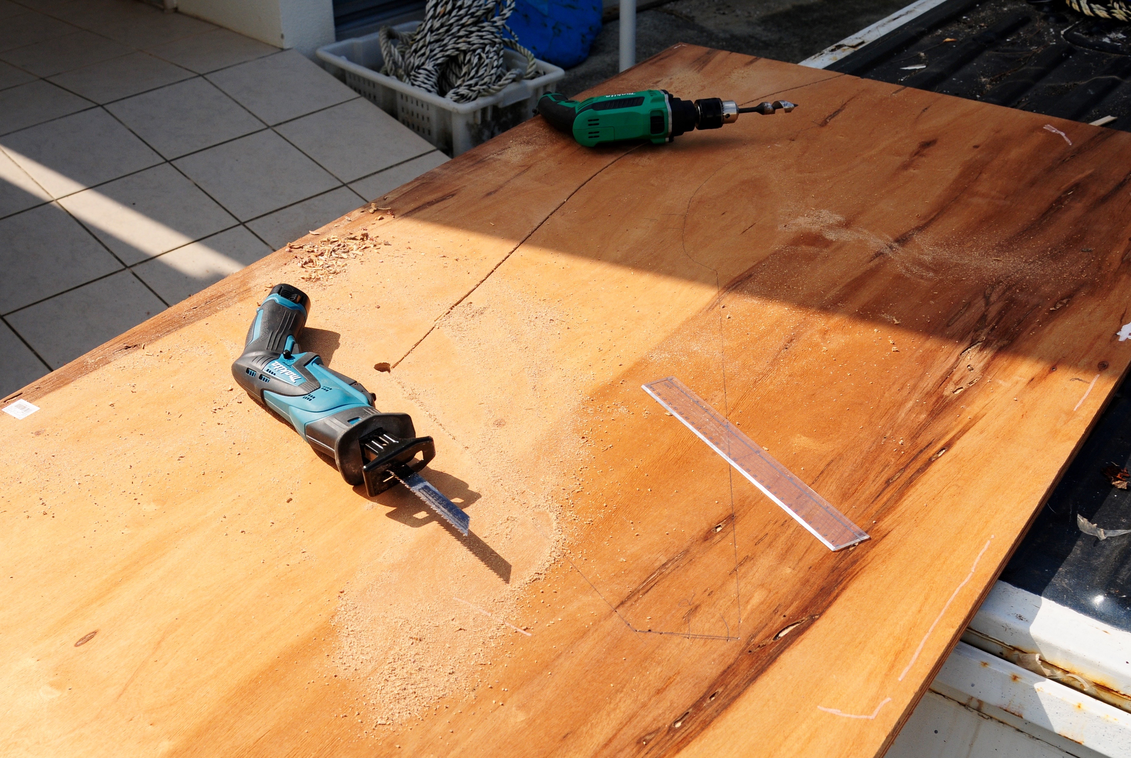 I love this kind of stuff, cutting a new rudder from a big plank of plywood on a glorious day in Okinawa.