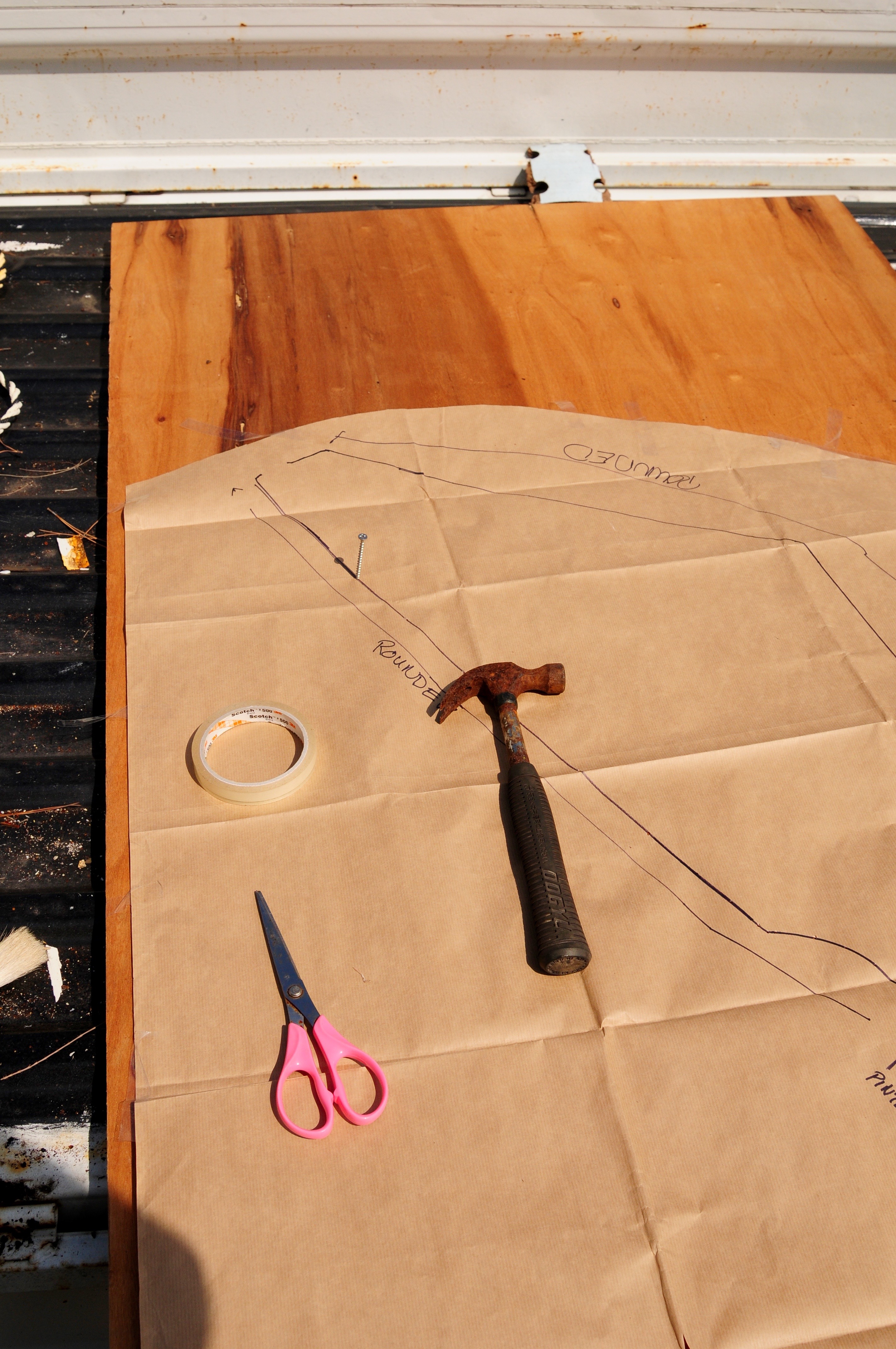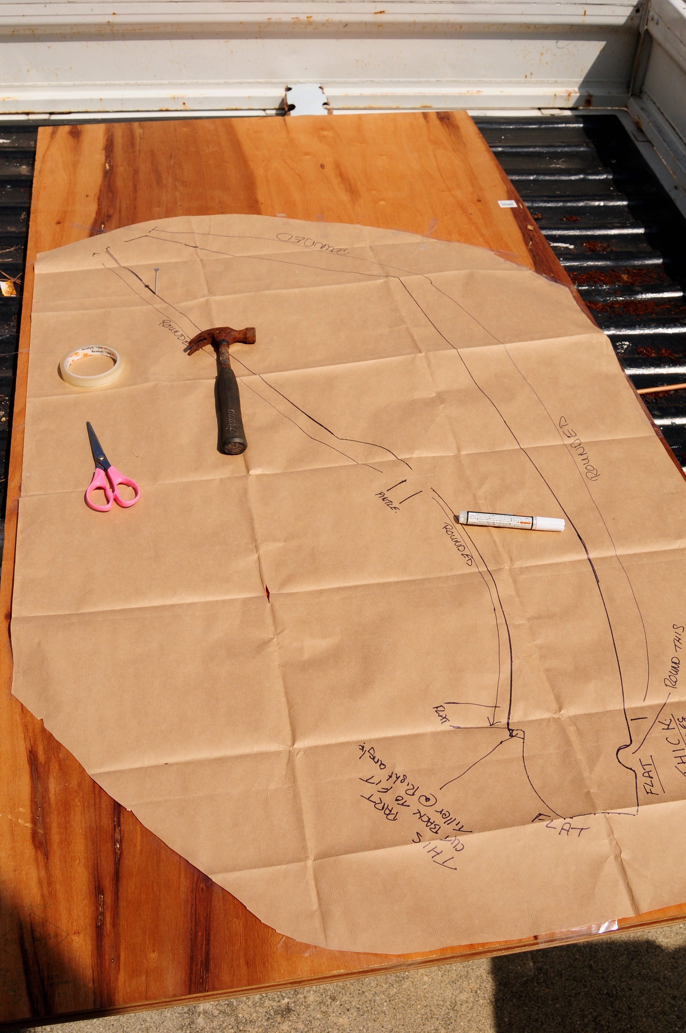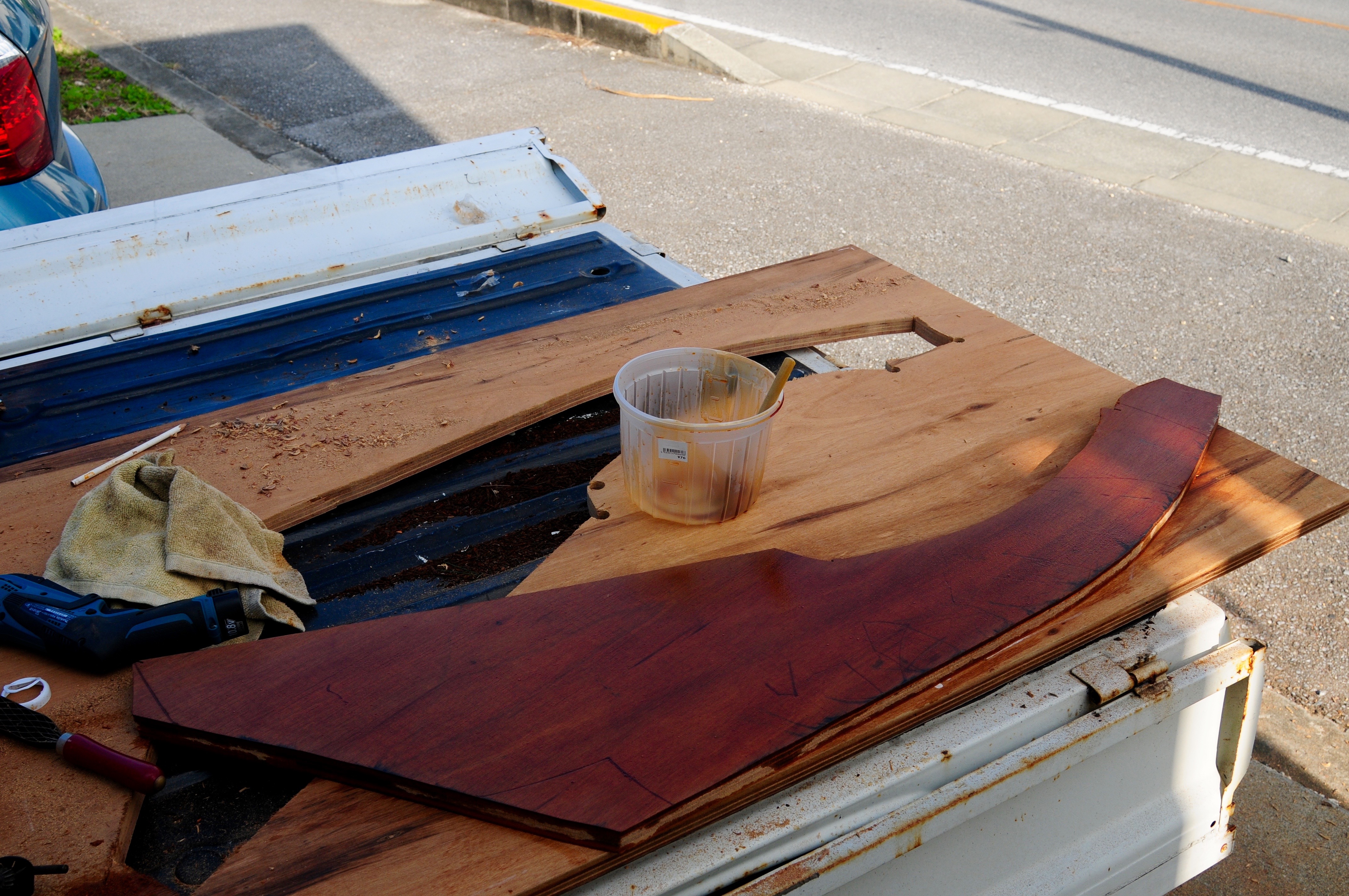 I love this kind of stuff, cutting a new rudder from a big plank of plywood on a glorious day in Okinawa.