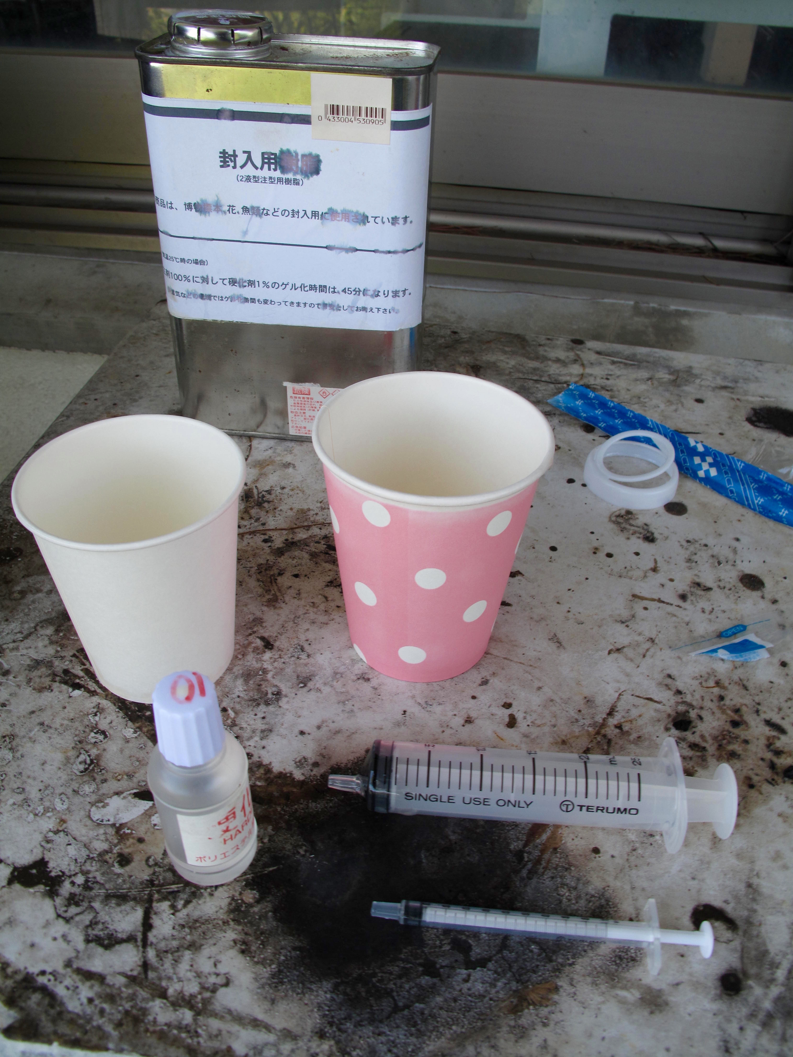 Mixing the epoxy is highly technical. It is a 100:1 mix, which means 100 parts epoxy to 1 part hardener. Great precision is needed to get the mix right.