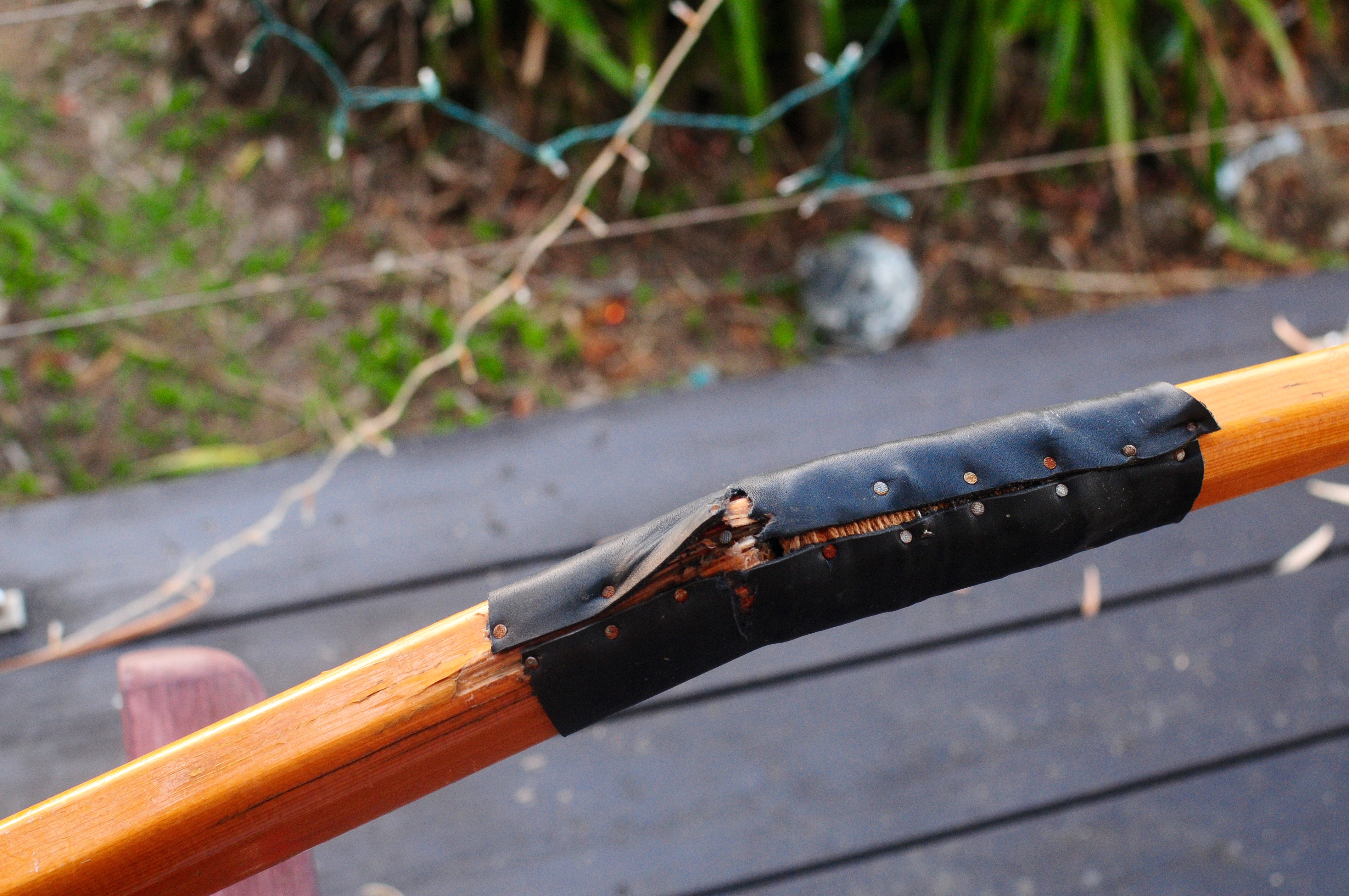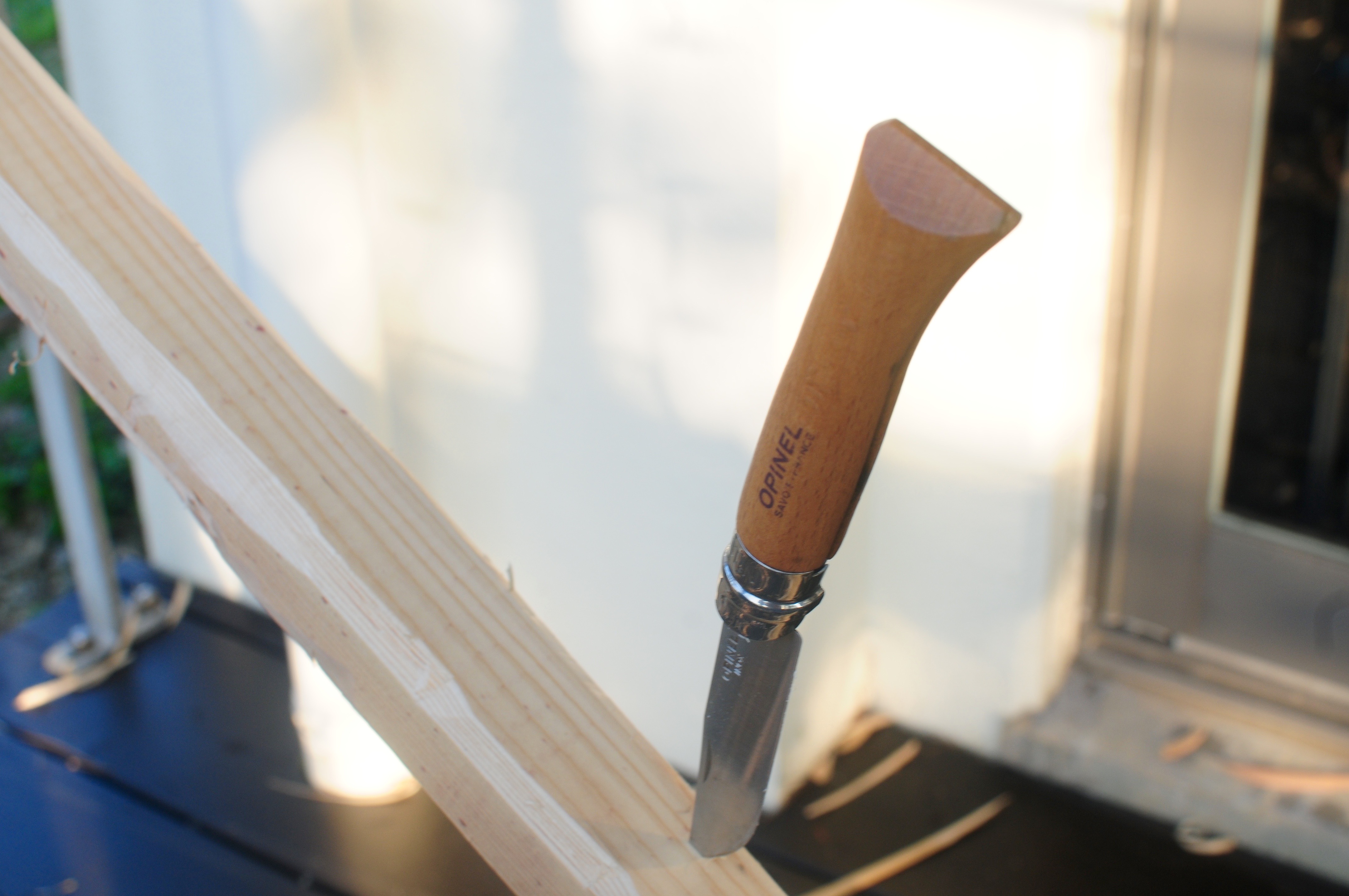 I immediately set to work to fashion a new yard.  I find that by far the best tool for shaving my length of Okinawan cedar into a serviceable yard is an Opinel that James gave me.