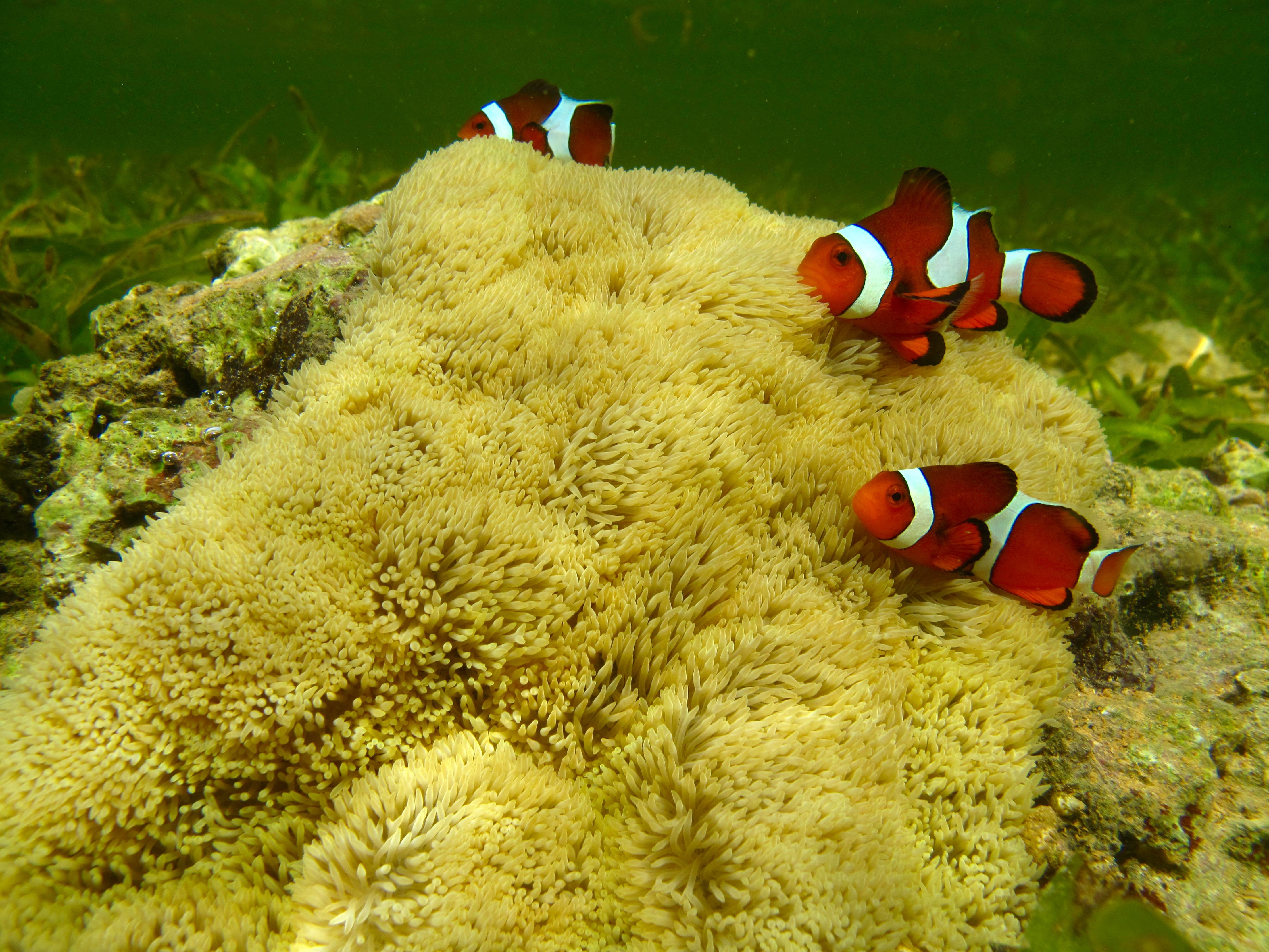It is Summer in Okinawa. It is hot, the sea is warm and so all things look seaward. About 20 meters from the shore in front of my house there is a family of Clown Fish.