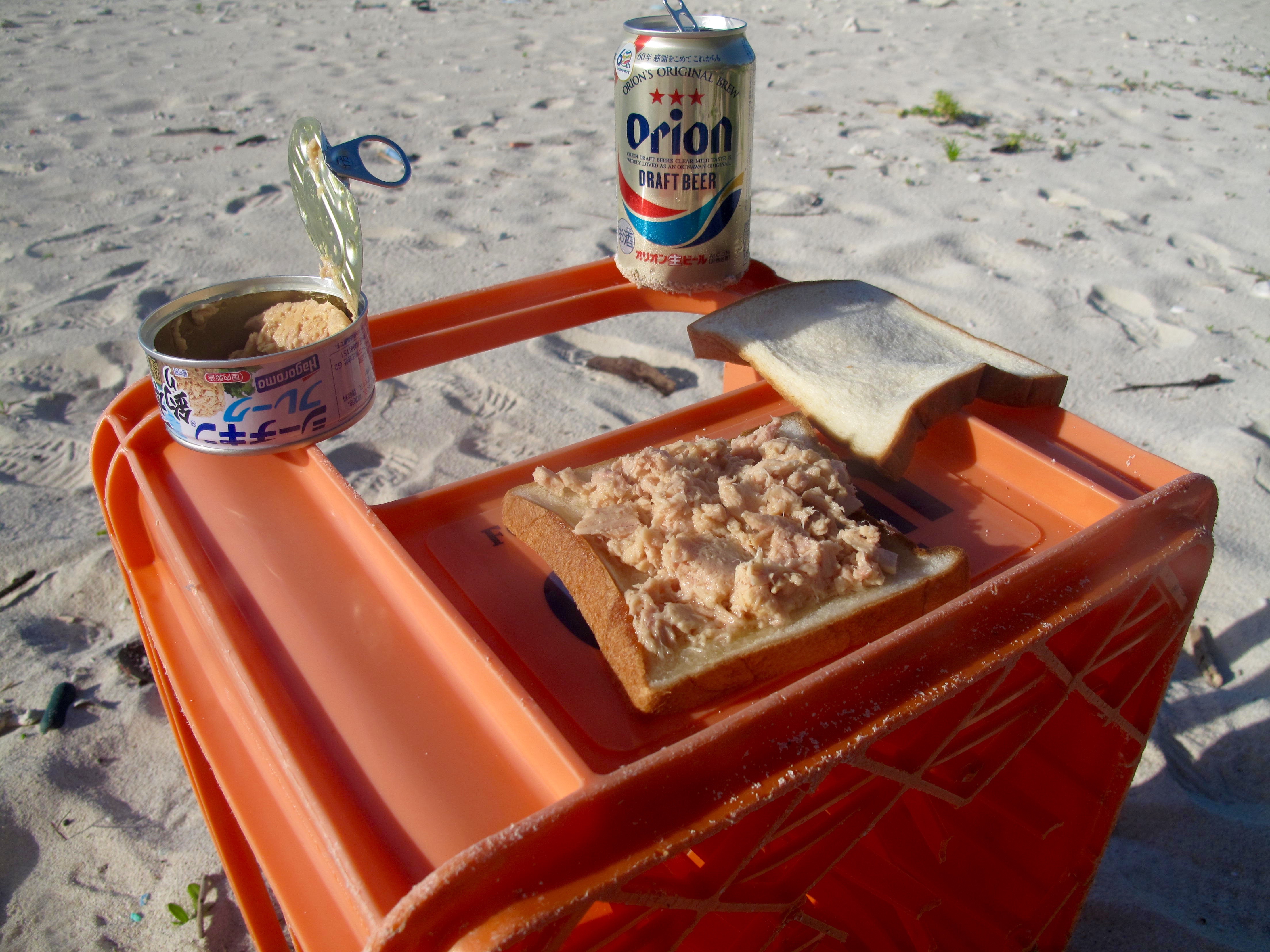 A guy who runs a business dragging people around behind his jetski is very interested in the Scaffie and is I think surprised that I have just sailed over from Maeda. With authentic Okinawa gentility he insists that I tie up beside his jet ski. He demonstrates a very cool knot that allows the mooring rope run up and down a fixed line such that the boat never grounds at low tide but follows the water out.