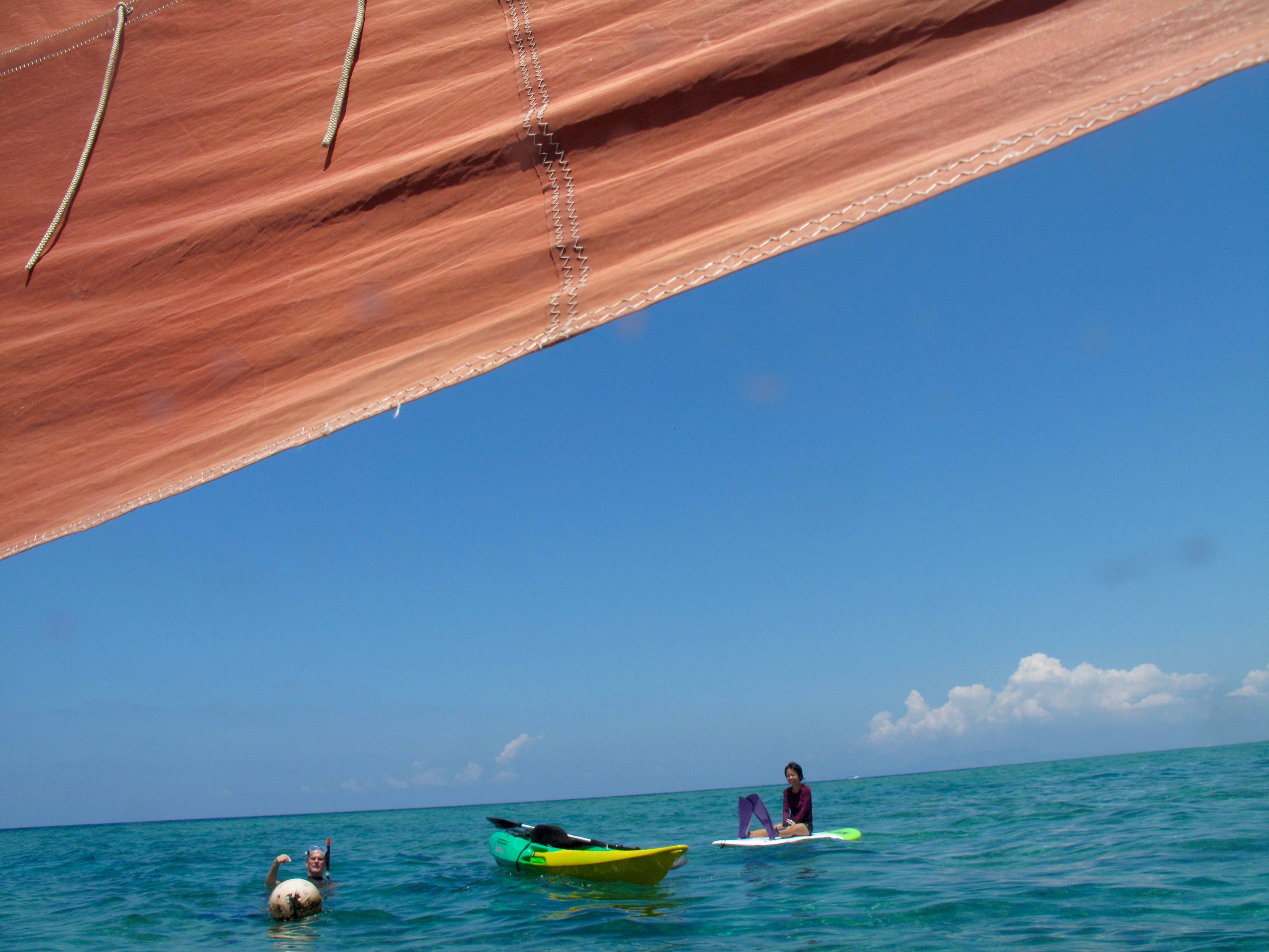 I sail way out and sail back in again, like the grand old Duke of York. On the the way home, I spy Alisa and Harry. They are liberating a buoy as what tells you where the reef starts. Its rope had snagged on some coral, which had dragged it under water.