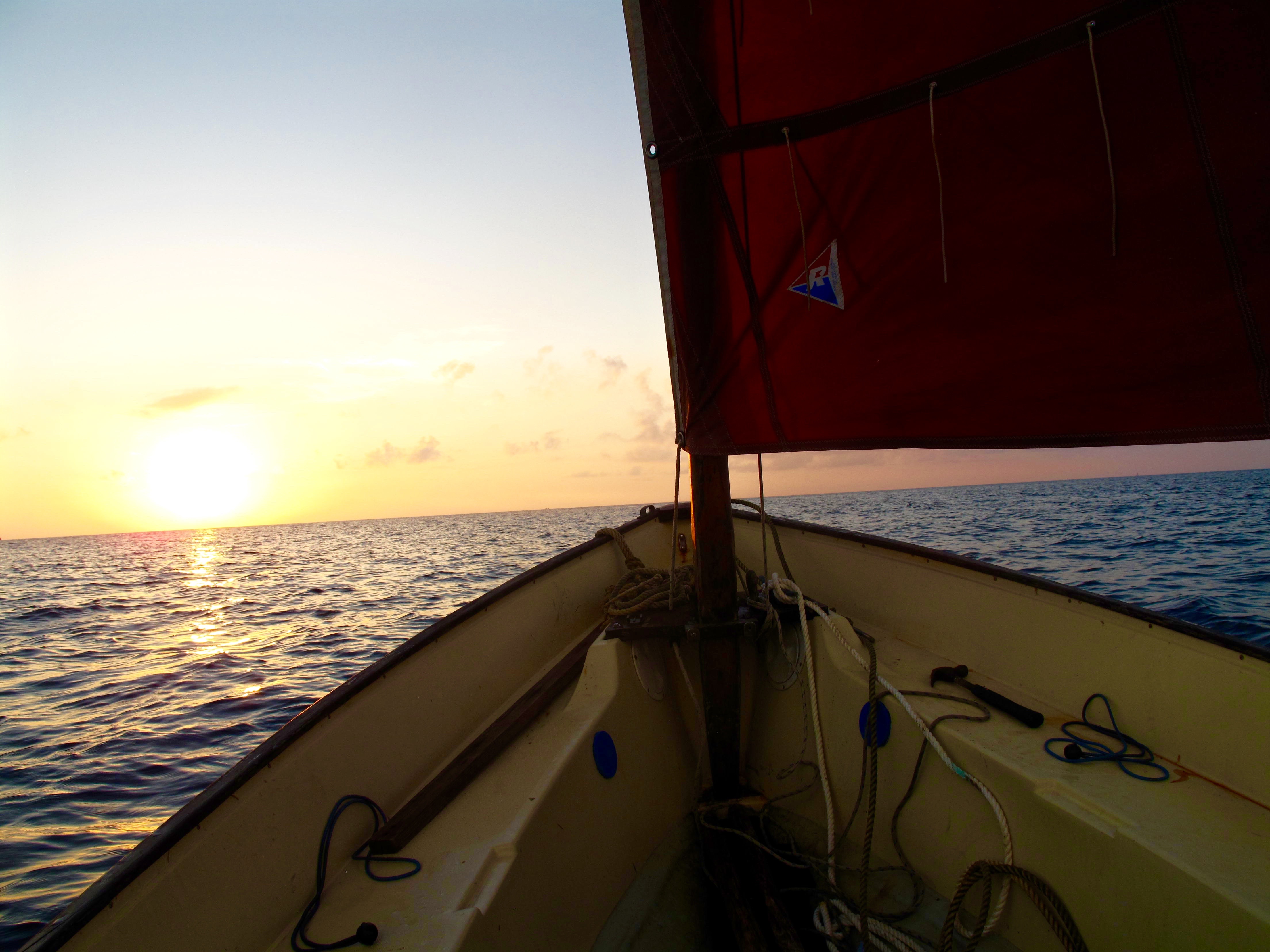 It is Sunday. Okinawa is at its best being sunny, hot and colored. It take the boat out. There is not a lot of wind but there is enough to power the Scaffie over the reef and into the the deep blue sea.