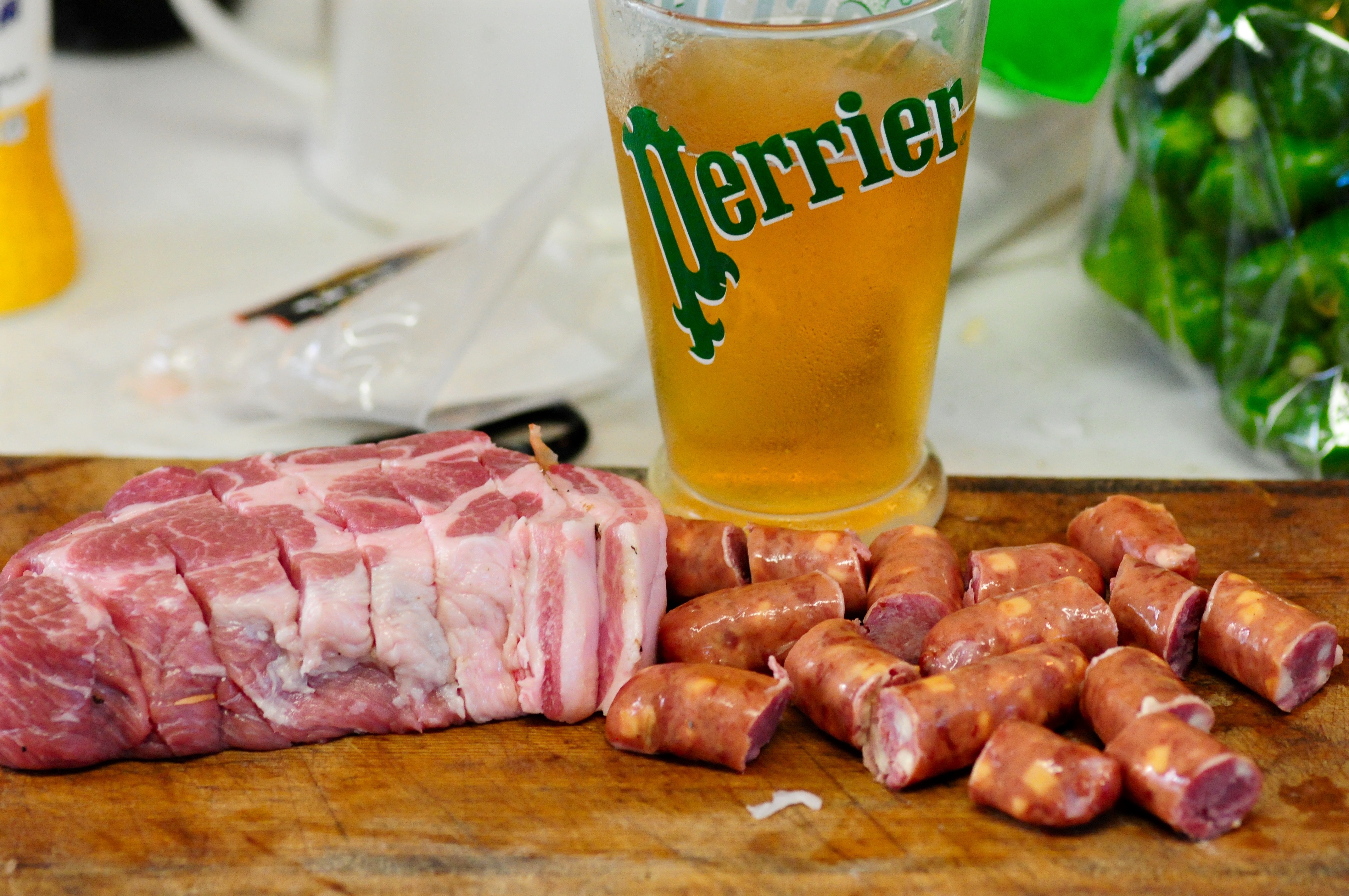 So, I get a big lump of fatty pork, two filets of fresh tuna, some clams, some prawns, some sausages that do a reasonable impersonation of chorizo. My big worry was the rice. Would Japanese sticky rice work as a replacement for Barcelona style round rice?
