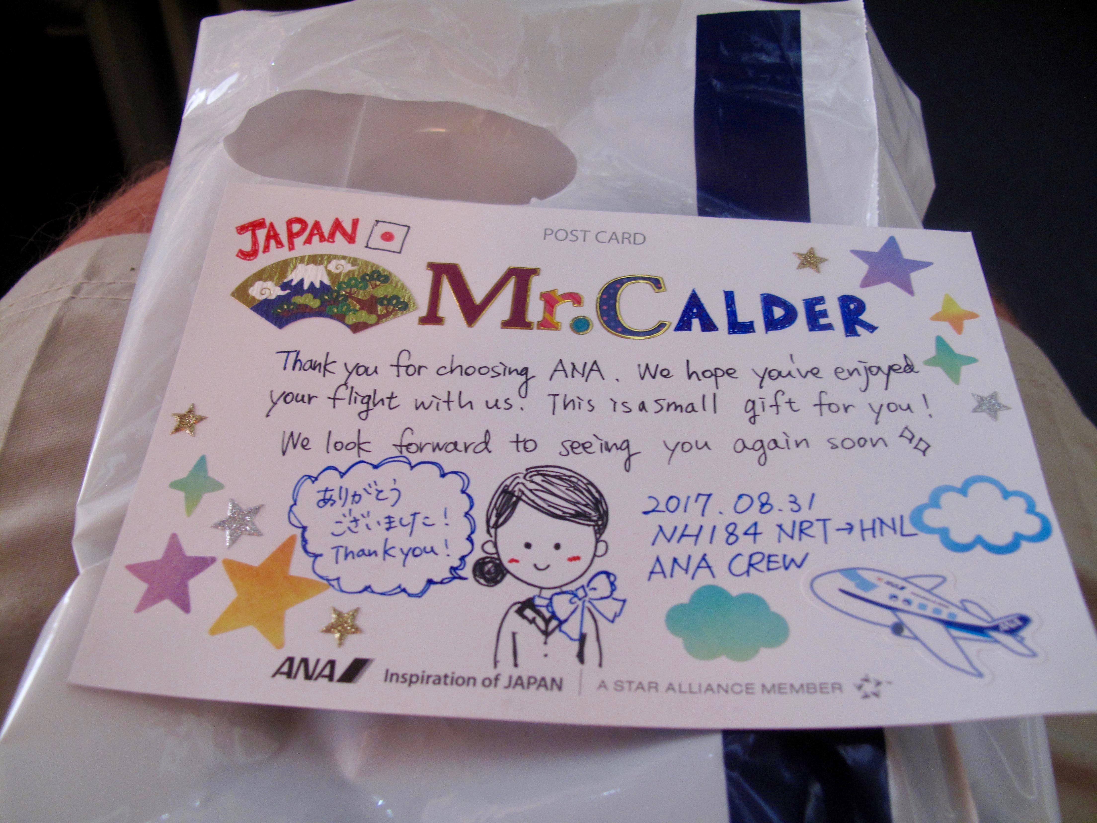 As I am sneaking out of the toilet towards the end of the trip, the flight attendants gather around me giggling and announce they have a gift for me. There is a card and an exquisitely wrapped something.