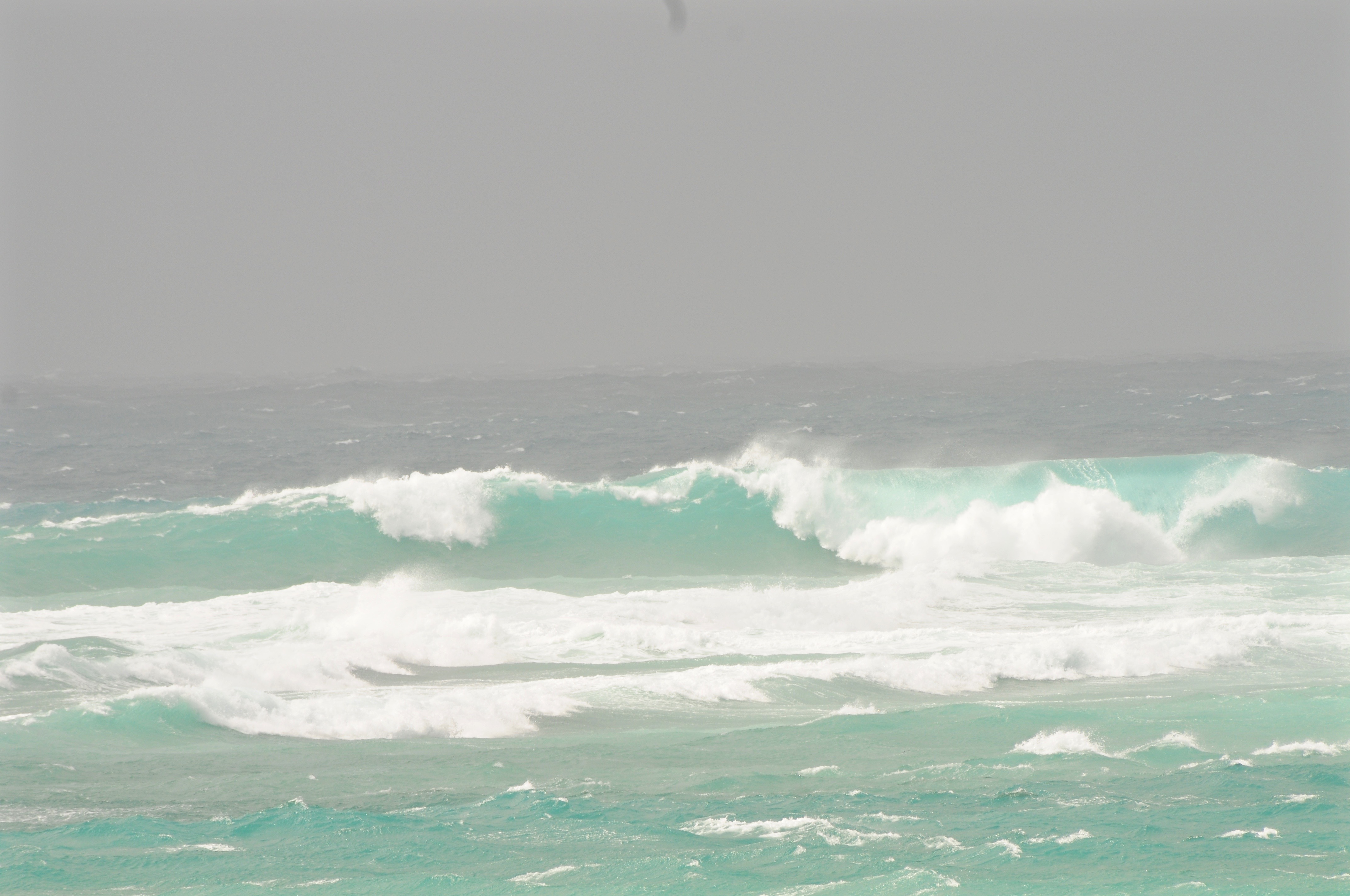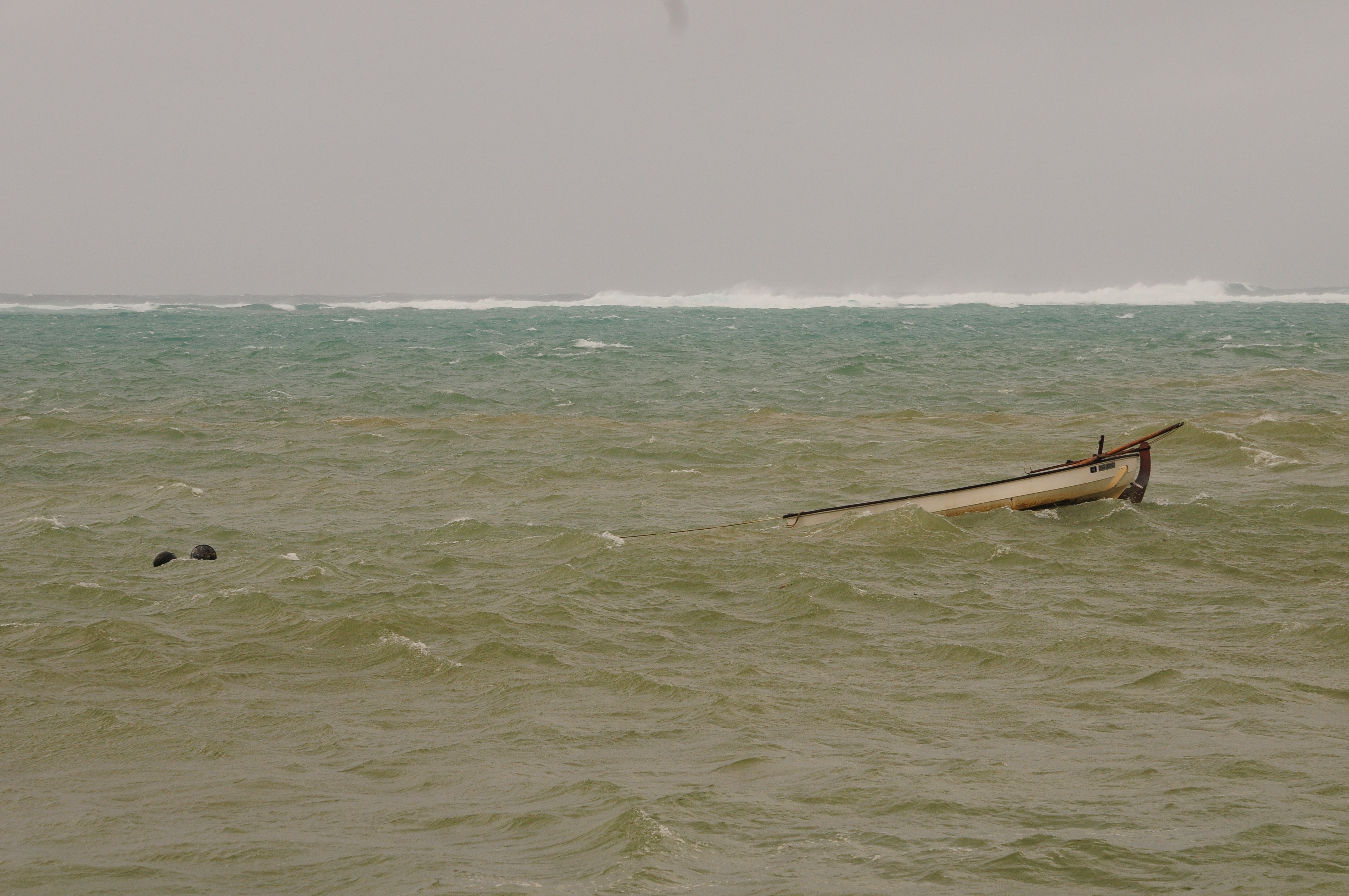 I went out early this morning to bale her out and check the anchors. Regrettably and unexpectantly, the weather got much worse during the day. At low tide we are Ok because the reef absorbs the anger of the ocean but as the day matures the tide rises and the huge swells sweep over the reef to pay court to my sweet, innocent Scaffie.