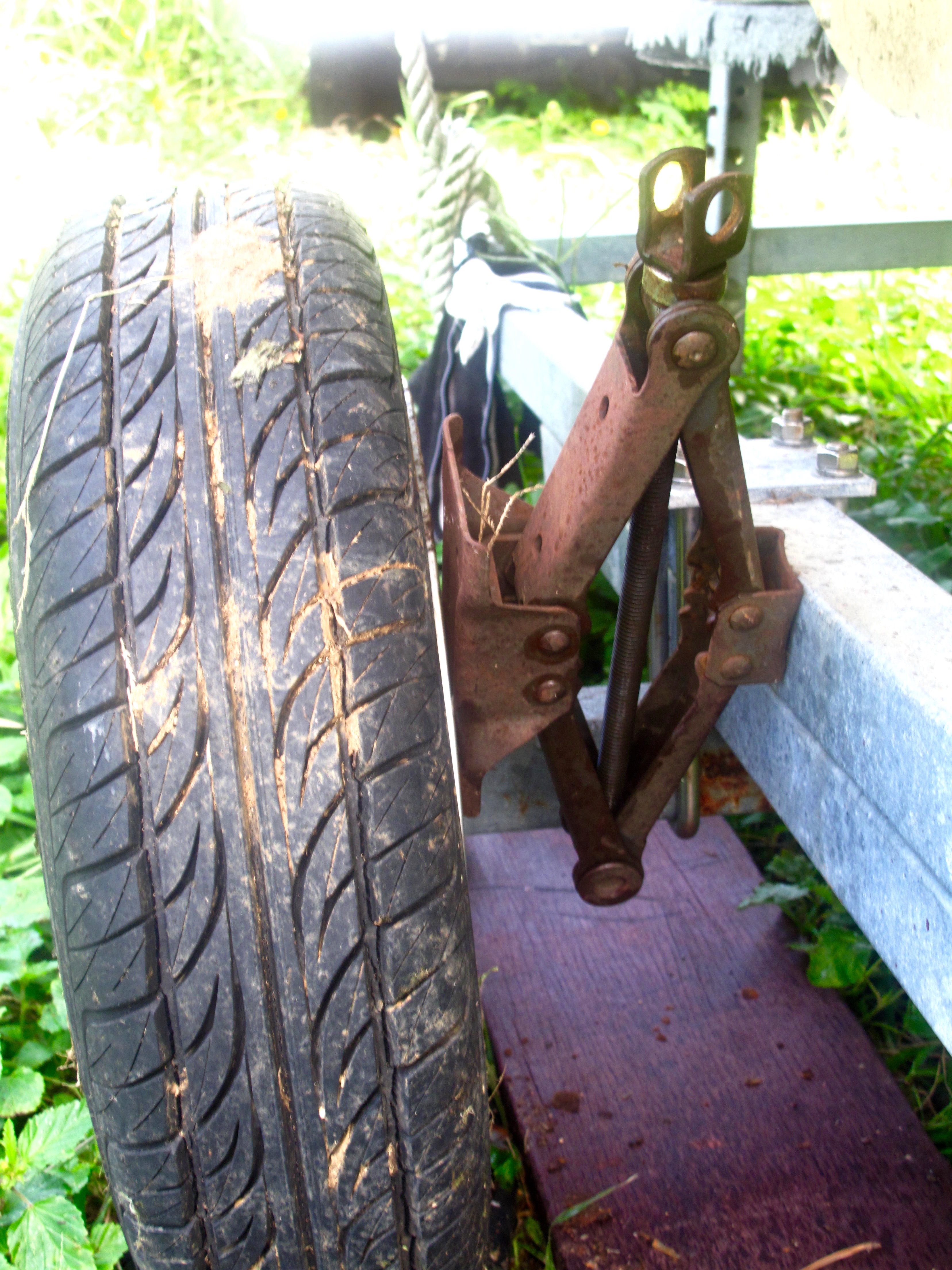 Then I have an idea – what if I put one end of the jack against the trailer frame and the other against the wheel rim and then open the jack just maybe I can get enough force to break the rim off the hub.