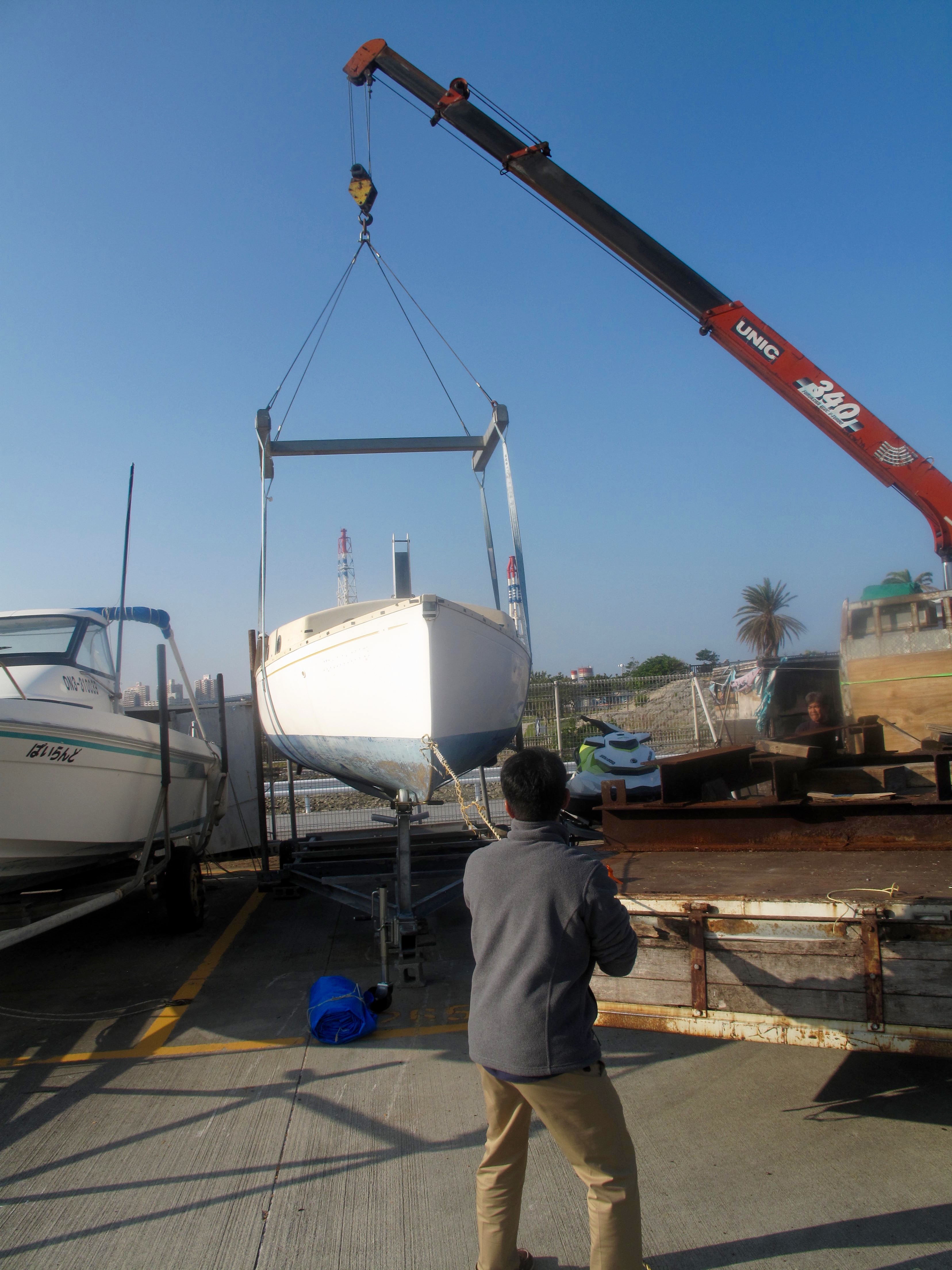 Luckily she fits onto the trailer. There is much adjustment to get her perfectly placed and leveled. I sort of circle as the harbormaster, of whom more later, and the truck driver give a performance of great skill and delicacy.