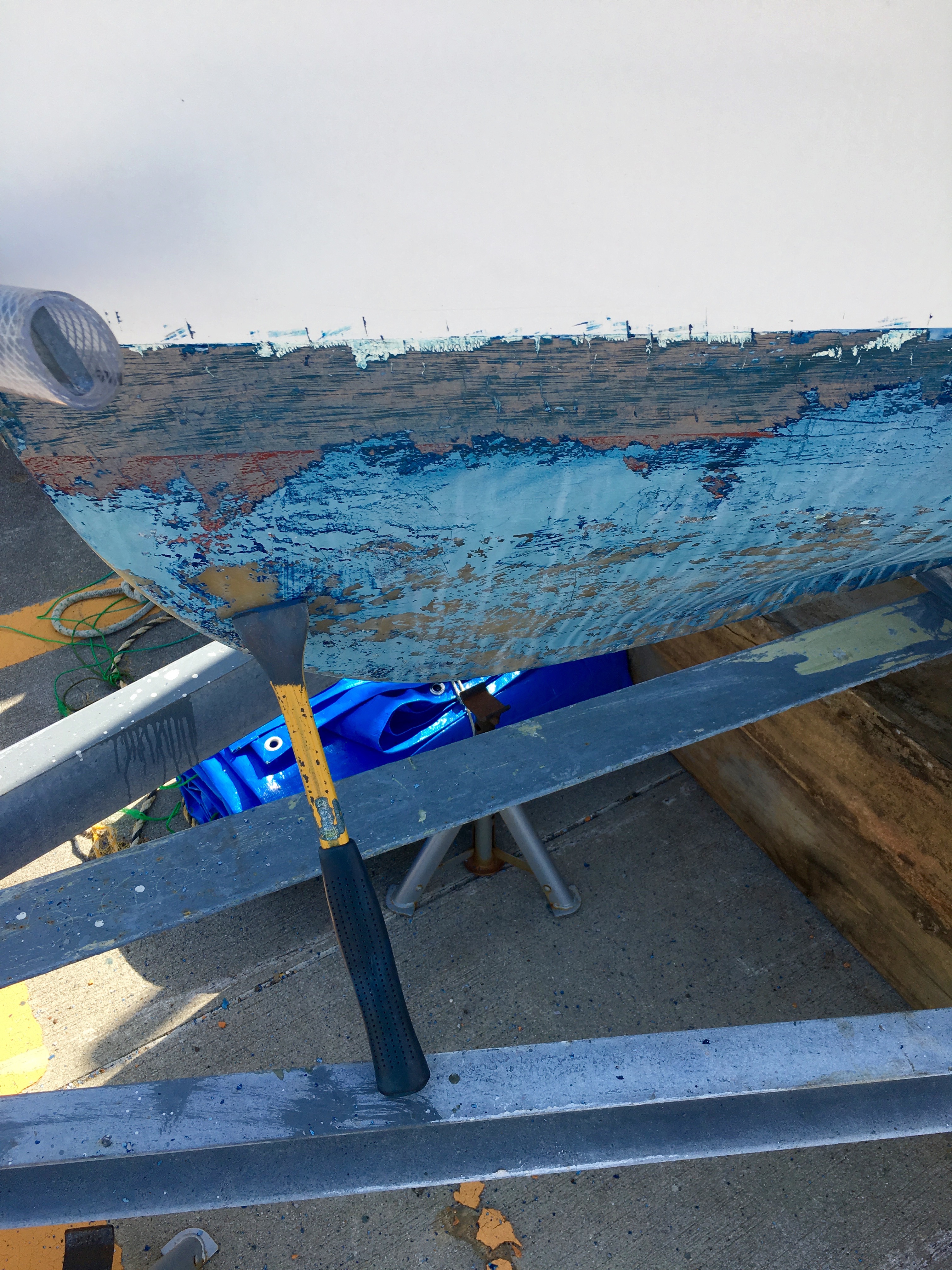 It smashes off all the residual sealant in no time at all. I then ask him about removing the old antifouling paint. Again he says use the scraper.
