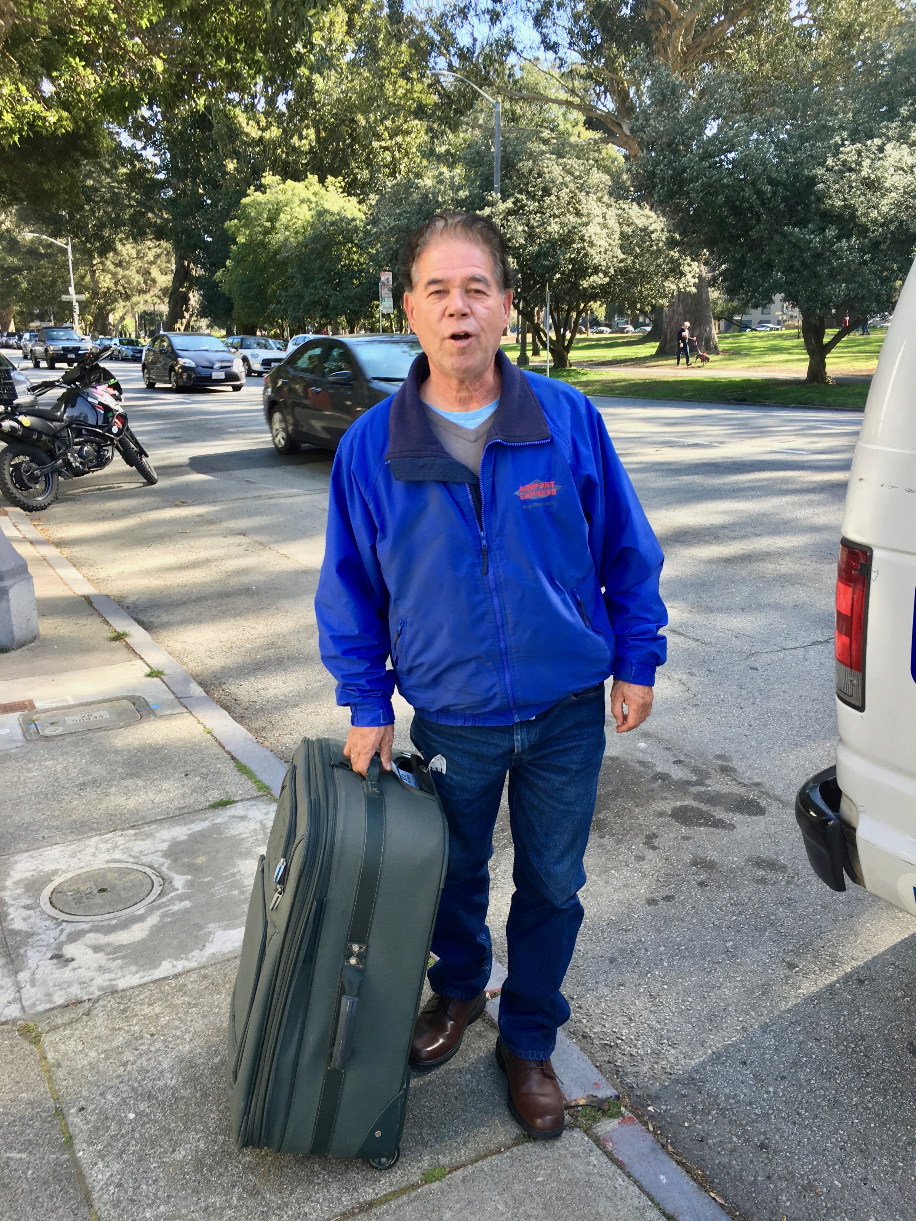 I arrive at SFO and wait for James to pick me up in the truck. However, after some confusion I get a text saying the truck’s battery is flat and I will have to find my own way home. During this wait my much beloved Google Timbuktu bag is on the sidewalk. I then go over to the shuttle stop and in no time at all I am en route to SF.