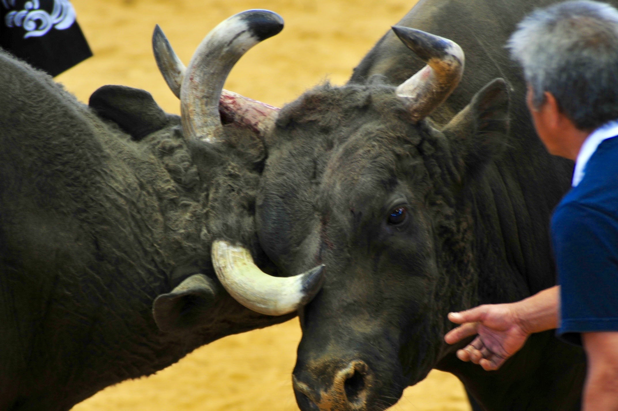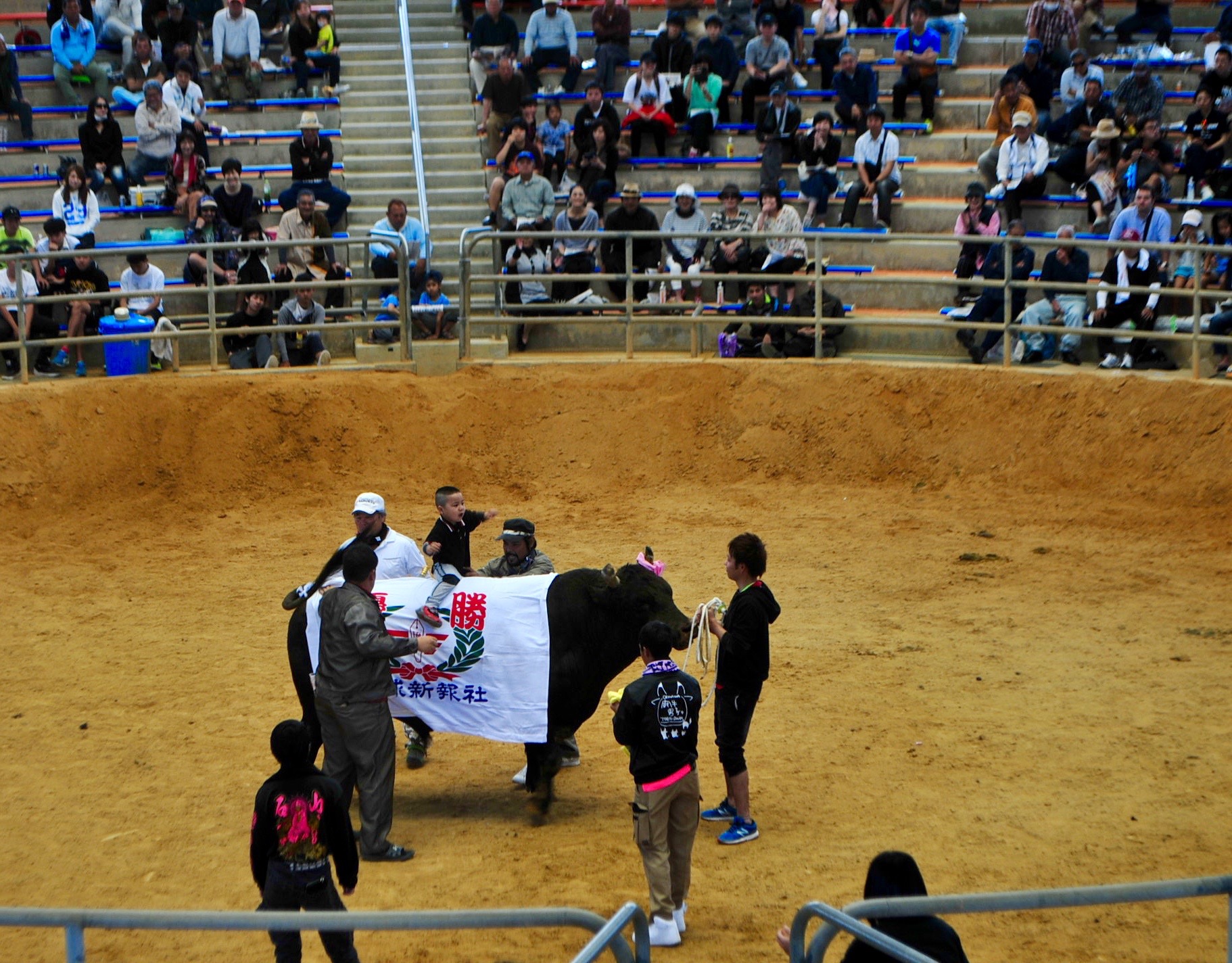 I notice huge crowds outside the bull fighting arena in Ishikawa and pop in.