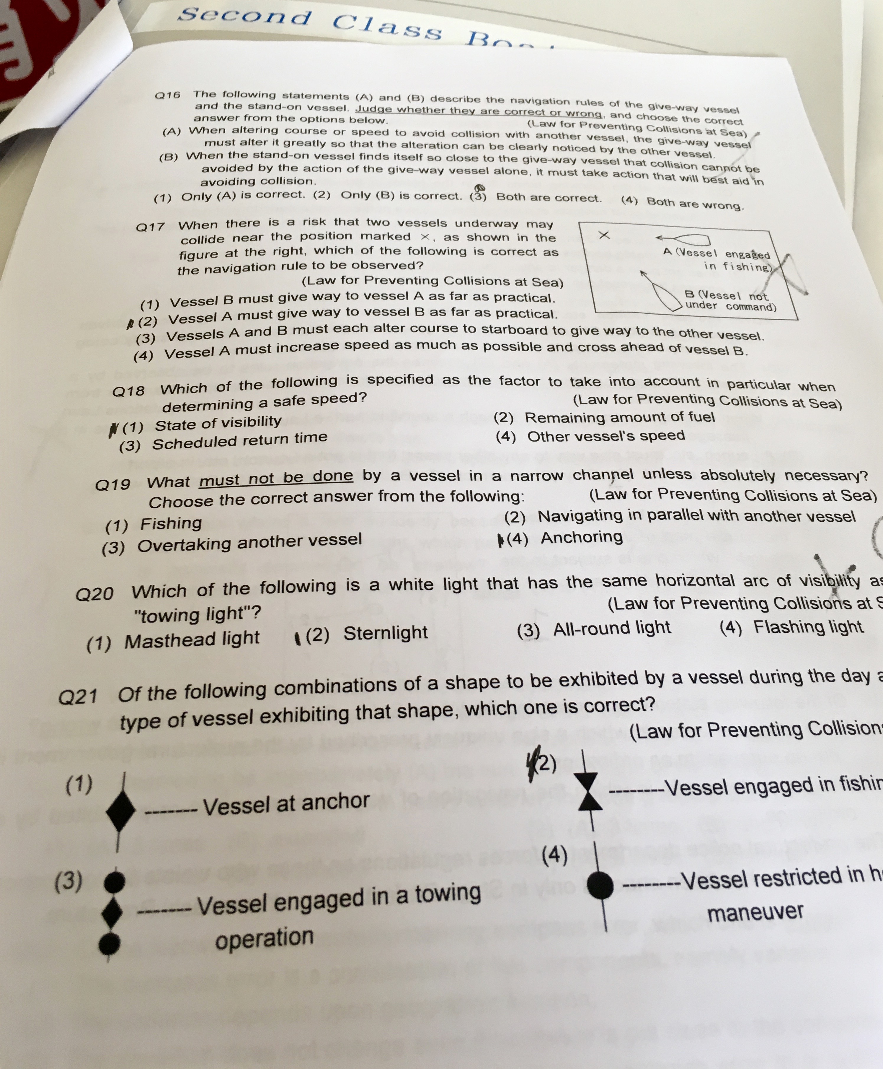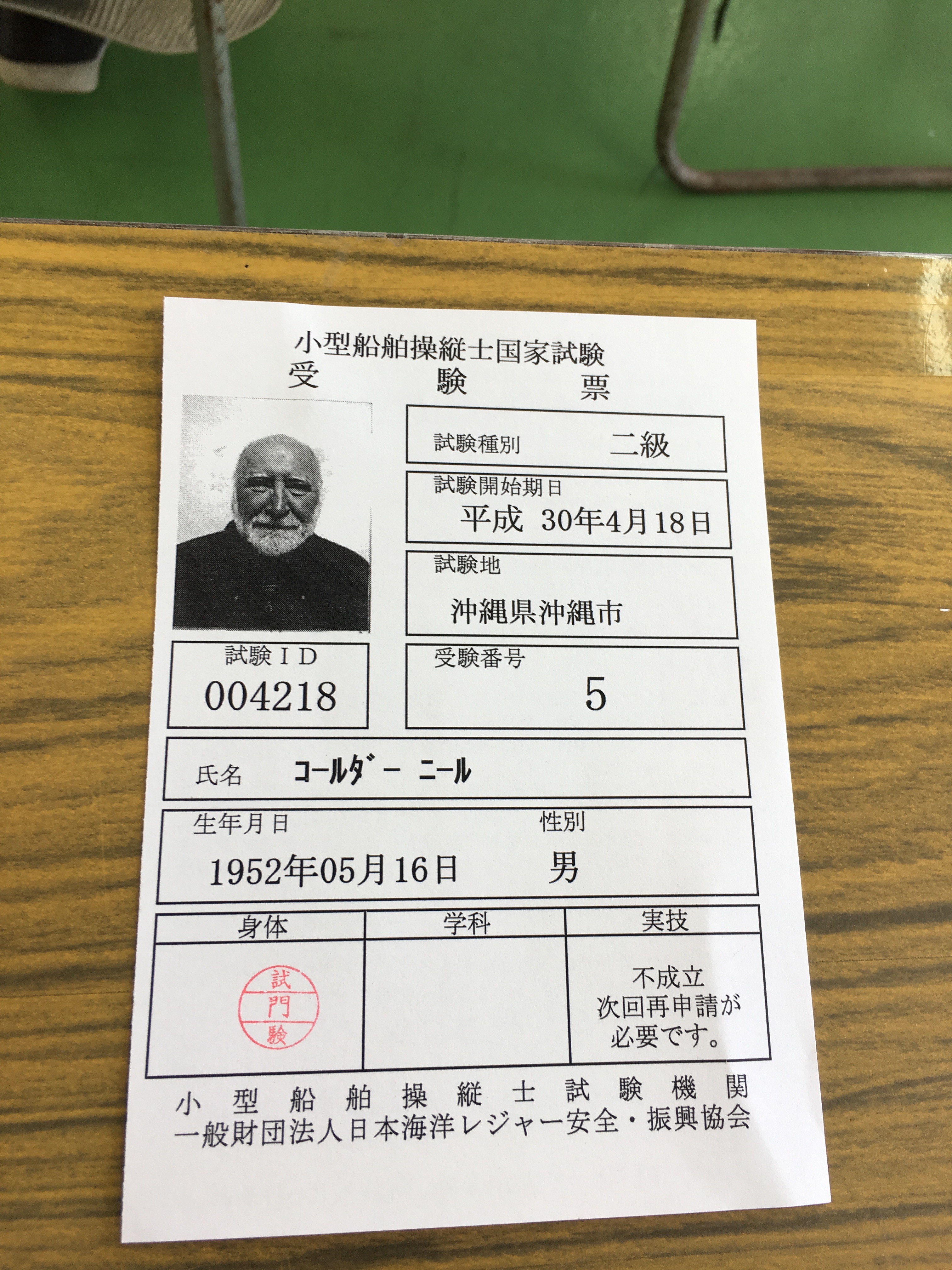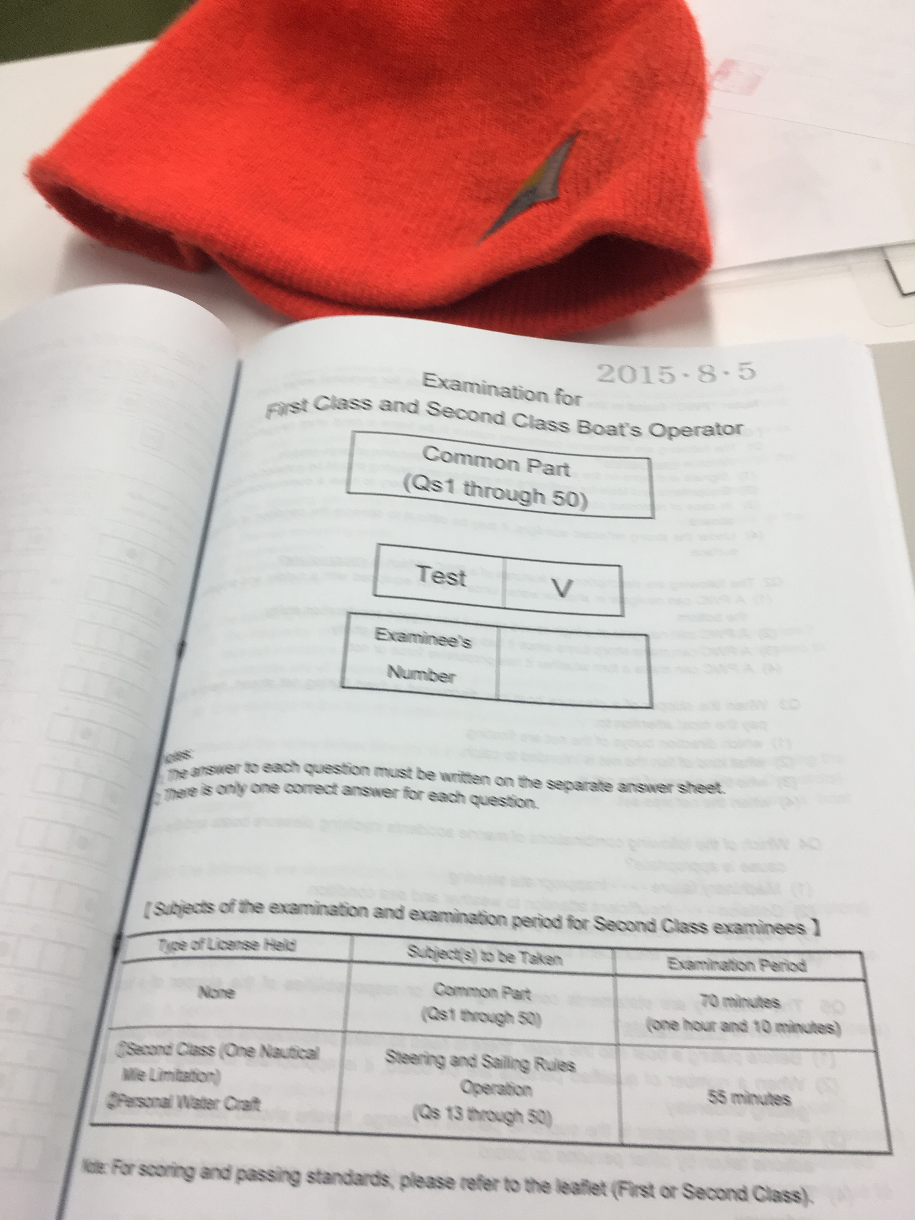 The theory test is held at the Okinawa Marina in Awase. It is very formal with an invigilator who walks around the room to make sure we are not cheating.
