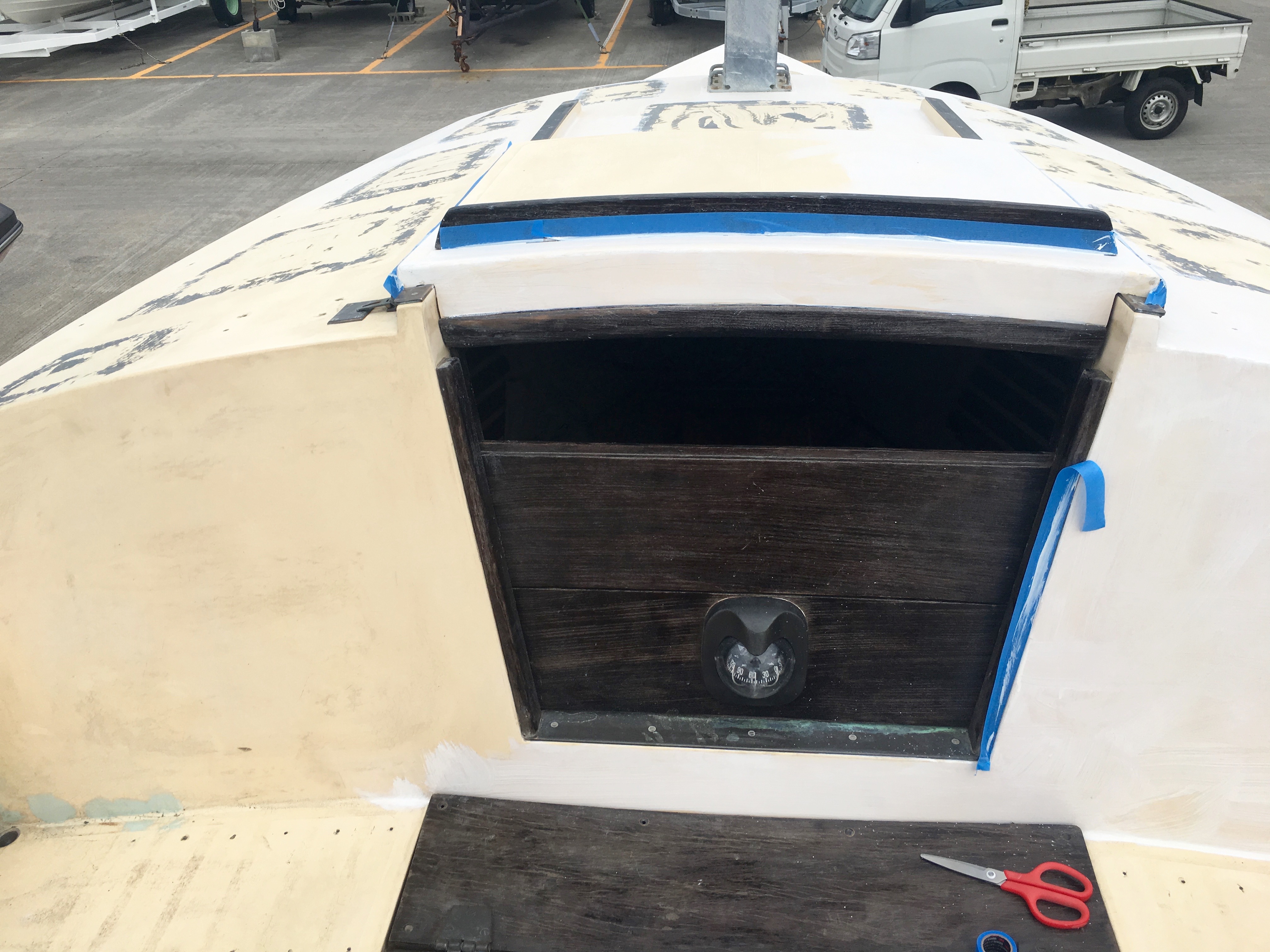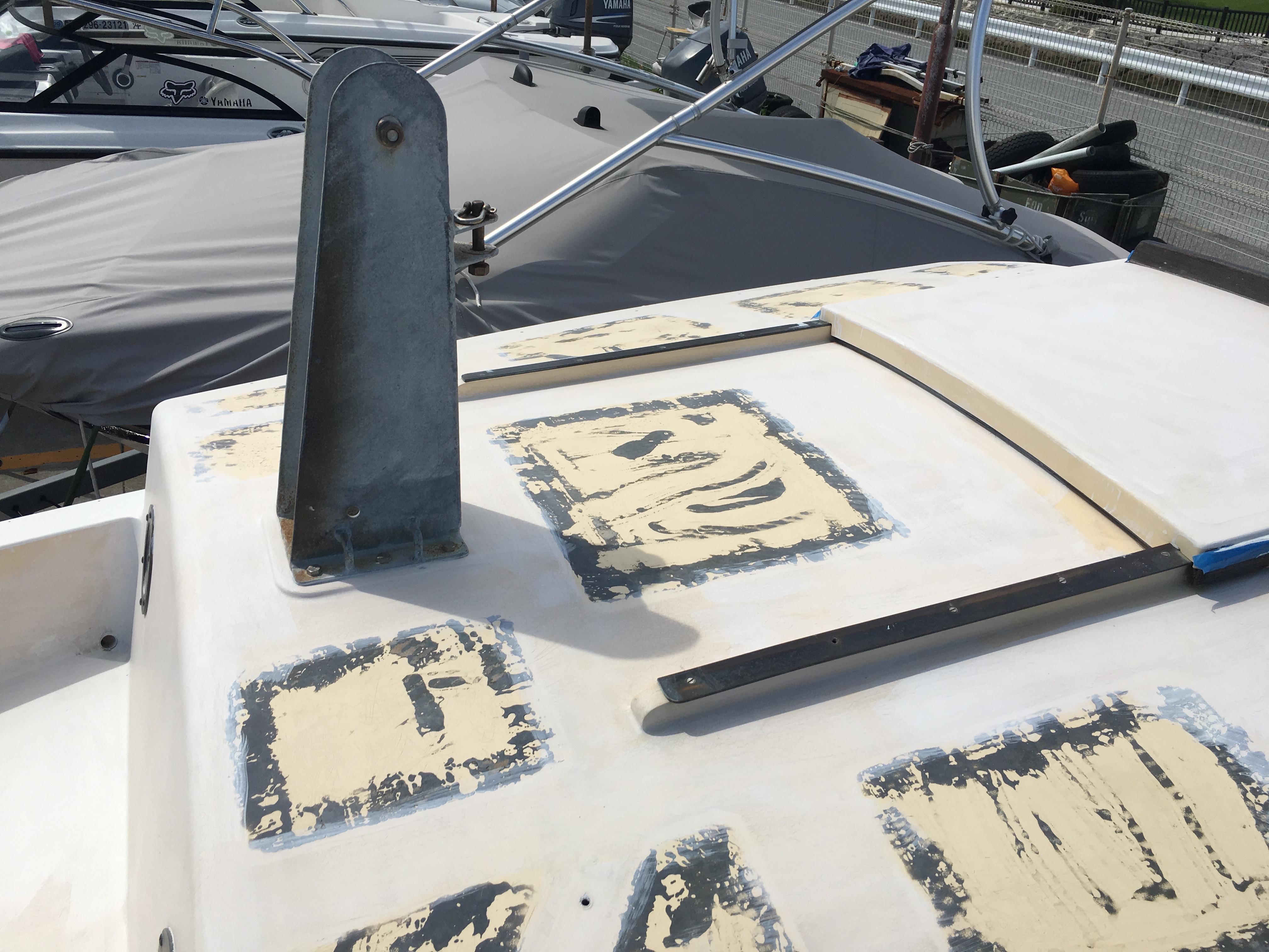First coat on cabin roof. The unpainted patches will be covered with Treadmaster non-slip mats that are, as I write, winging over from Norfolk.
