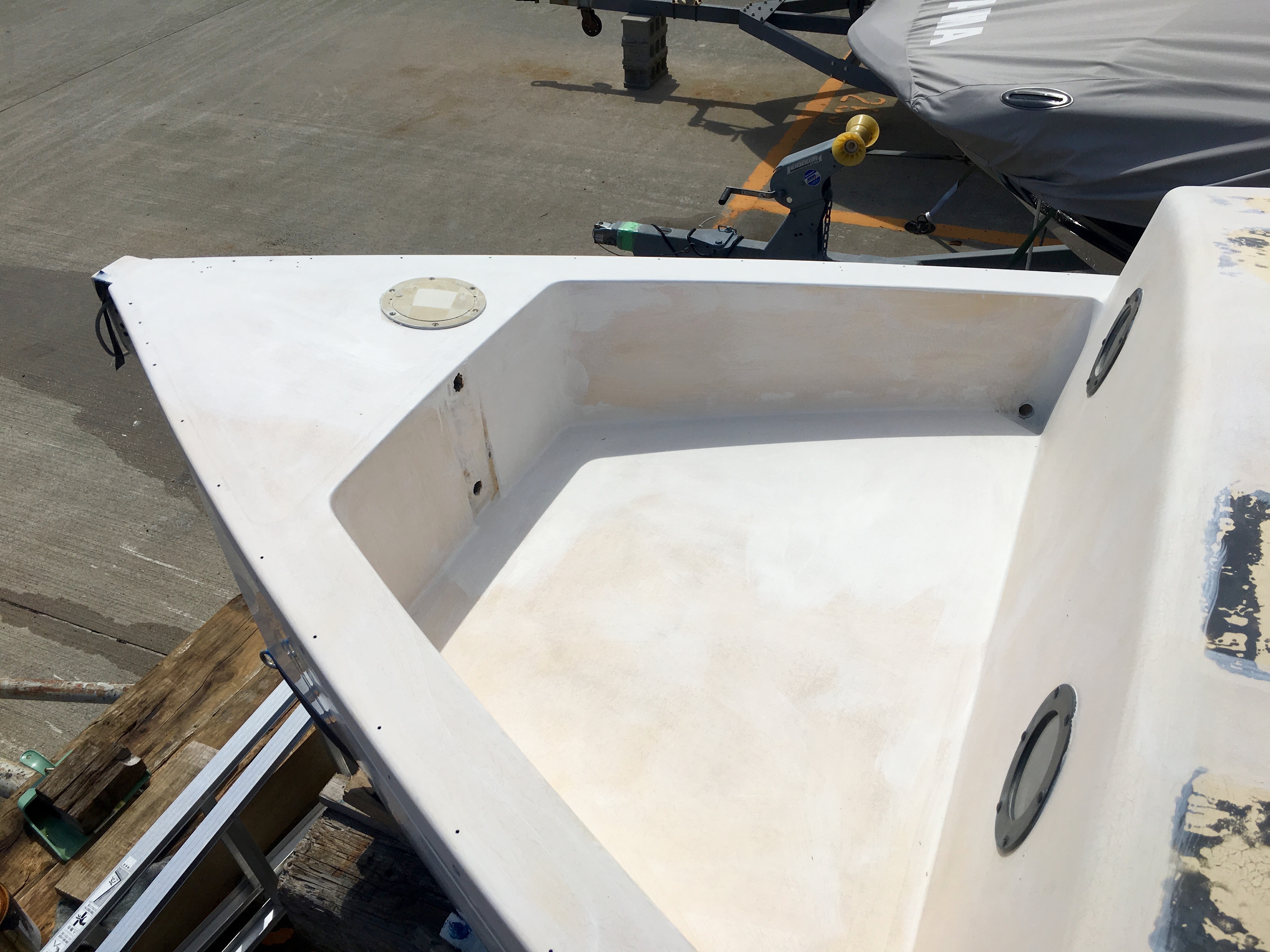 Foredeck well being treated. The indentation where the samson post will be fitted had kilos of silicon sealant at the joint.