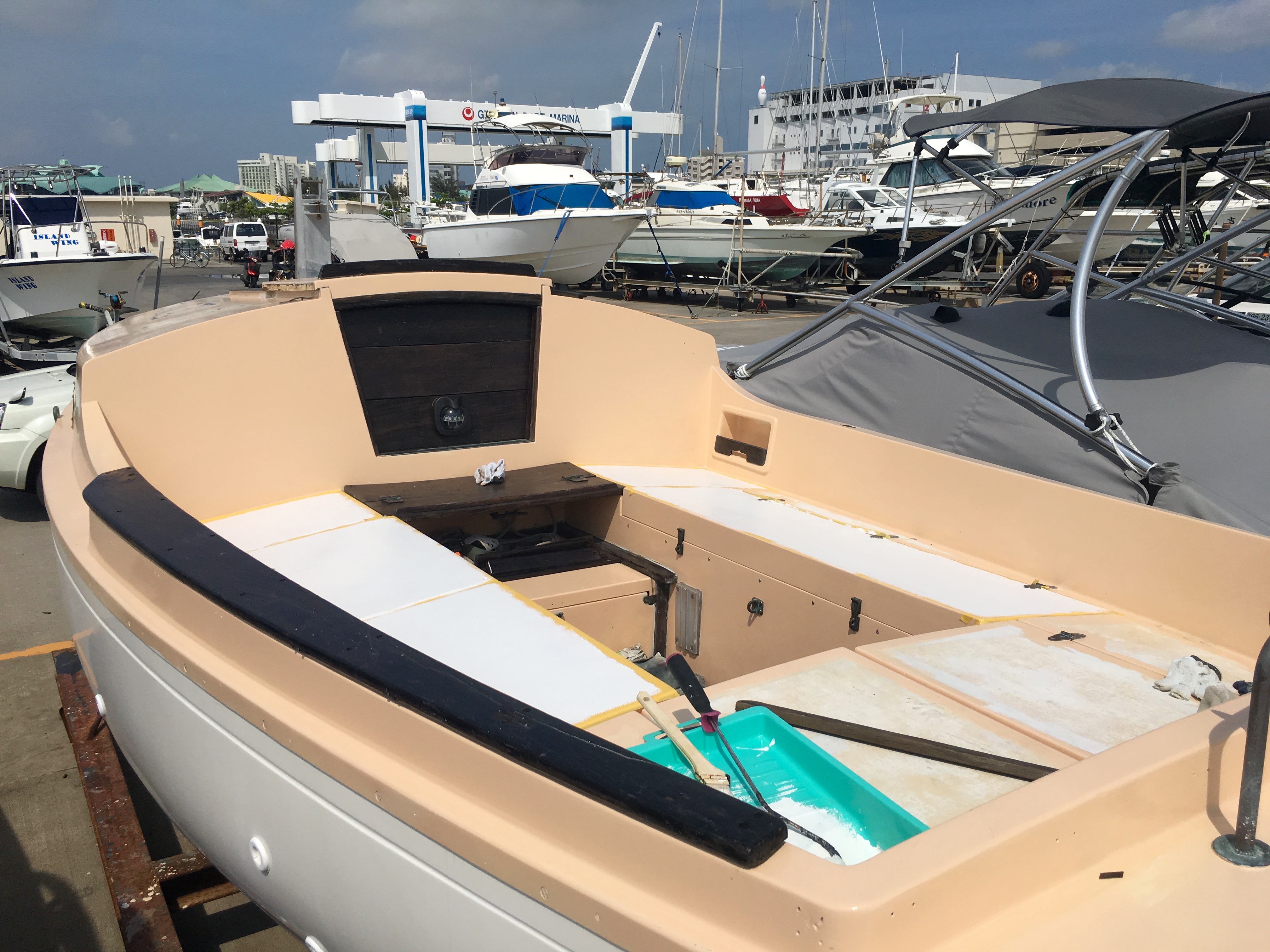I spend a lot of time taping off the areas that I will paint with anti-slip. This is a delicate job as the corners of said areas are rounded. It is difficult to tape arcs. I think up a very clever little technique, too complicated to explain here, which I think is going to work.