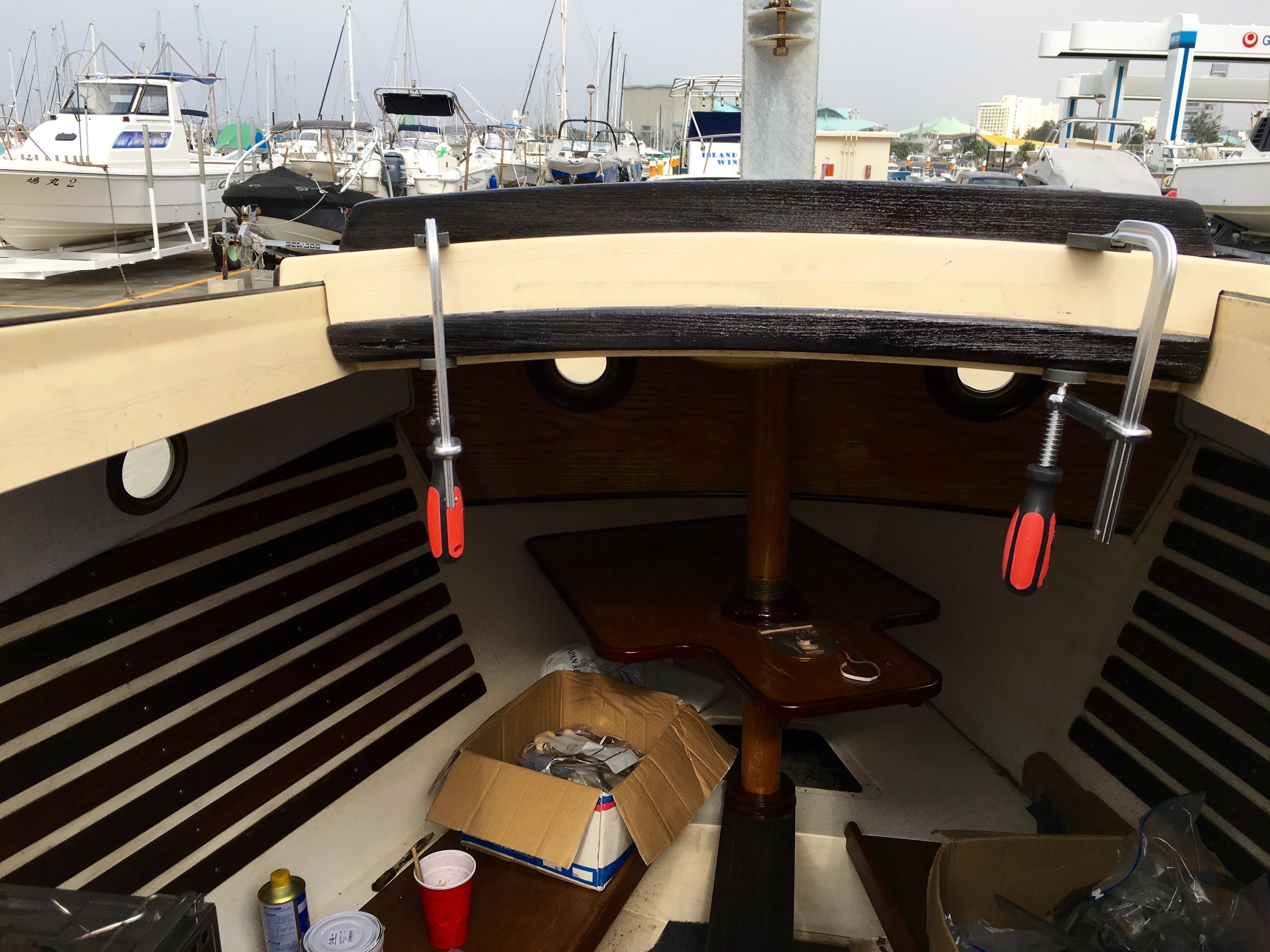 It takes me a while to work out why it blew off. I had taken off the trim on the sides of the hatch cover to treat and varnish them individually to get high class paint job effect. I only replaced one side before the boat was hoisted onto the high trailer, making it very perilous to work high. I did not replace the starboard side trim. I now know that the cover is held in place by these mahogany chiseled strips.The wind came and just lifted off the hatch cover like a kite. Rats!