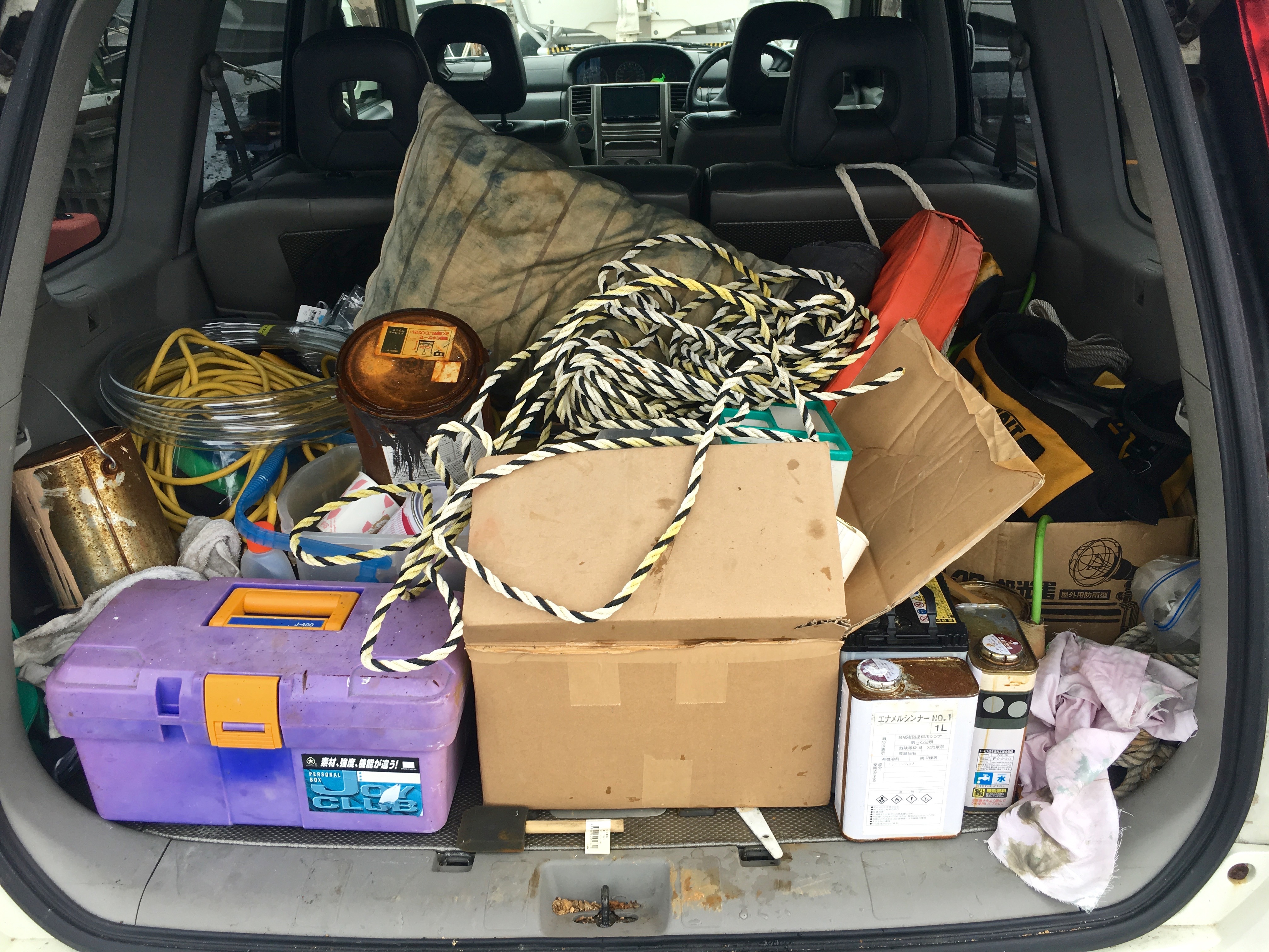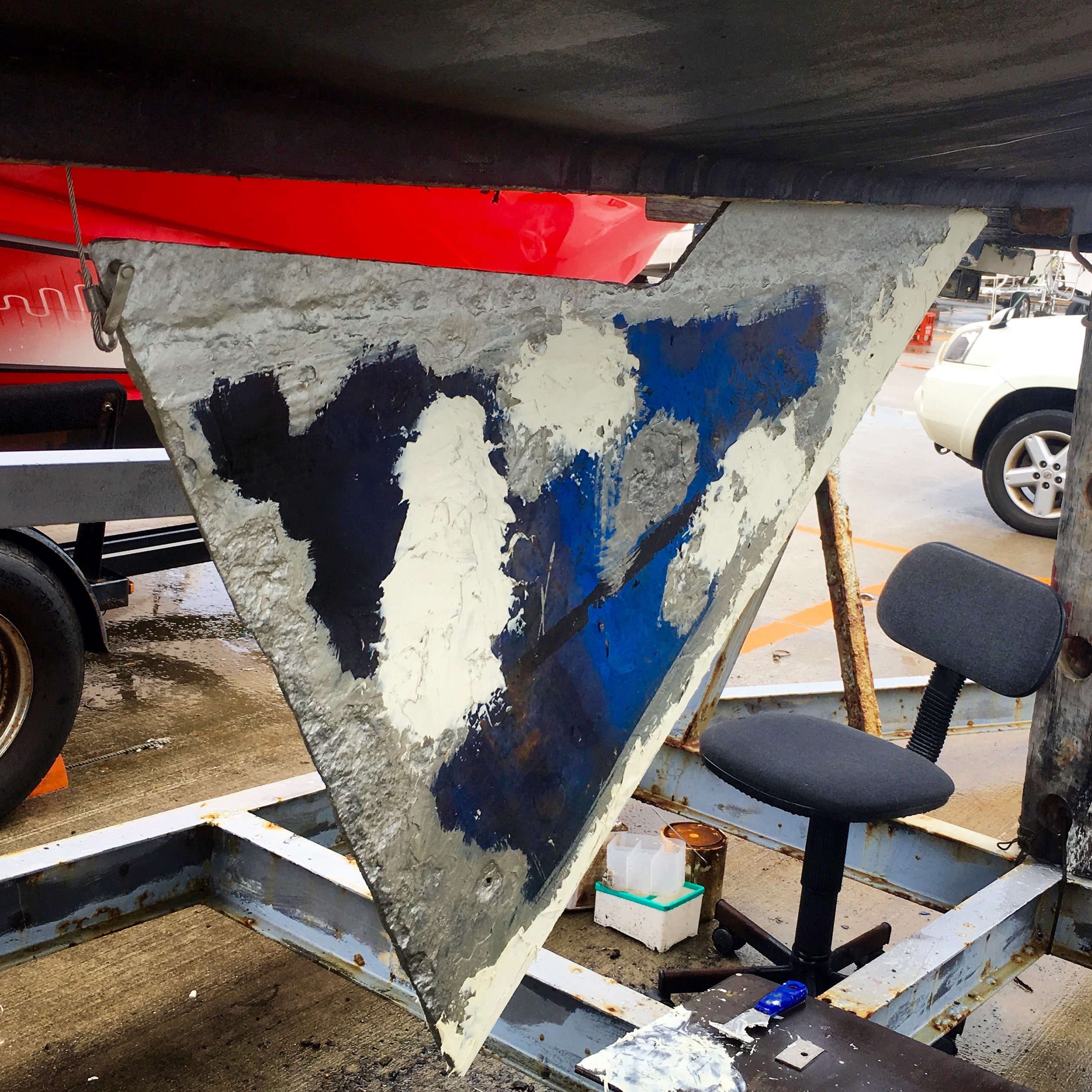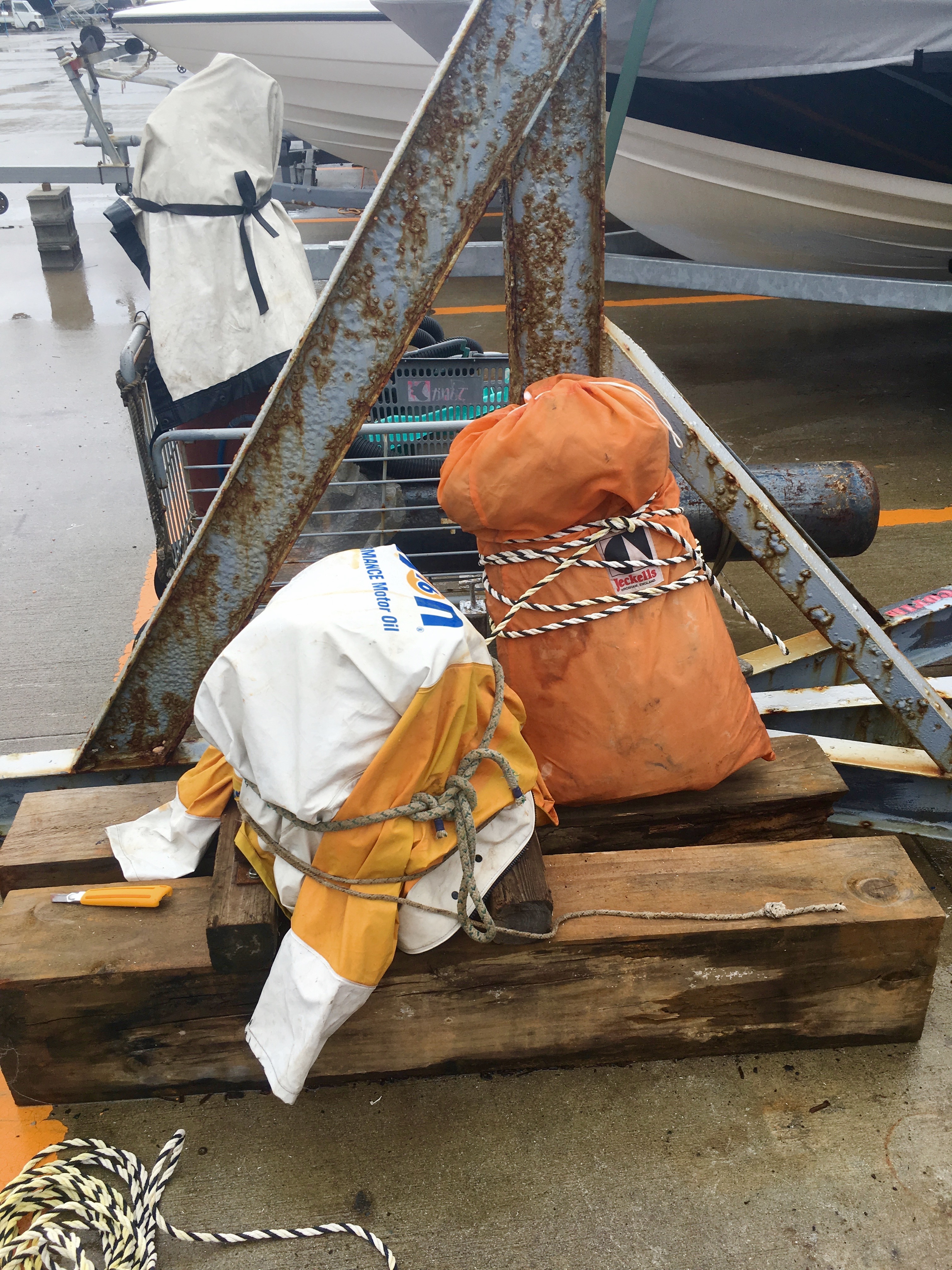 A baby, we think, typhoon comes in tonight so everything has to be lashed to something. I have ladders, old sail bags, masts, booms, gaffs, all of which I lash hard.