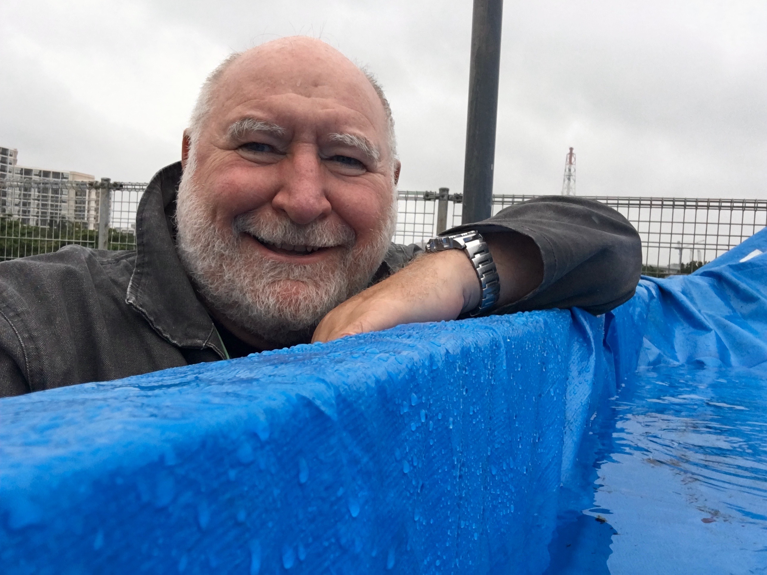 It is raining and there are swimming pools in the tarpaulin, however not in the boat. One good thing is I get to wear a Breton Sailor smock that my brother Ian sent me.