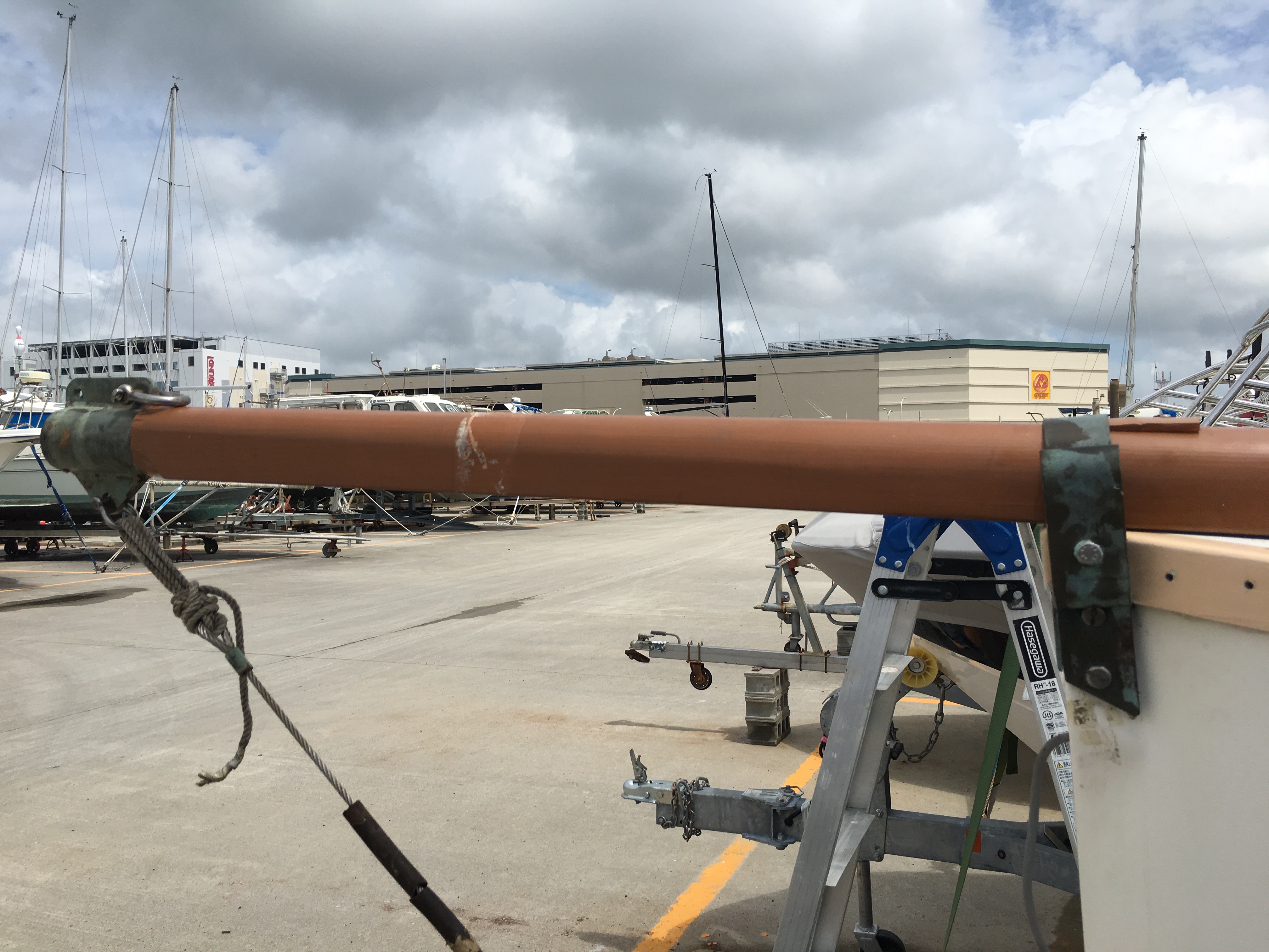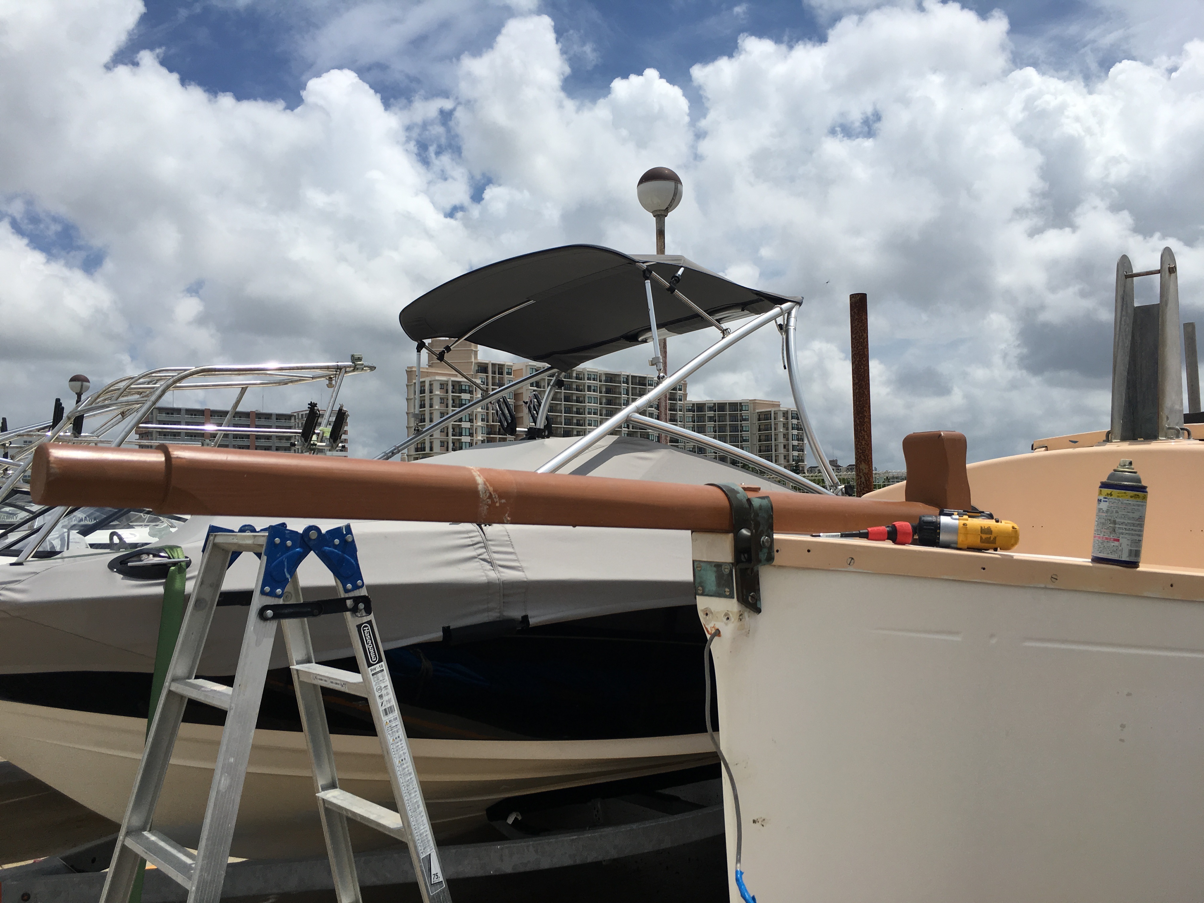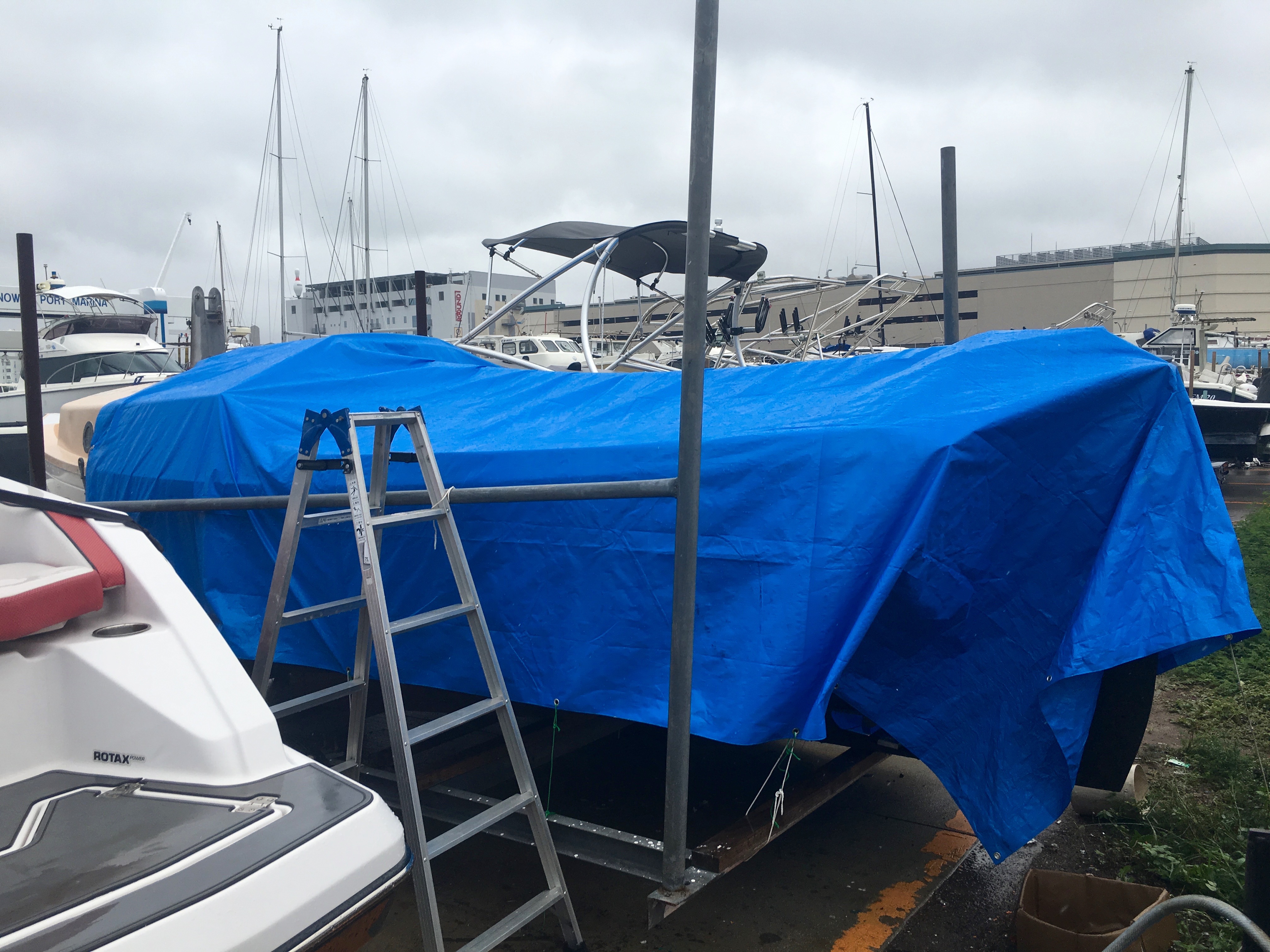 I knew that it would rain like crazy the night after we had re-trailered the boat. I am fed up with the boat filling up with water, so I rigged a big tarpaulin.