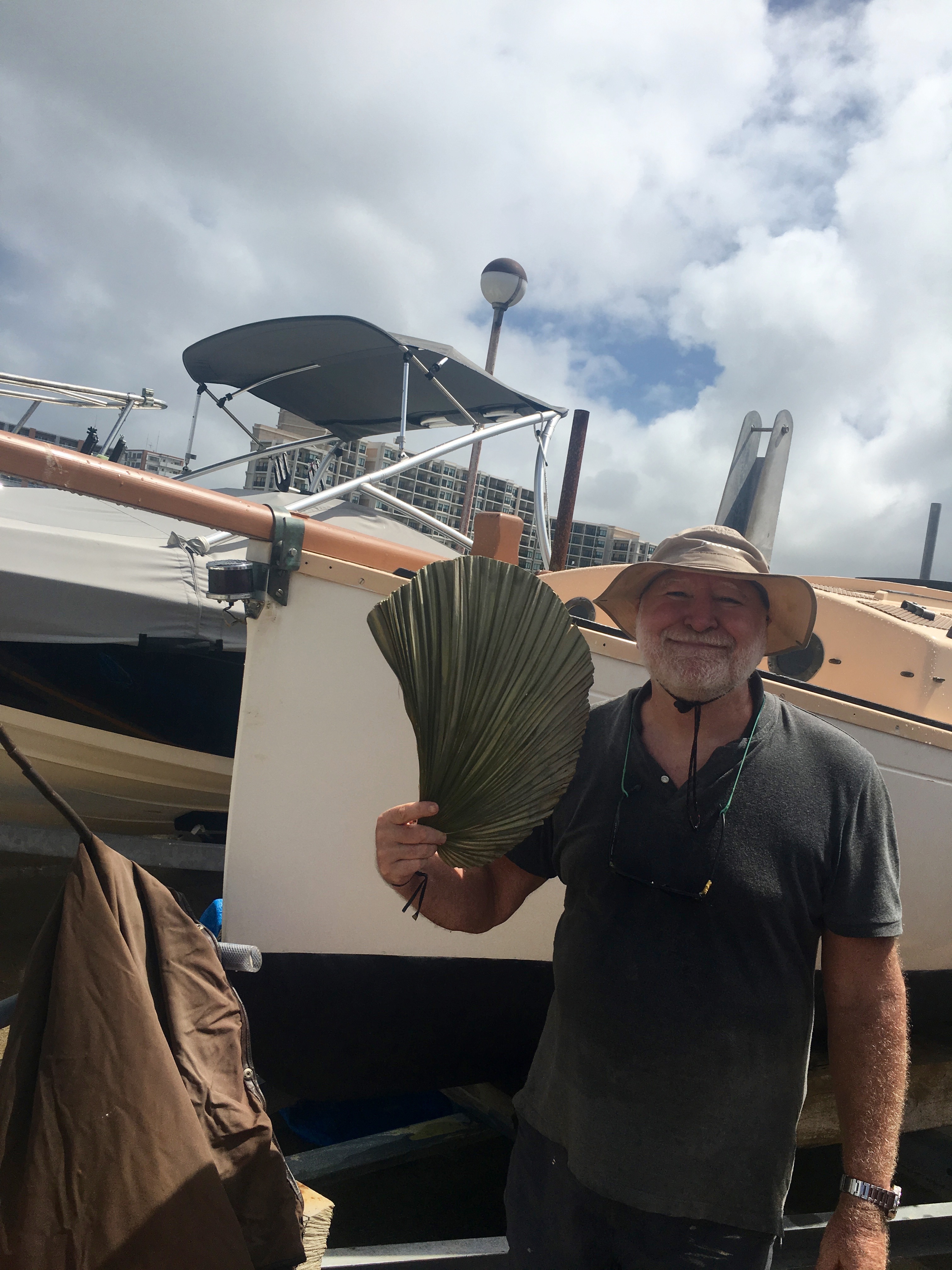 Kiyuna san passes by and gives me a palm tree fan. I need it. Aregato. My shirt is soaked with rain rather from sweat. Makes a change.