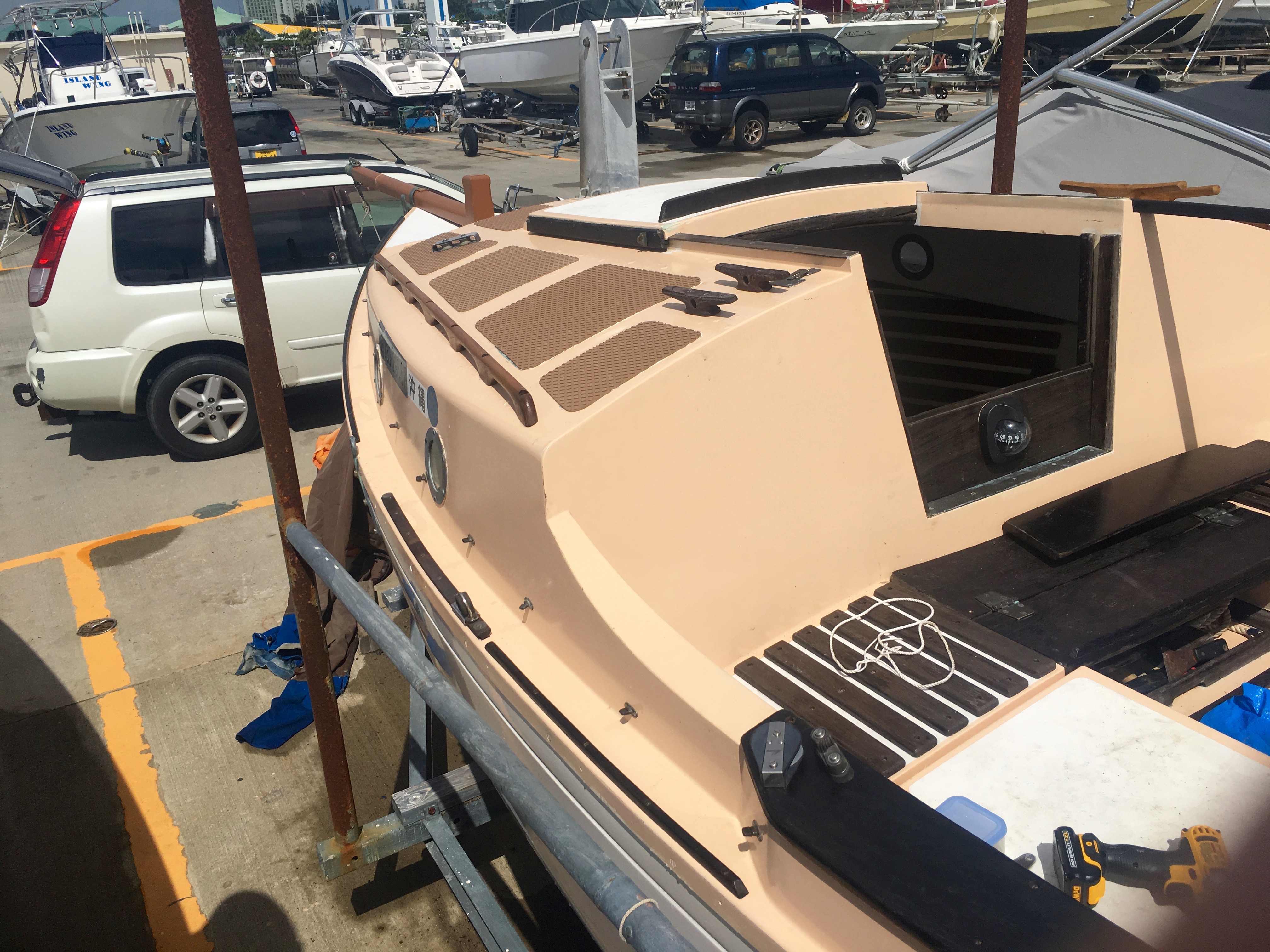 I have reached that glorious stage whereby, after months of washing, sanding, wood treatment, sanding, varnishing, sanding, undercoat, sanding, compound, sanding, painting, sanding, anti-slip paint; I can now start to put everything together.