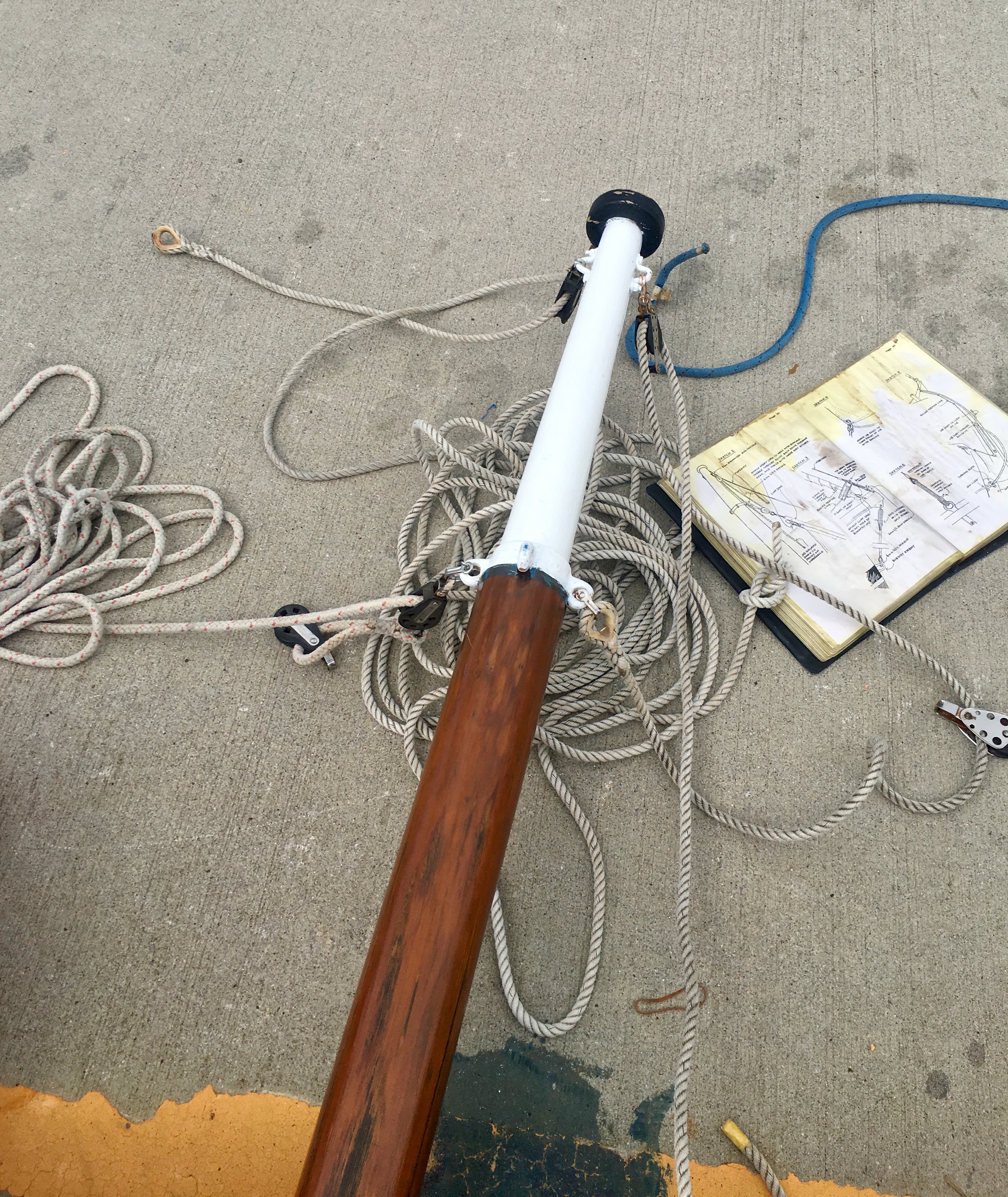 To raise and lower the sails you use ropes that are called halyards. To make the halyards work efficiently there are complex arrangements of pulleys. I try to figure it all out. Once I have understood, I will replace all the rope.