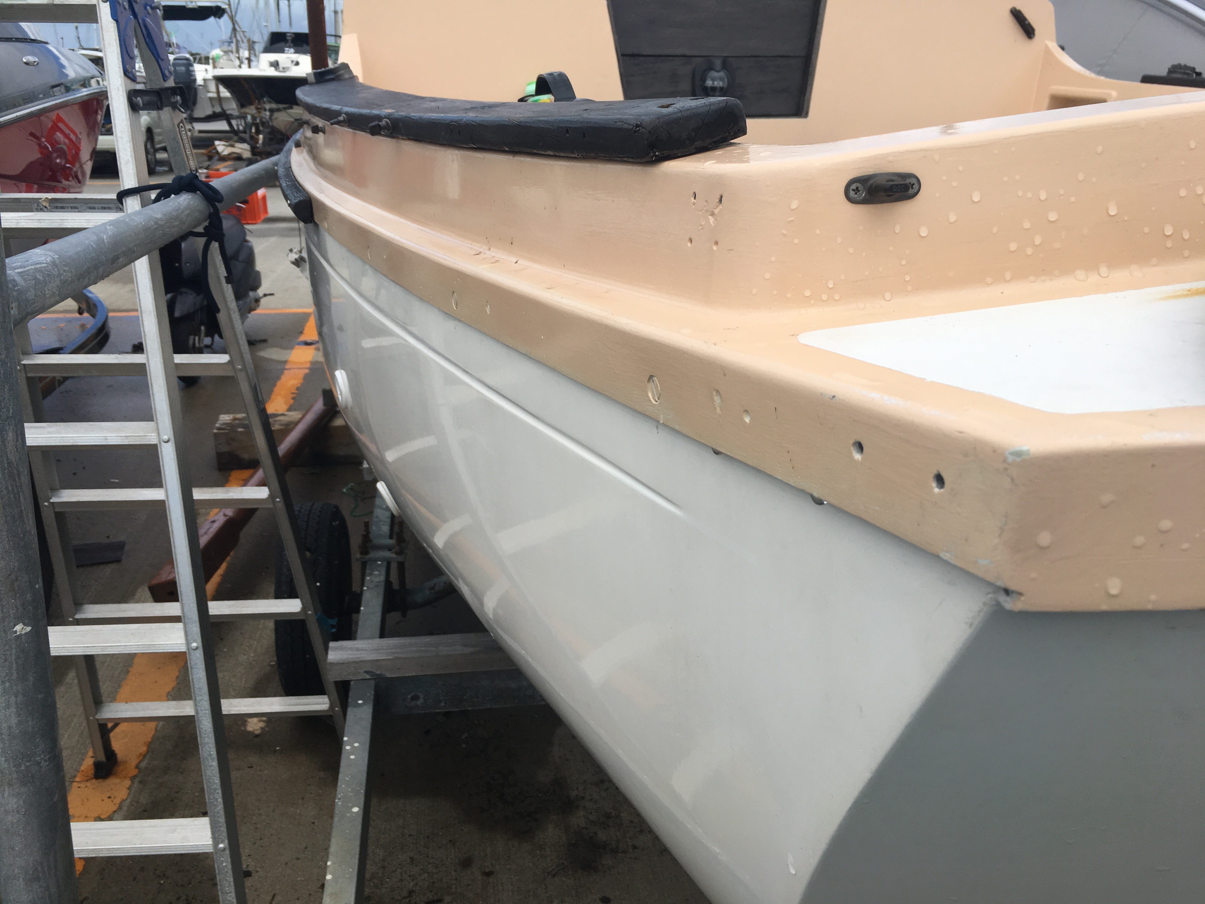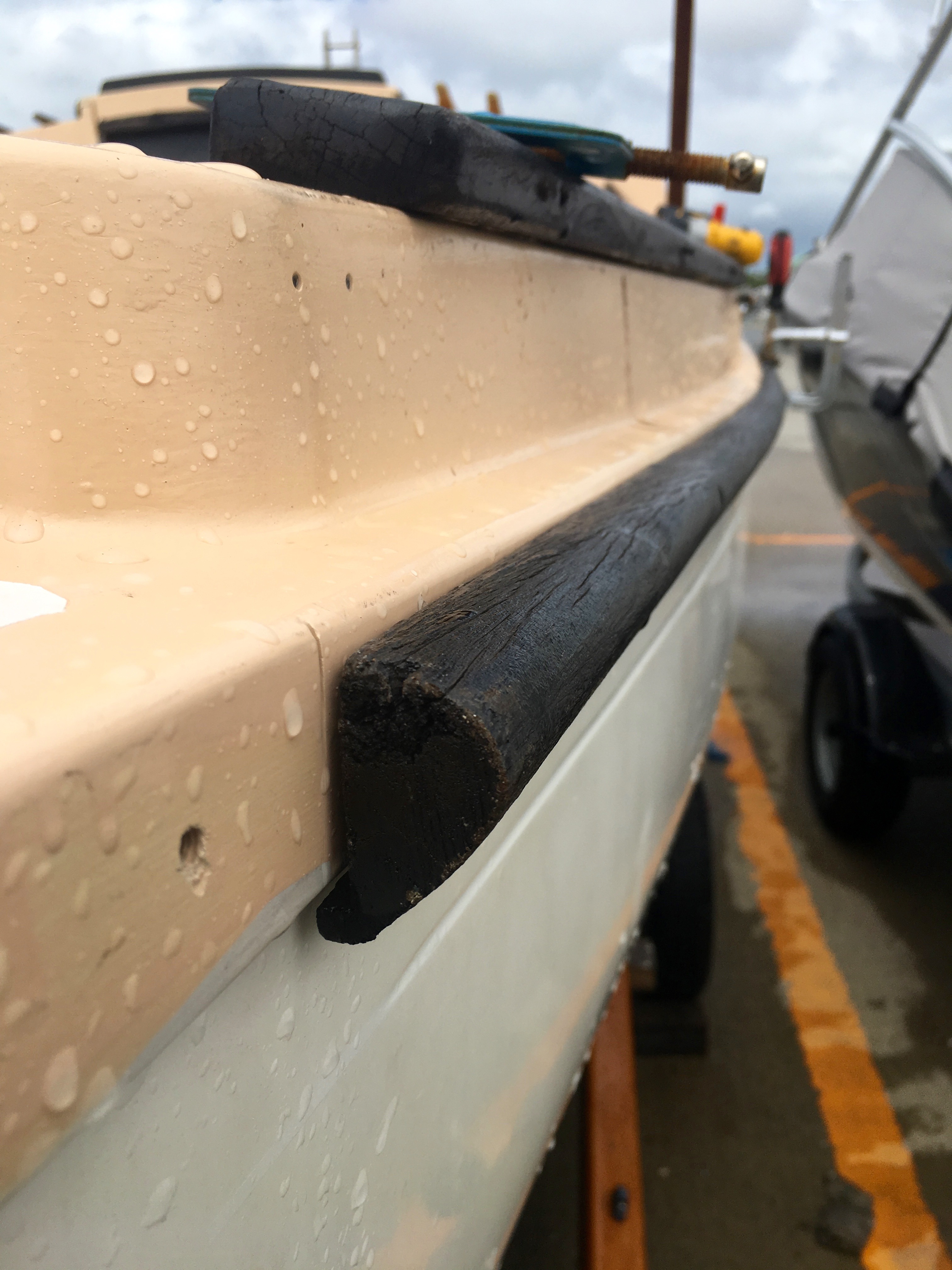 There are long strips of trim that attach to the gunwhale, bits of which have gone missing over the years.