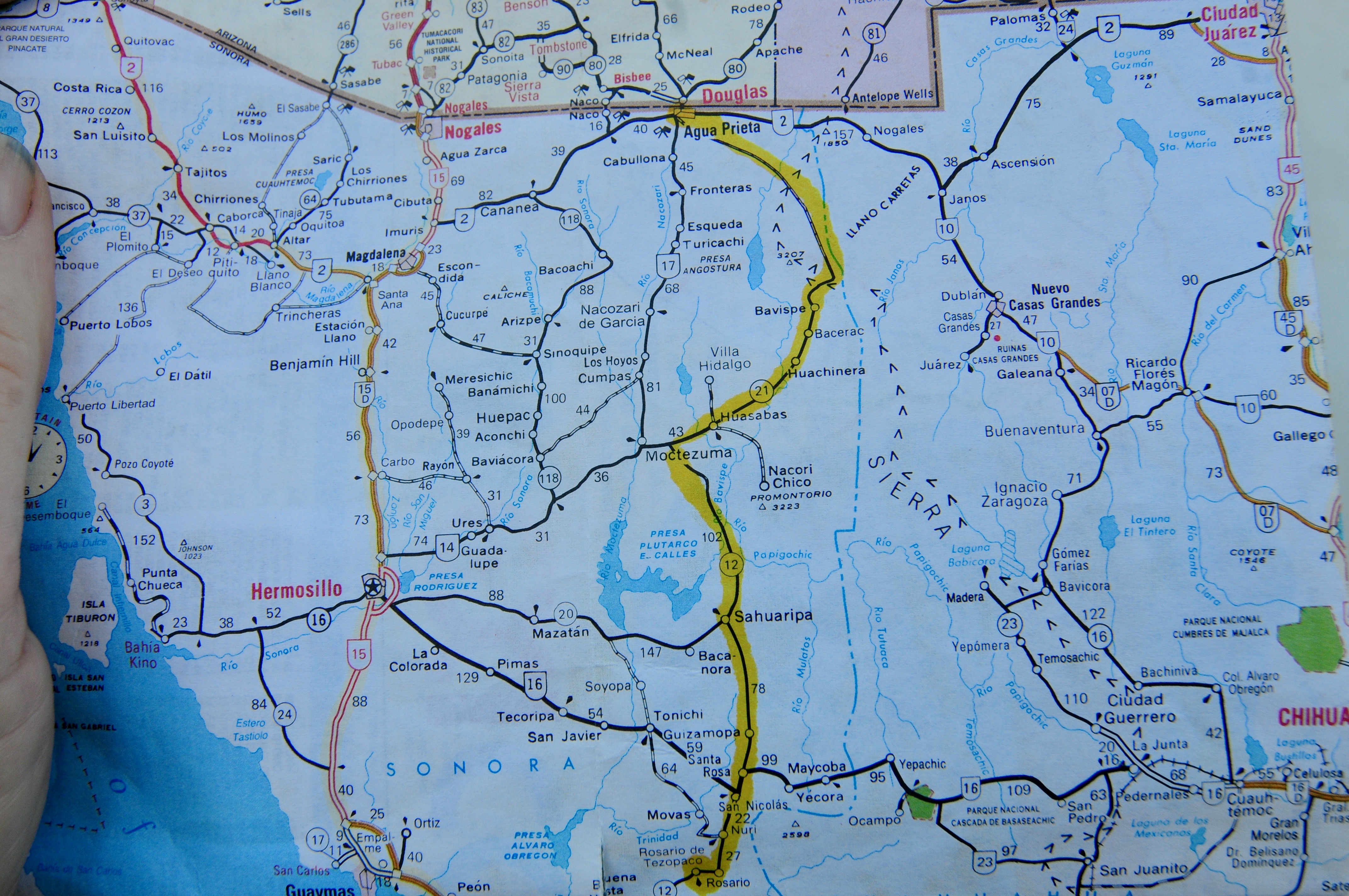 “Hola. Donde es Sahuaripa?” He points in both directions.