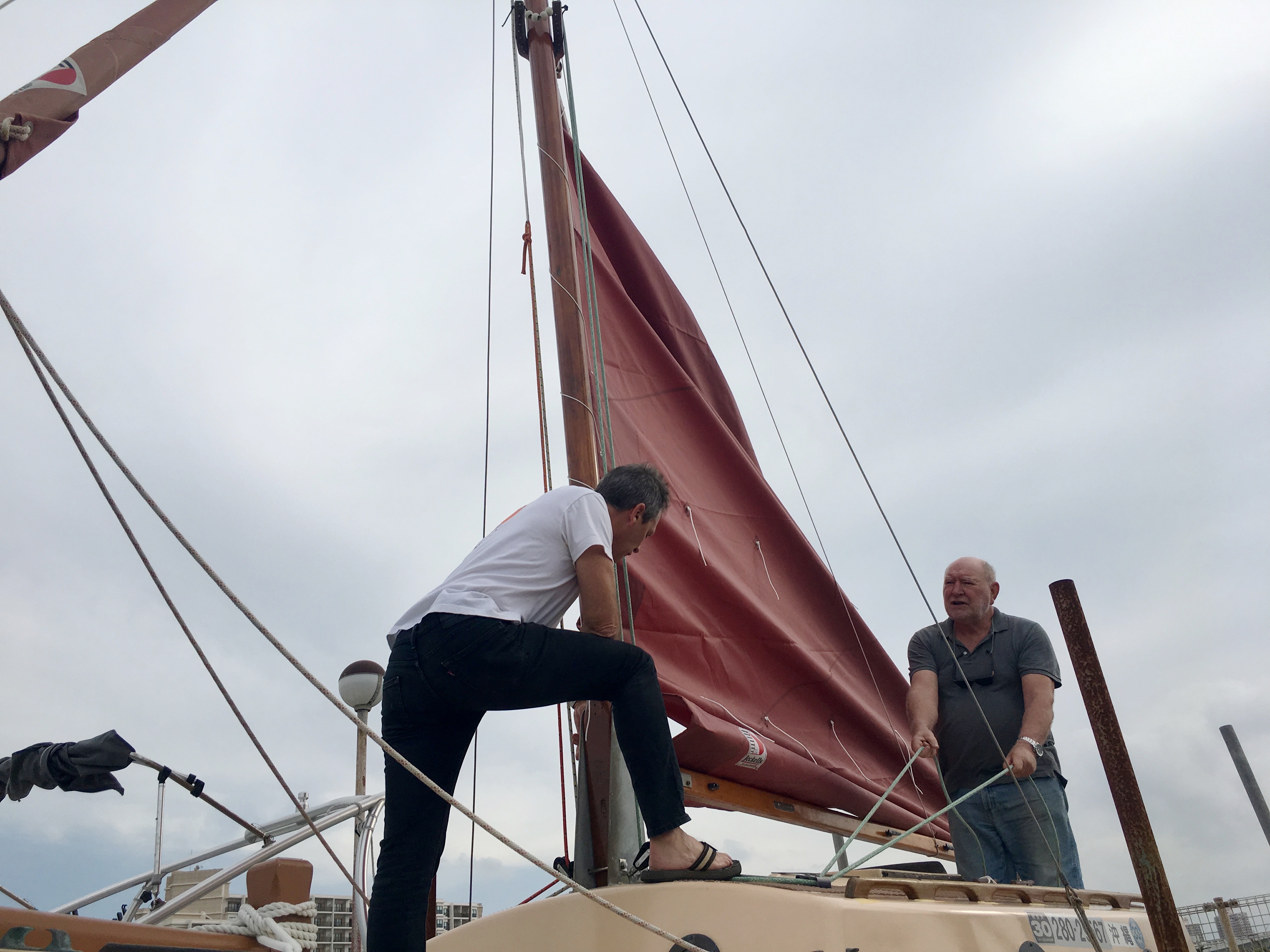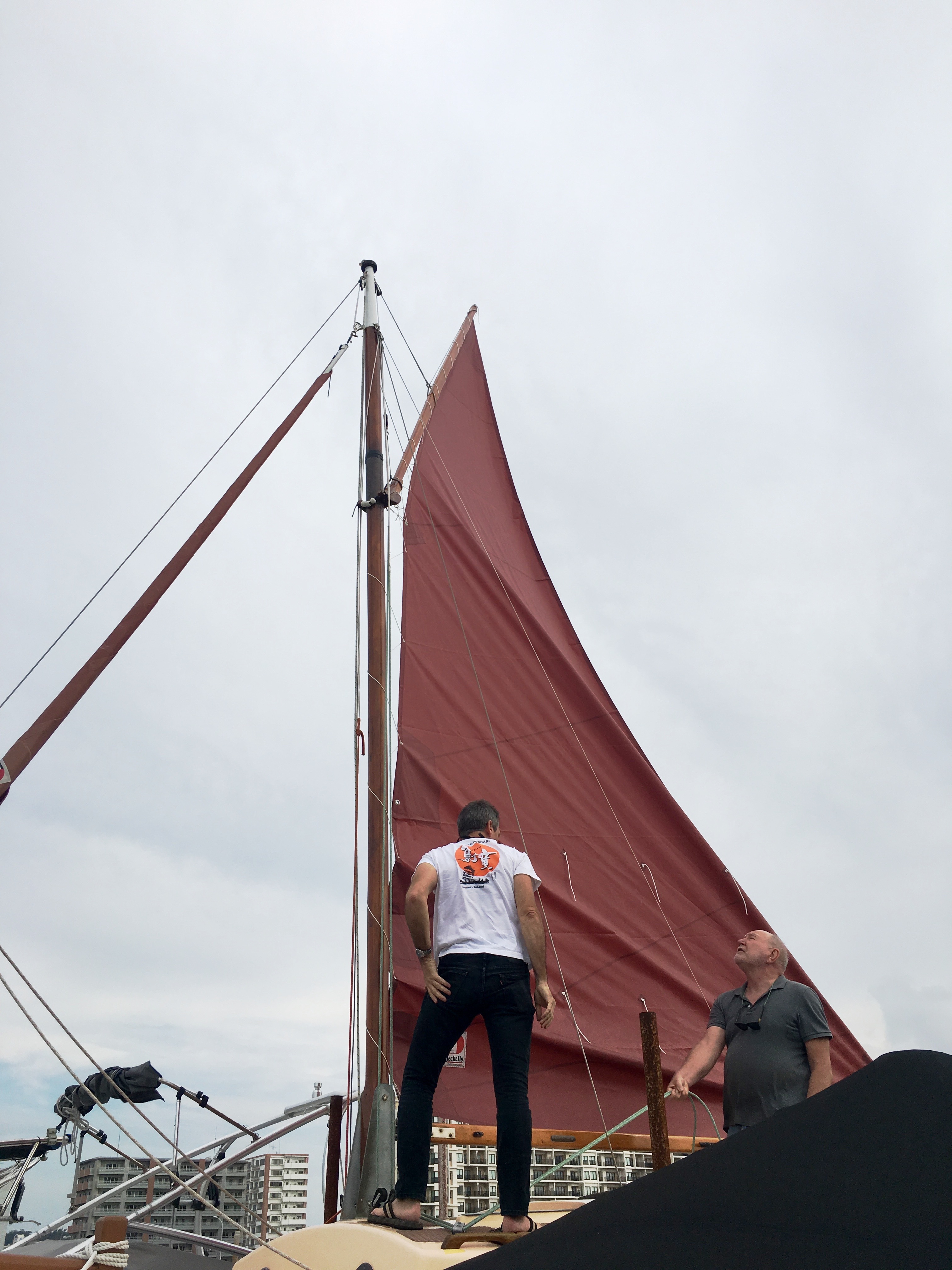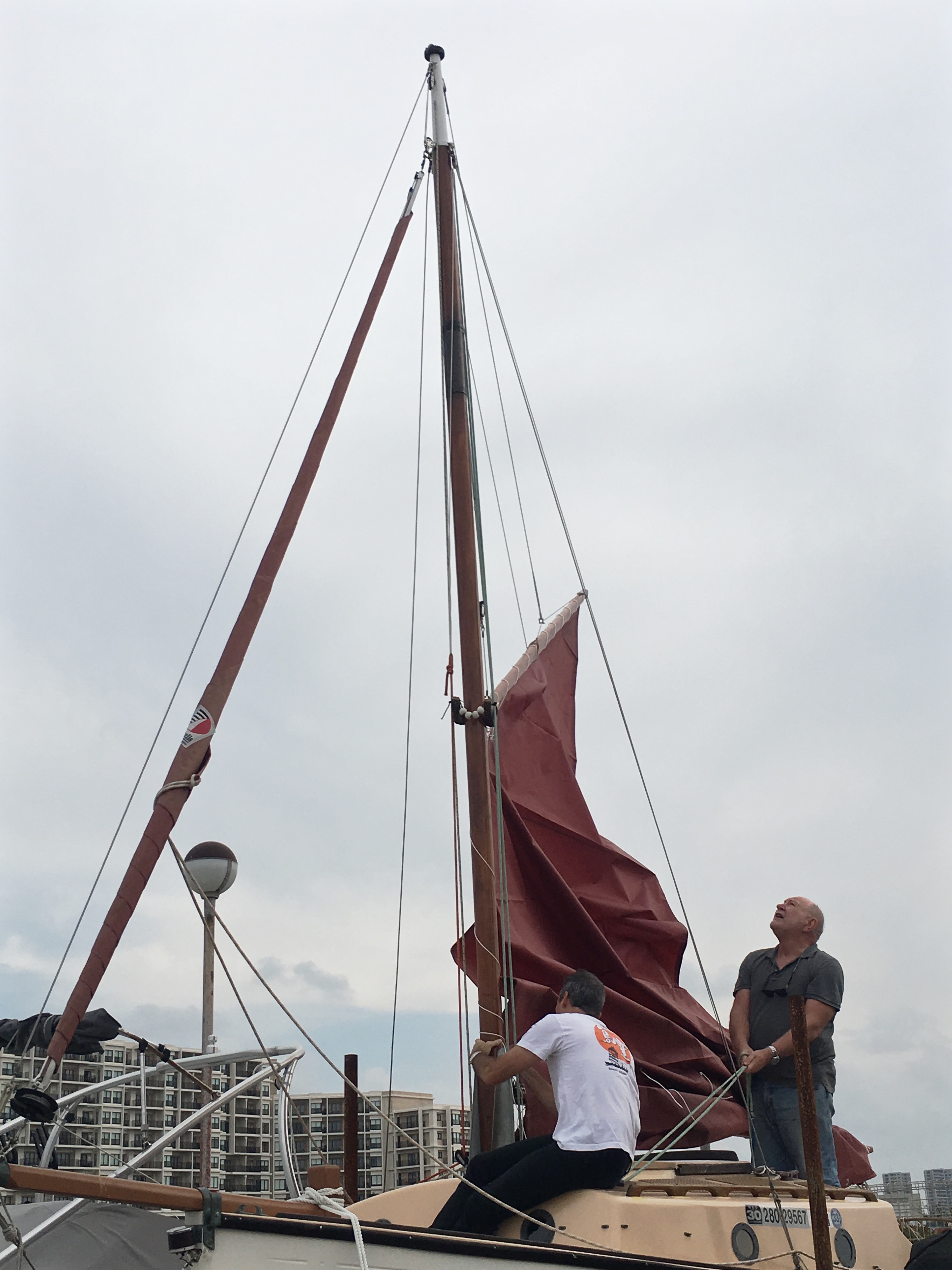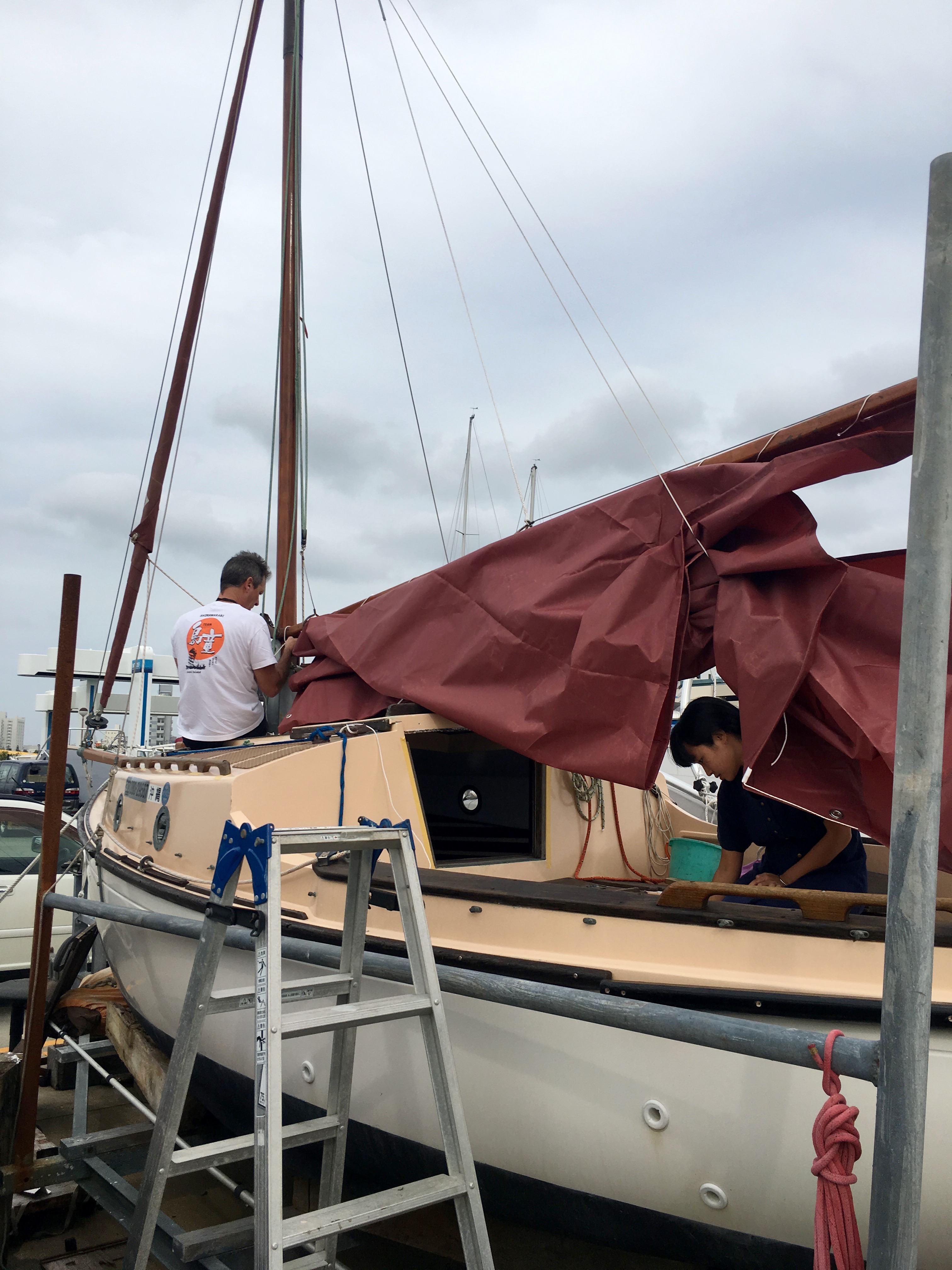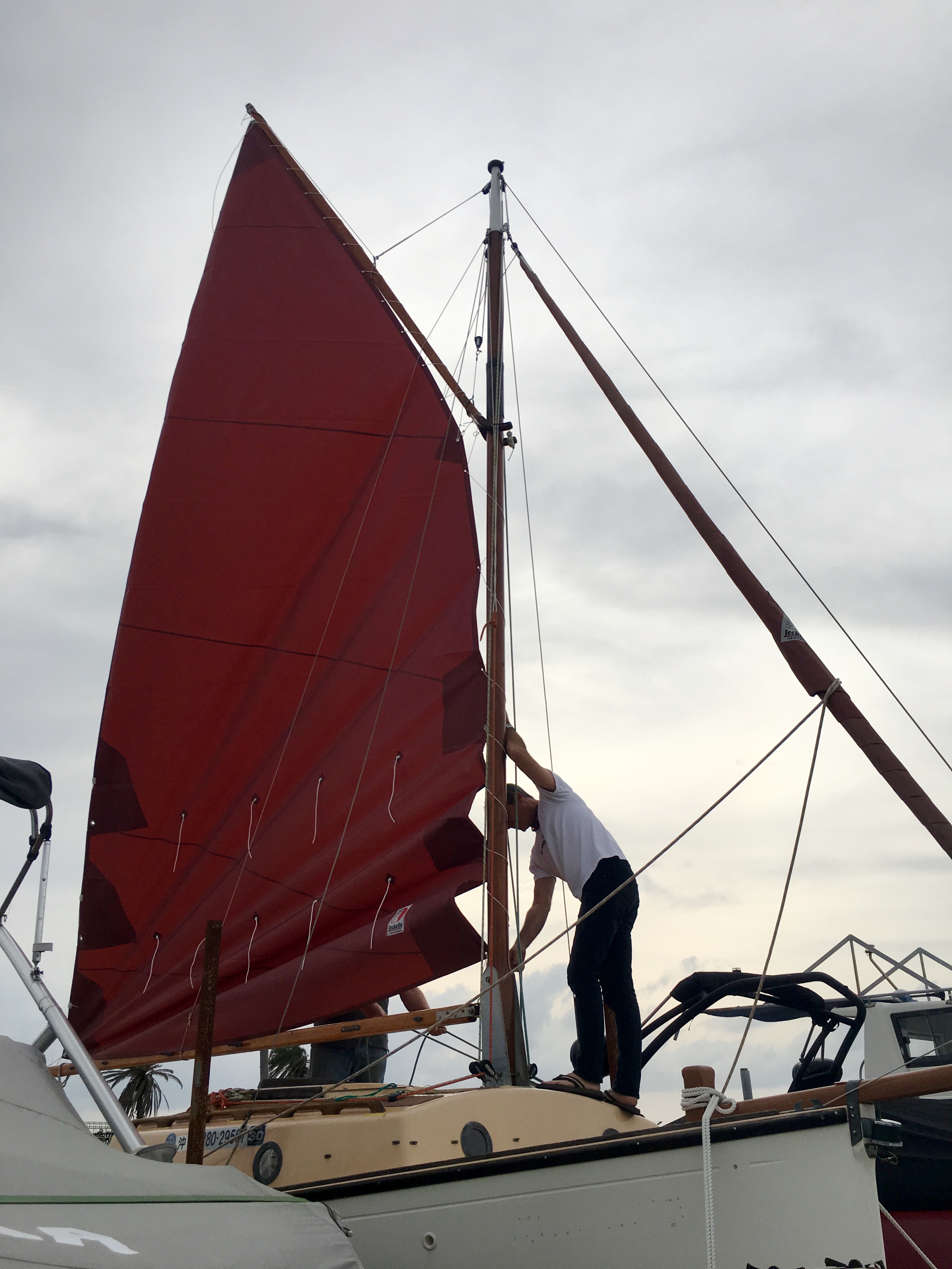 The sail is on, but badly. I will spend the next days in trying to improve the way the sail is set. Yay, Harry and Eri!