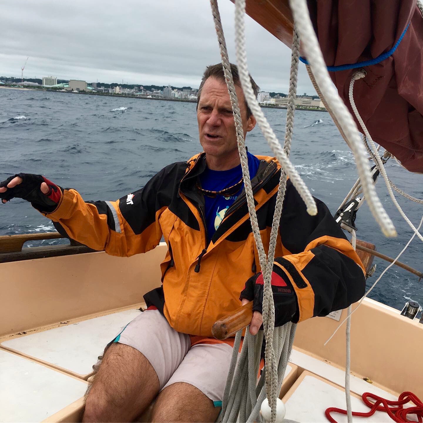 Harry comes down. It is Saturday, but apart from that it is a very un Okinawan day. It is spitting with rain, very grey, with high wind and an inexplicably broken sea. We take the boat out anyway as I am determined to set the sails.