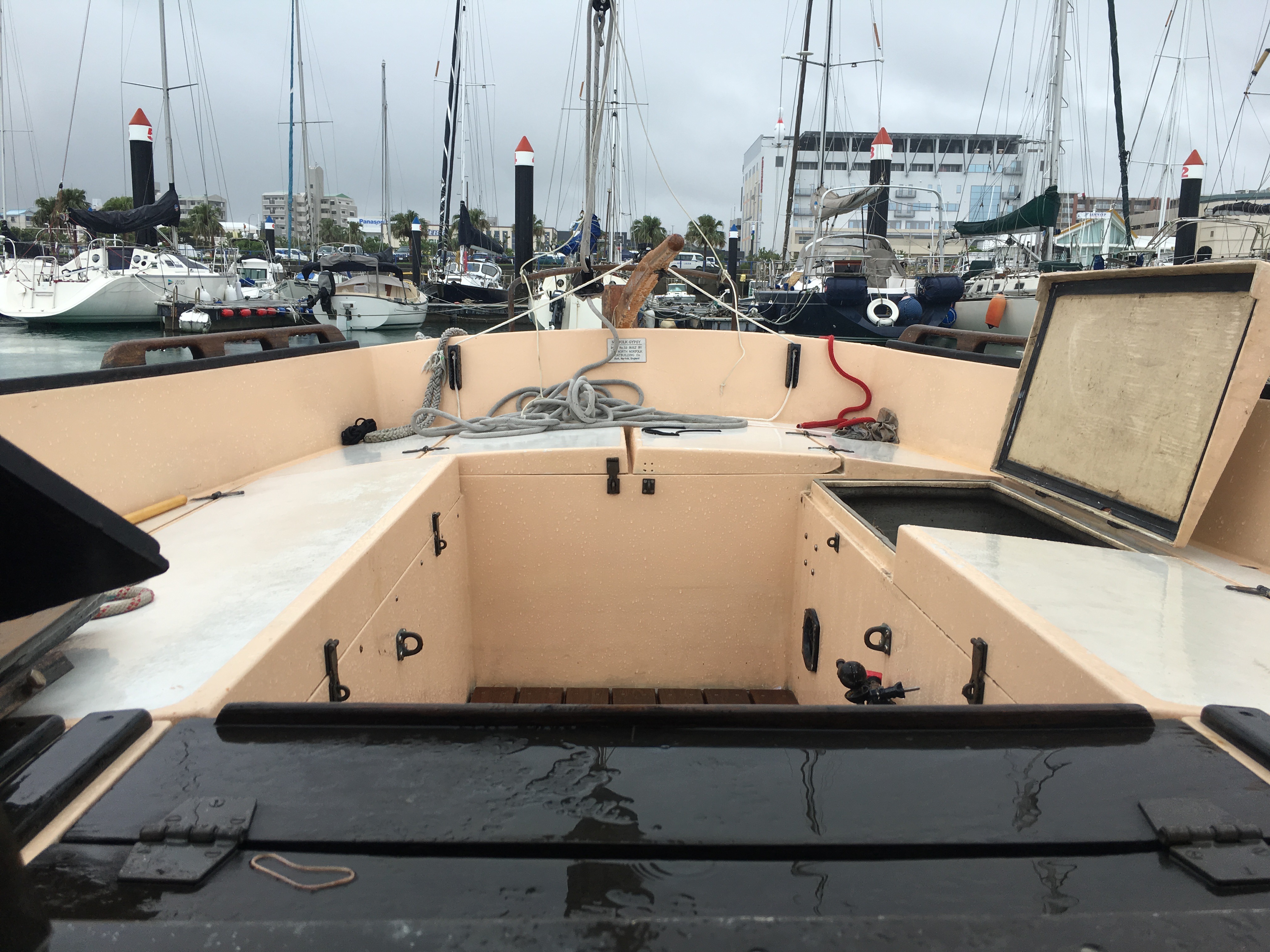 The rain goes on and on. I realize I have to fabricate a low lying cockpit cover to try and keep the majority of the rain out of the cockpit. Off I go and set to work. I also charge up the second battery. I have a major phobia of the battery being flat as I am blown onto a lee shore and so being unable to start the engine. Accordingly I have two batteries both of which I charge obsessively.