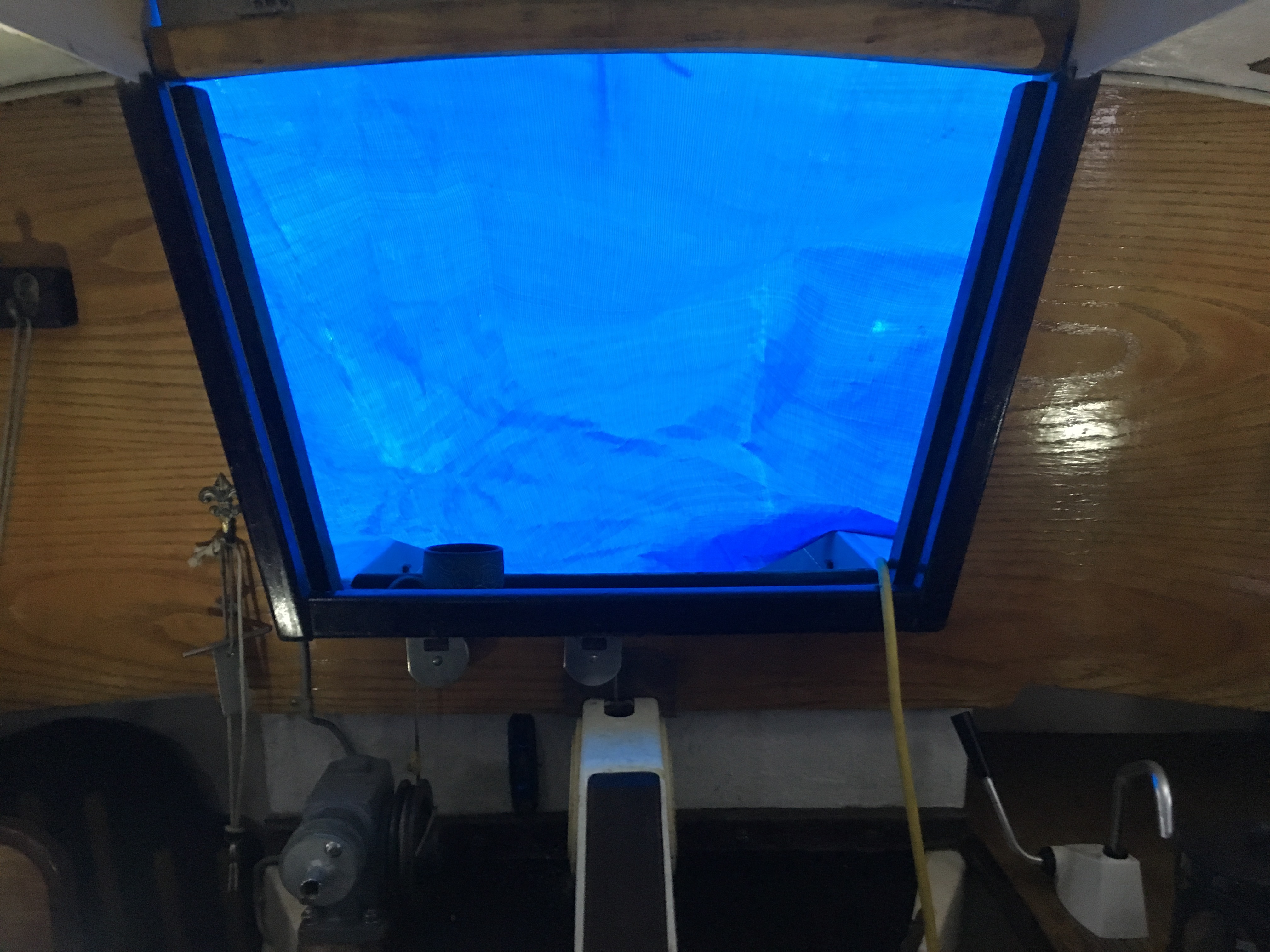 It is very damp, hot and dark but I scurry around cutting a tarpaulin to size for the cockpit cover.