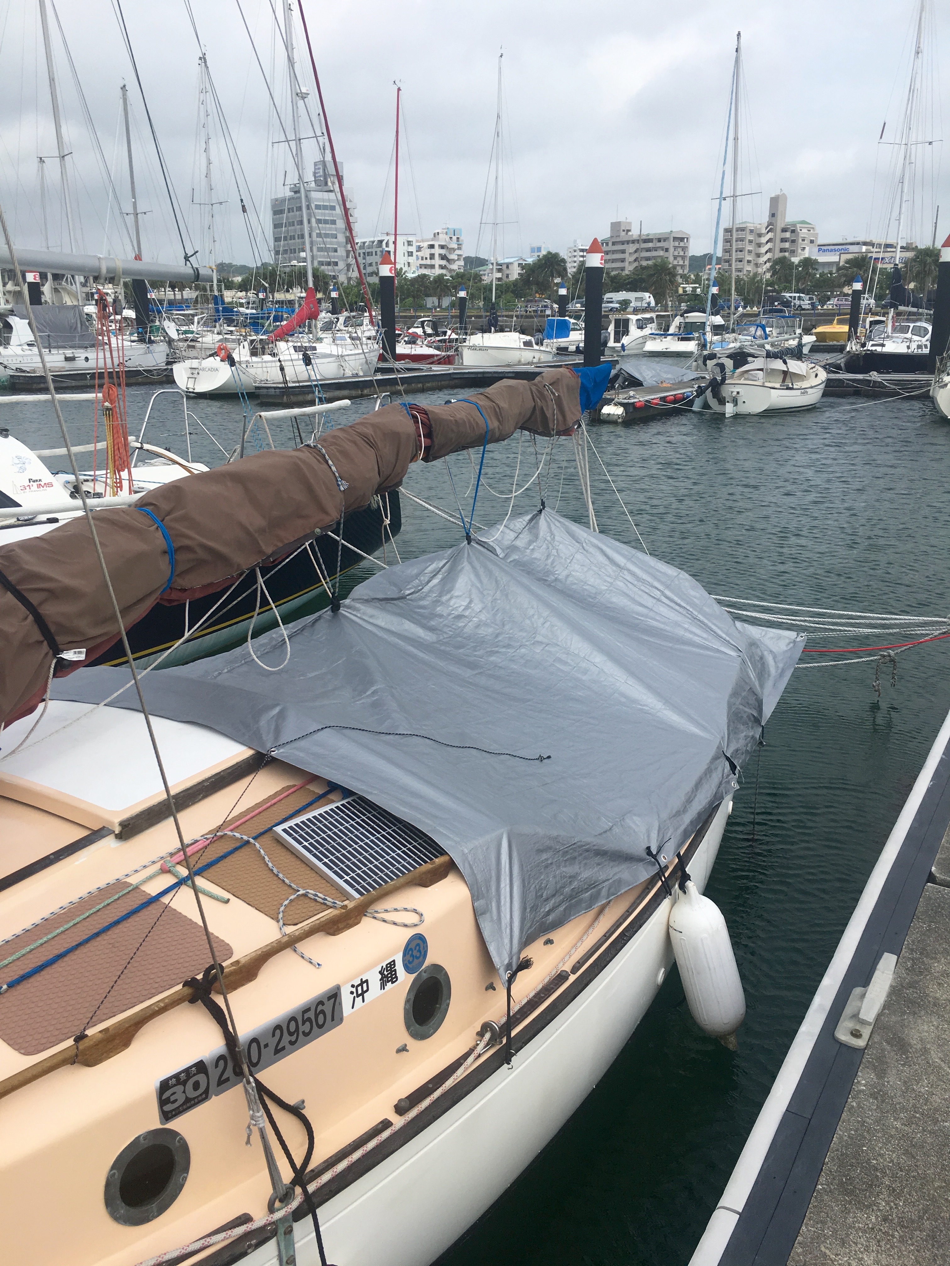 The typhoon rips out the eyelets that hold the ropes that connect the cover to the boom. The boat fills up with water, as usual.