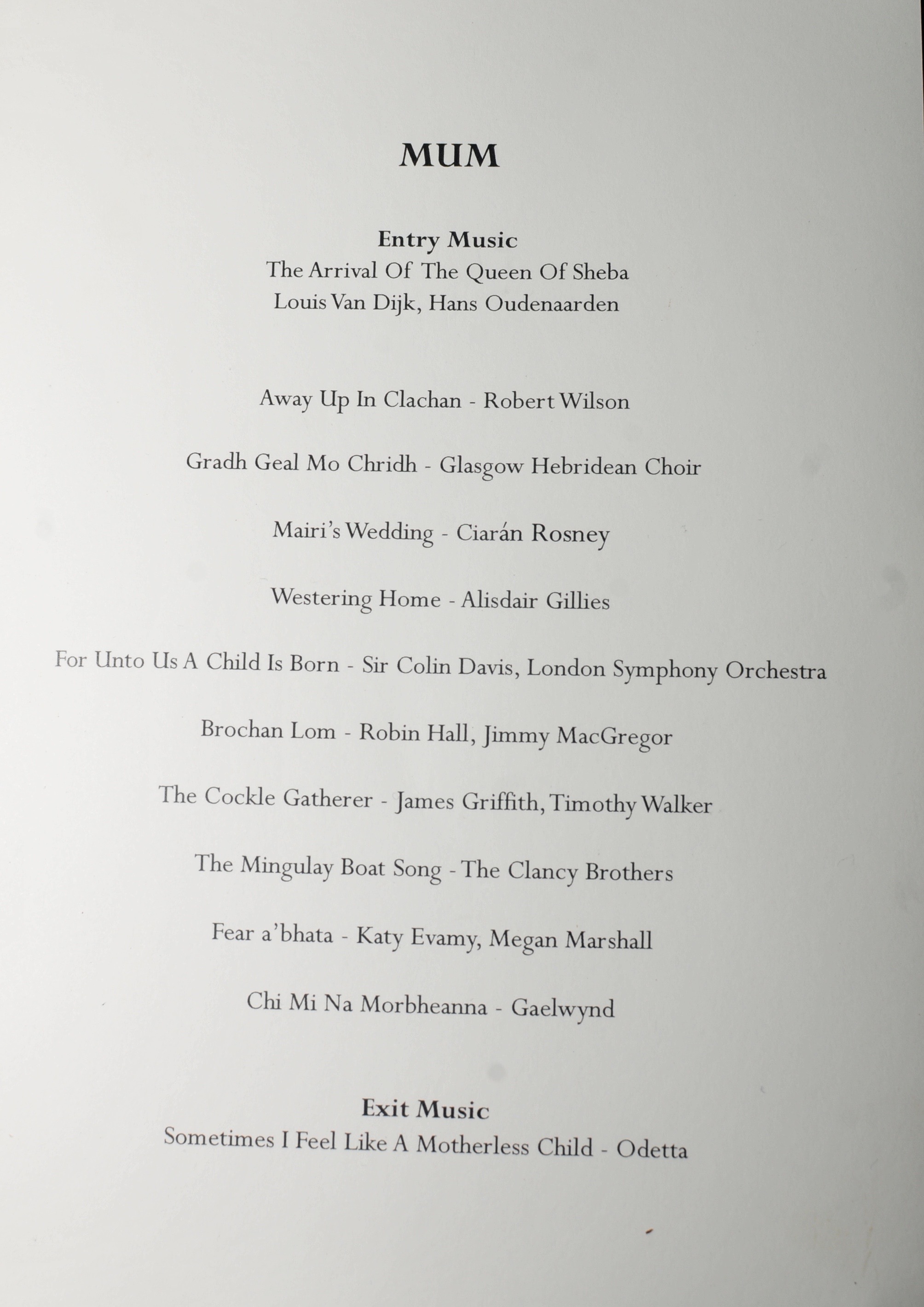We sat in the cremation parlour and sang and listened to songs that Mummy liked.