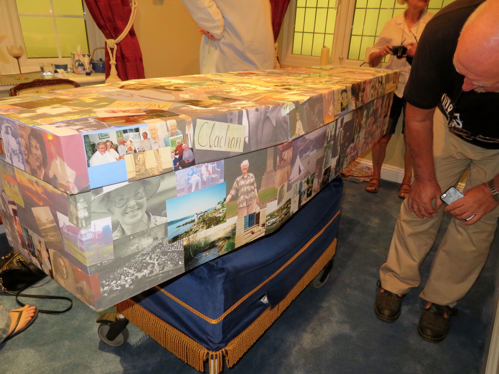 We, my sister and brothers with partners met the day before the cremation to decorate the coffin with hundreds of photos that spanned my mother’s life. This was a good event as we discussed each photo, ooh’ed at photos we had forgotten, marveled at her beauty as a young woman. With wars, uprisings, 4 children and so much more; she had an amazing life. It brought us very close together. Thank you Rosy for coming up with the idea.