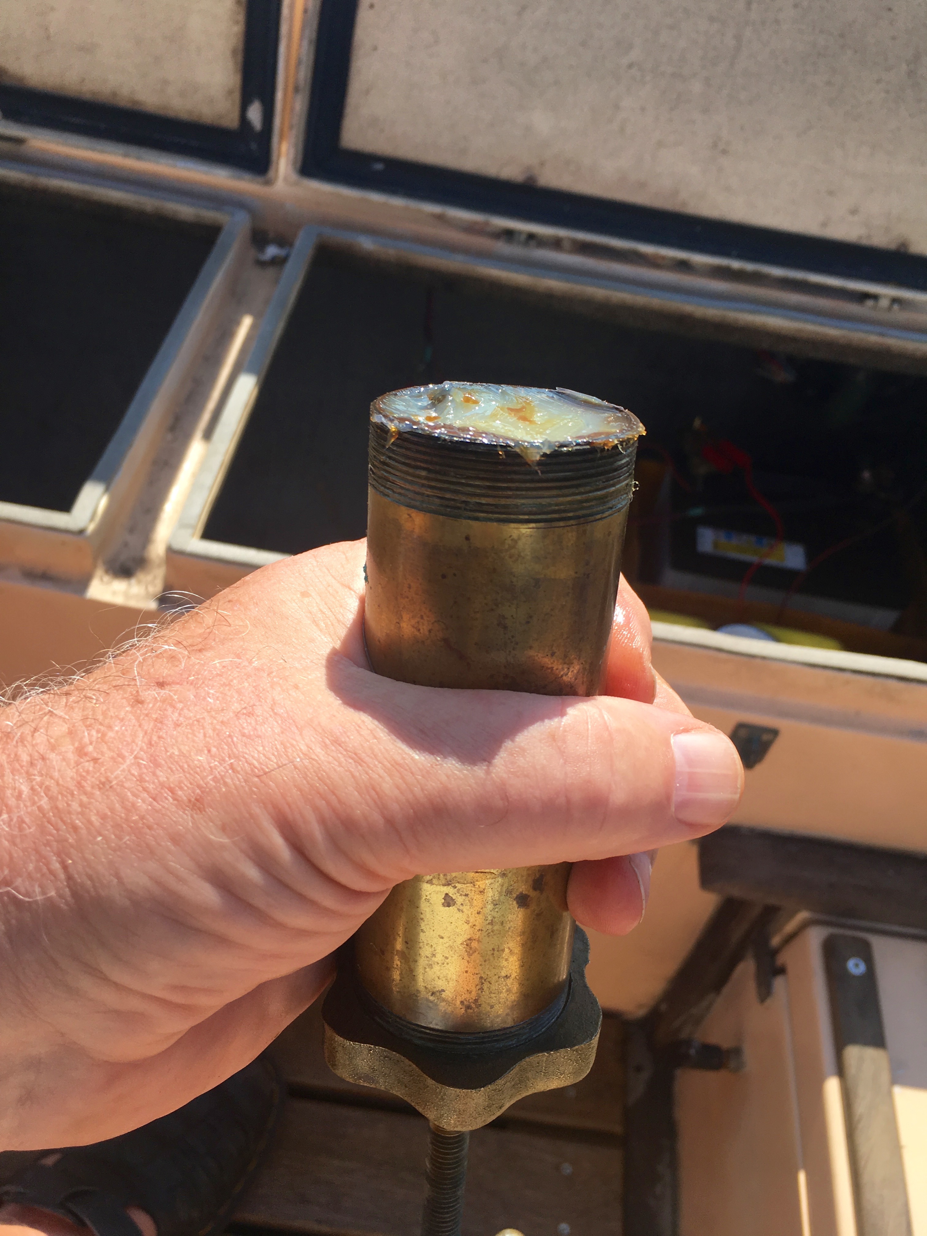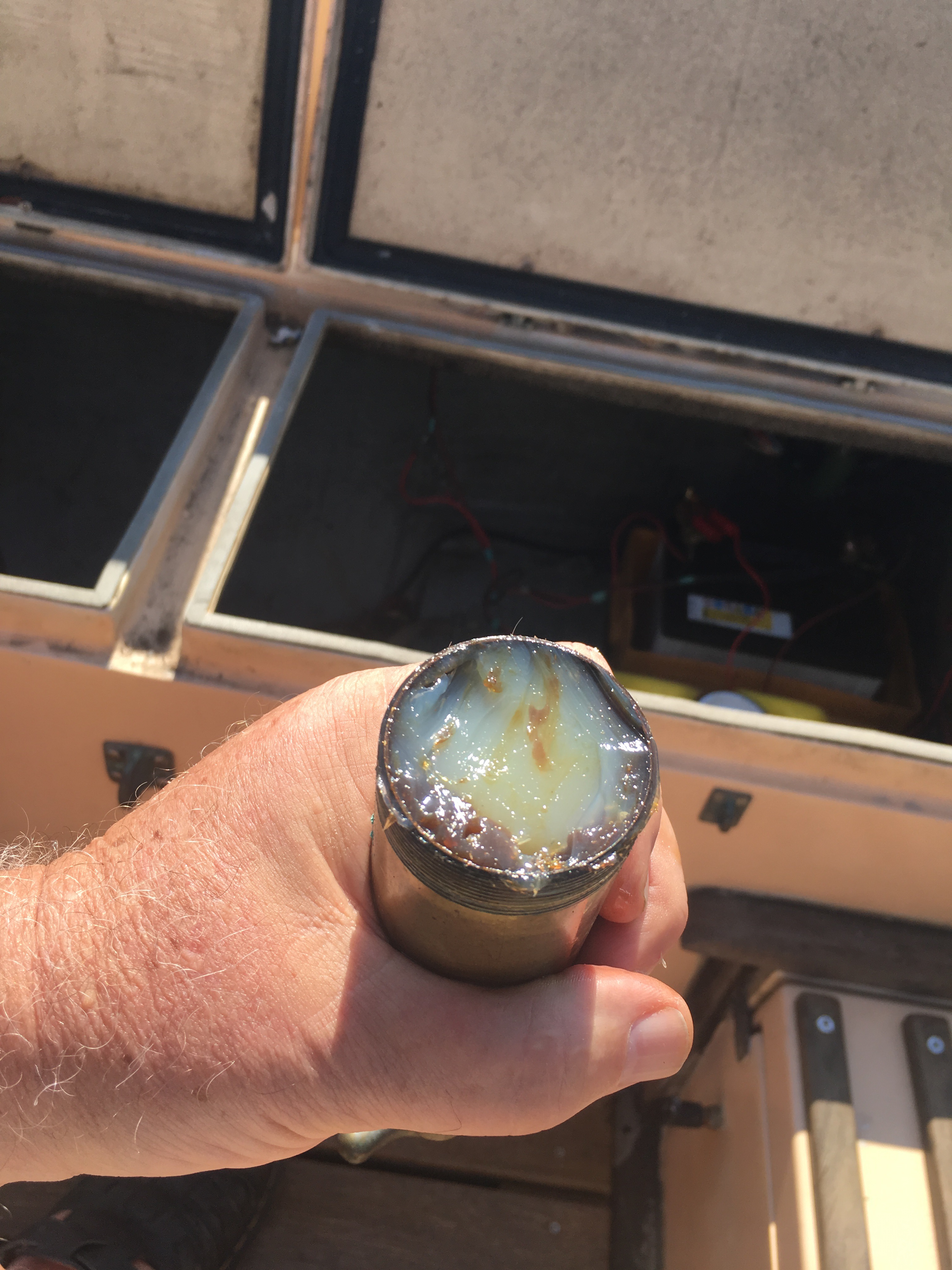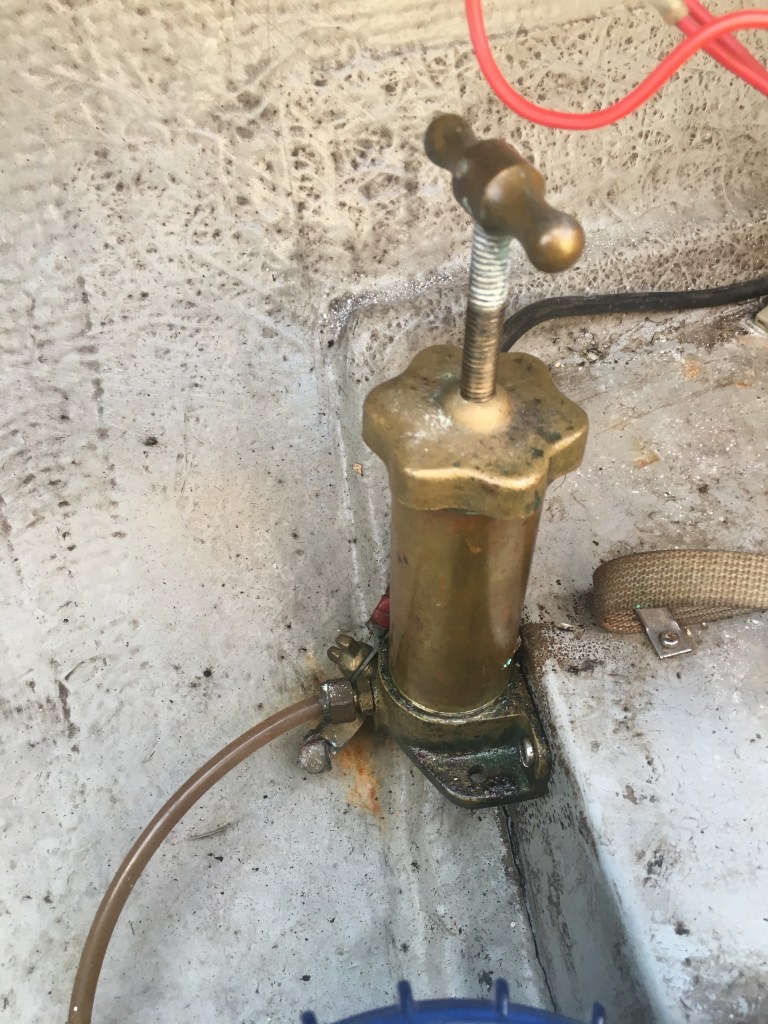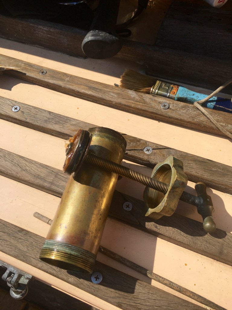 The propeller shaft passes through the stern tube and in the stern tube there are bearings that allow the shaft to spin freely, er I think. The tube has to be packed with grease. To do so, I use one of my favorite systems on the boat, the stern tube greaser. It is very Victorian article made of brass which, when you turn the handle on top, forces grease through a pipe into the stern tube.