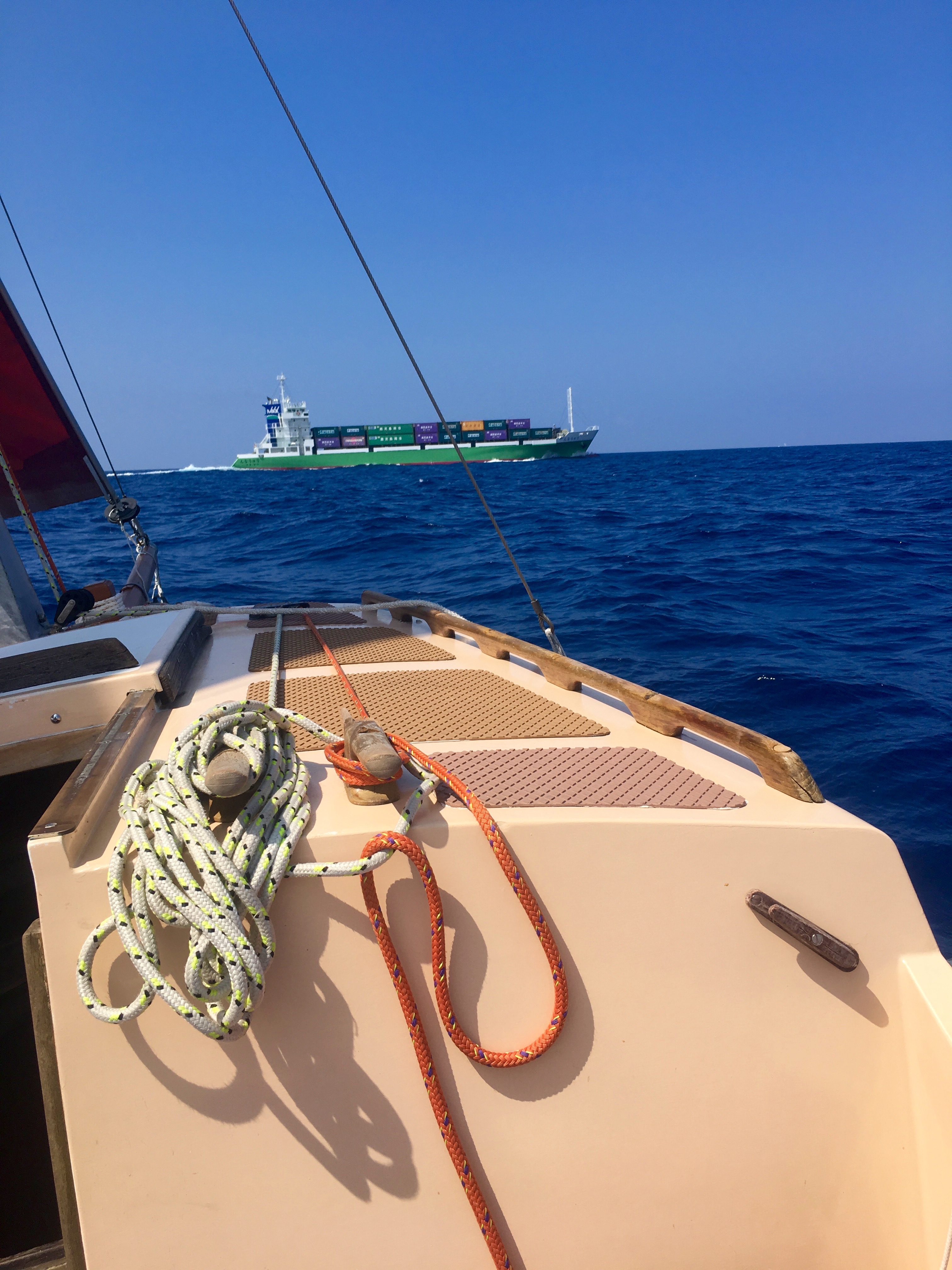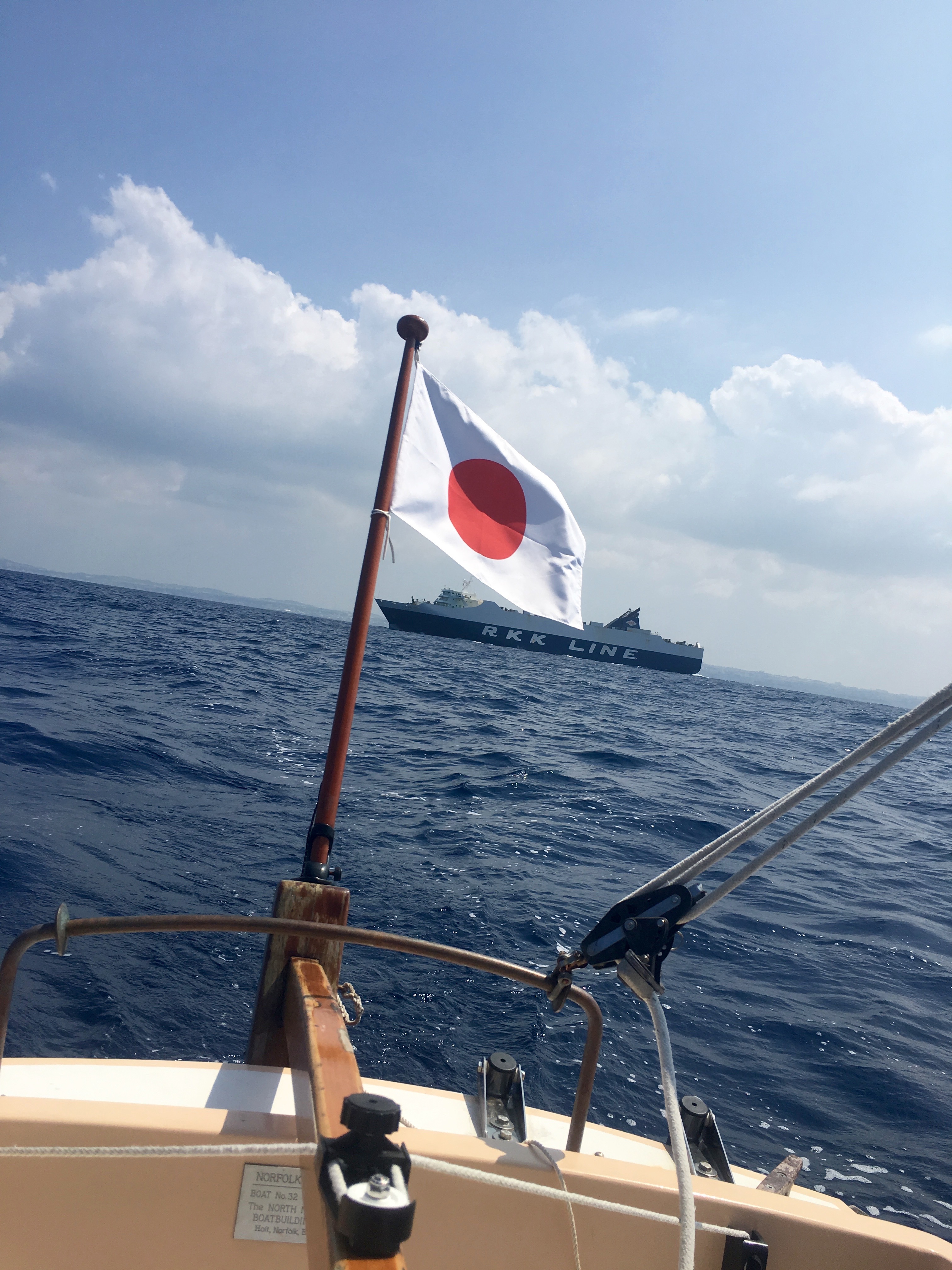 On the way out the wind is light but all the same we manage a steady 3 knots. There are quite big swells but the Norfolk Gypsy is in no way concerned. The only things that concern me are the huge cargo ships and ferries that thunder up and down the main shipping lane off Okinawa.
