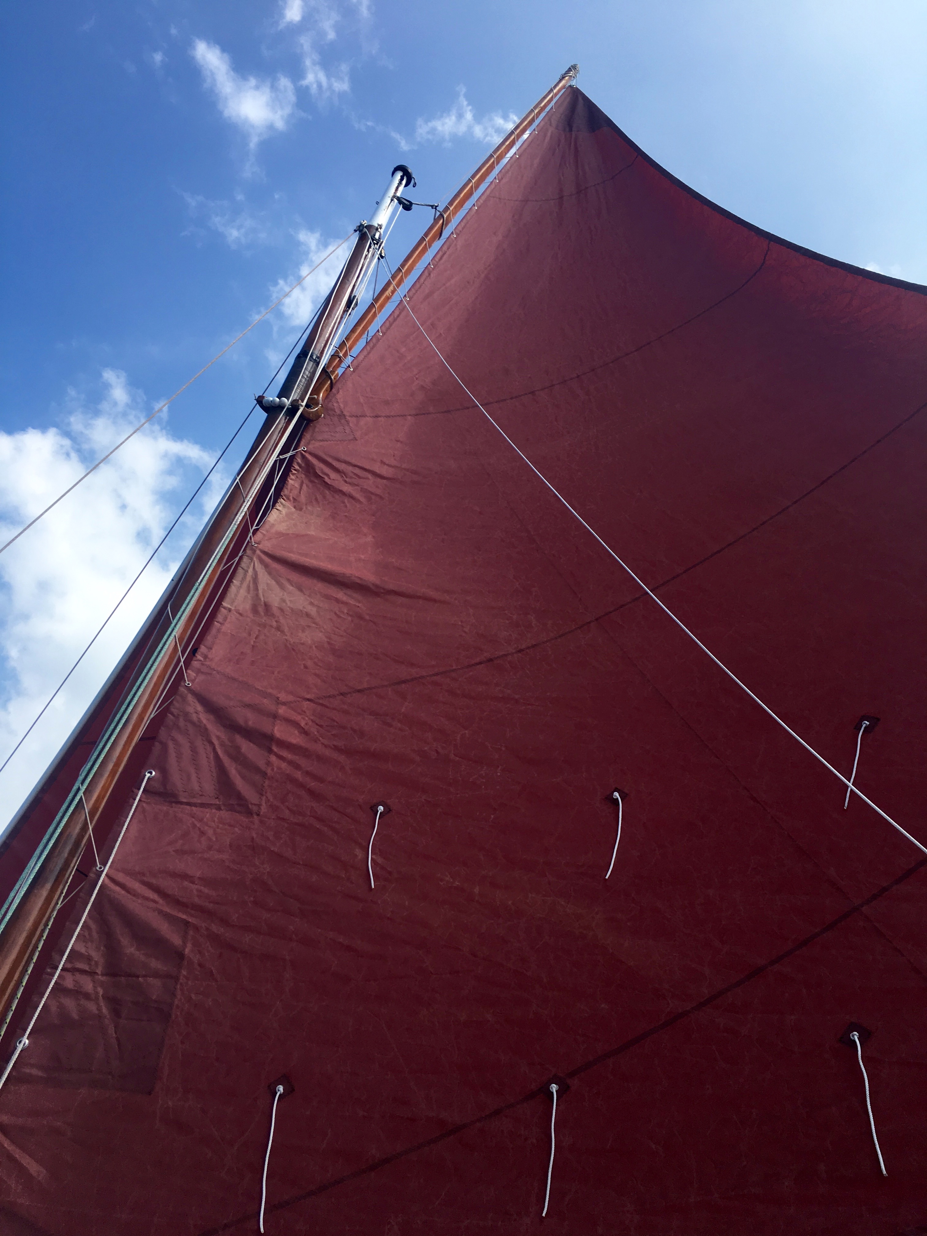 I went sailing with Nick from New Zealand who is professional boat racer. He reckons that on gaffers it is never worth having the boom further over than the stern quarter when beating. I don’t know if he is right. I remember the Shrimper had an adjustable traveller which must be there for some reason.